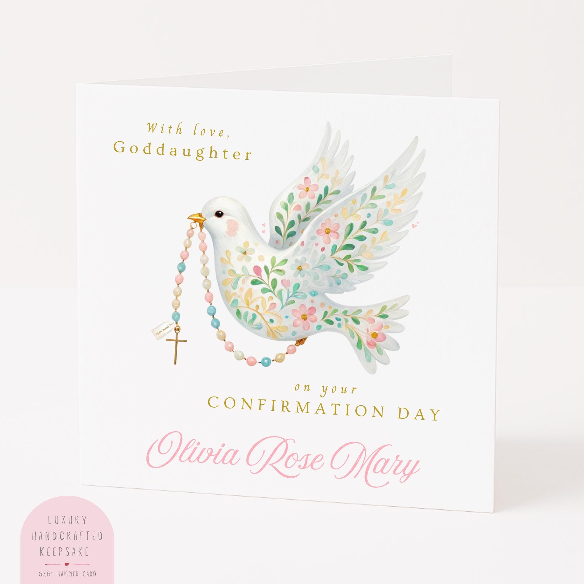Confirmation Card for Goddaughter, a personalised religious keepsake card featuring a soft watercolour dove and rosary design. Thoughtfully illustrated and made with love, this Confirmation card is created to celebrate a special faith milestone and become a cherished keepsake for years to come.