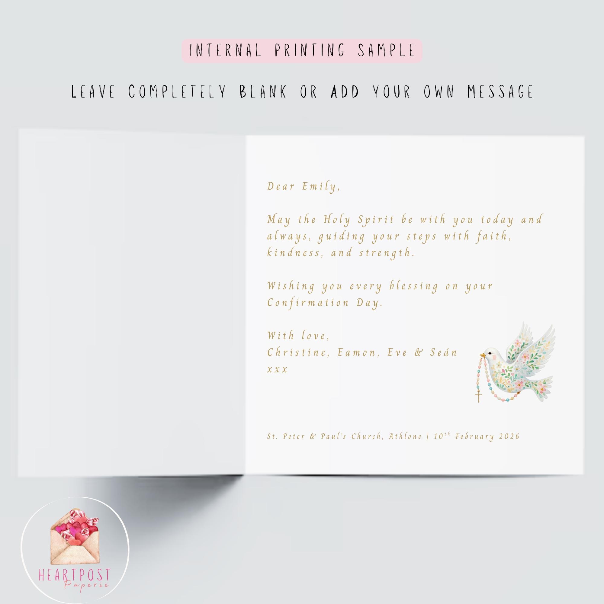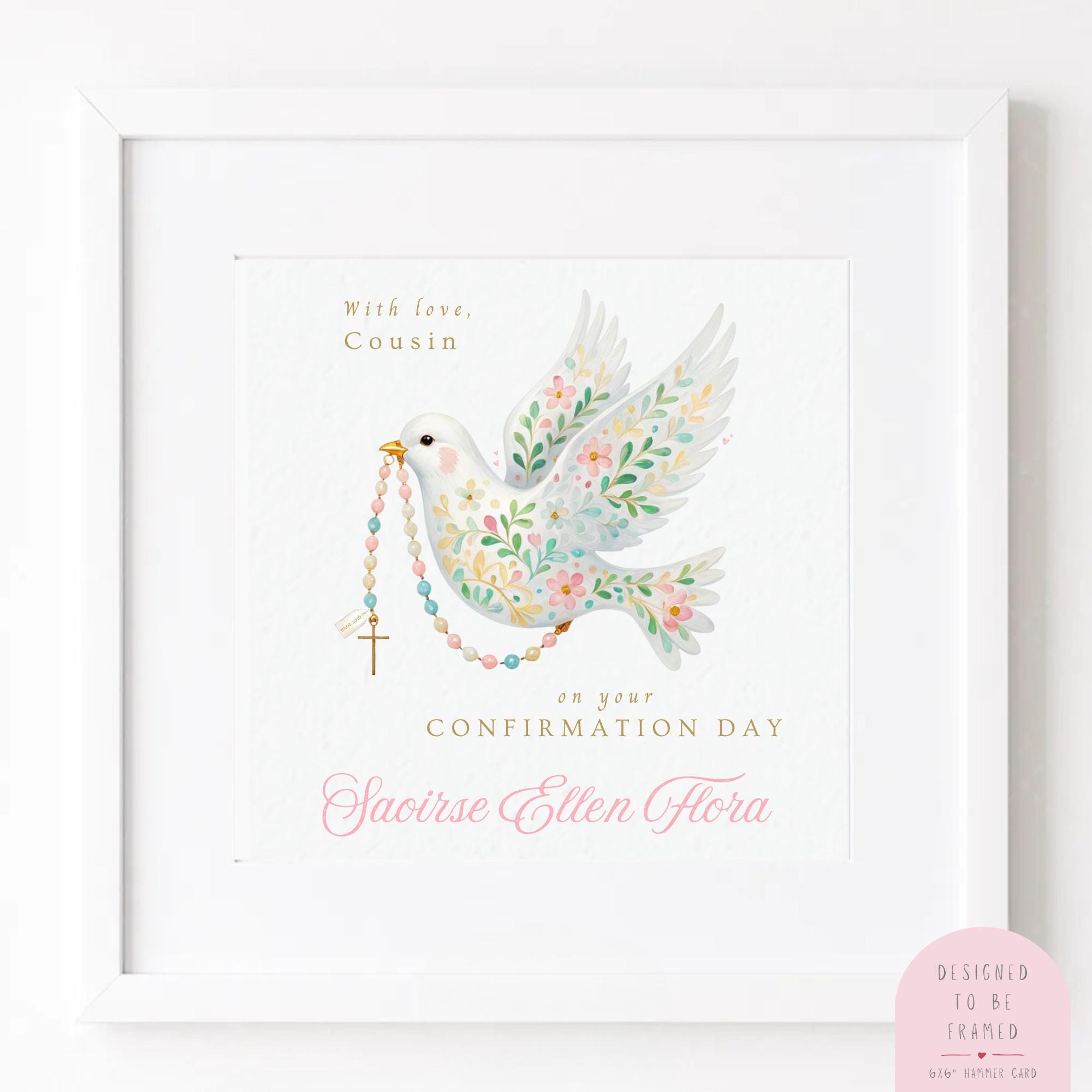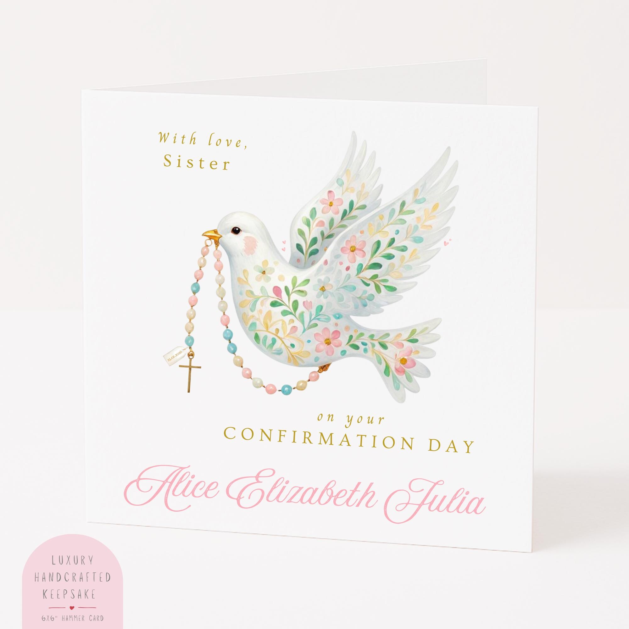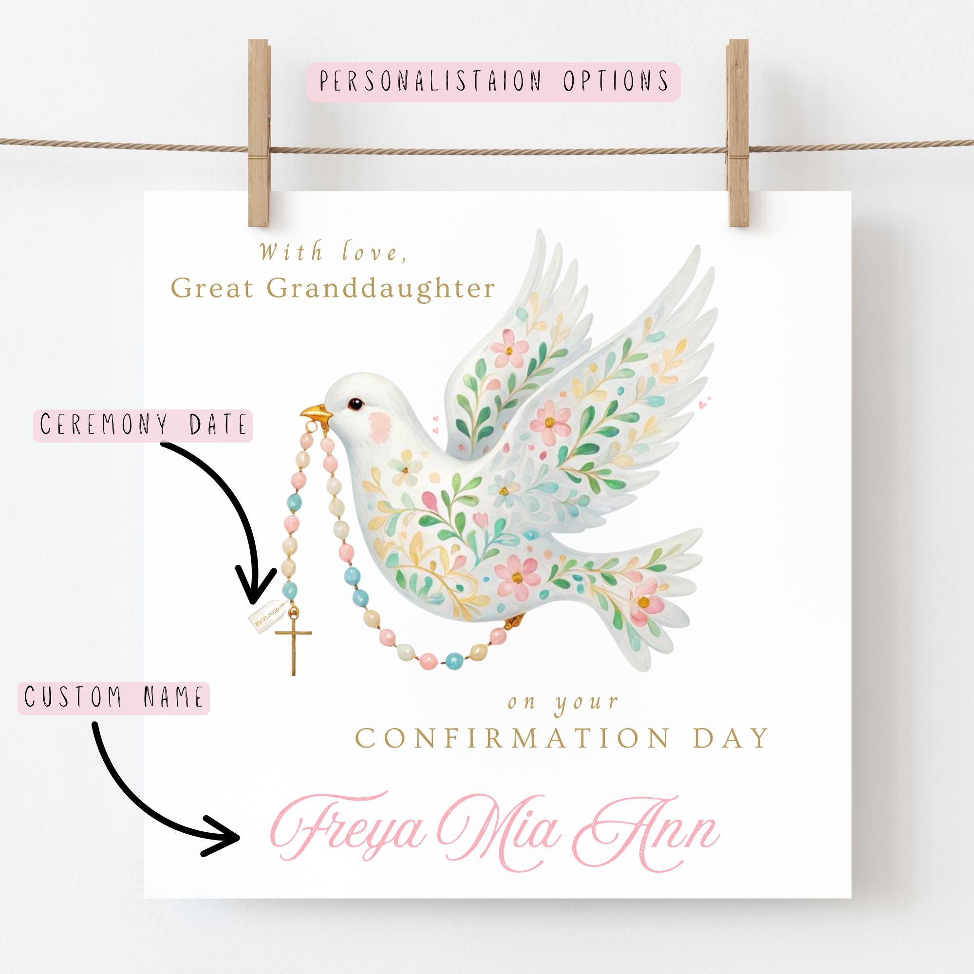 Confirmation Card for Girl, a personalised religious keepsake card featuring a soft watercolour dove and rosary design. Thoughtfully illustrated and made with care, this Confirmation card is designed to celebrate a special faith milestone and become a cherished keepsake for years to come.