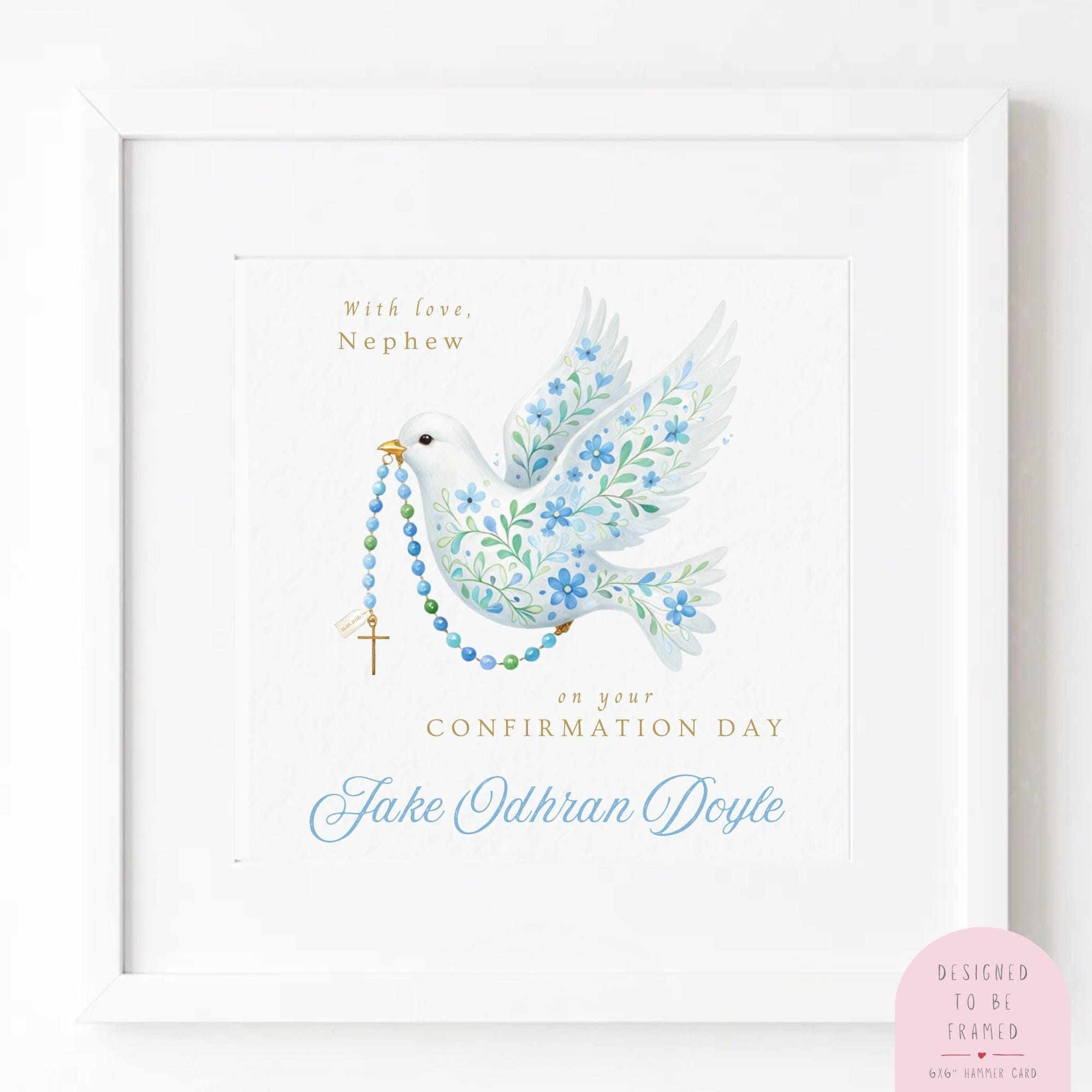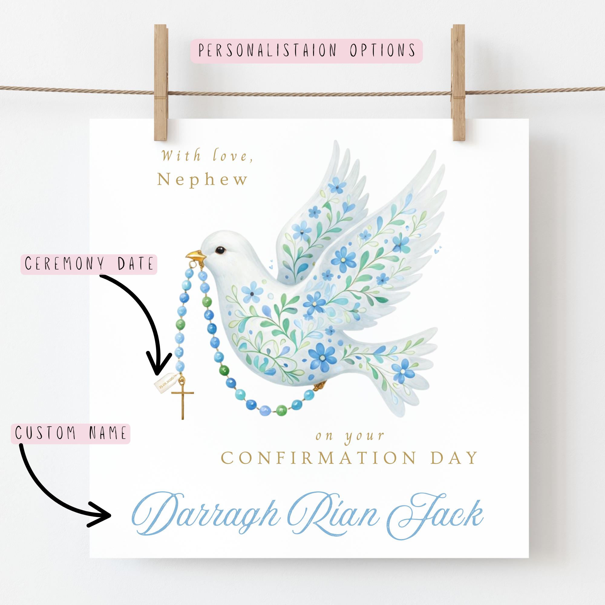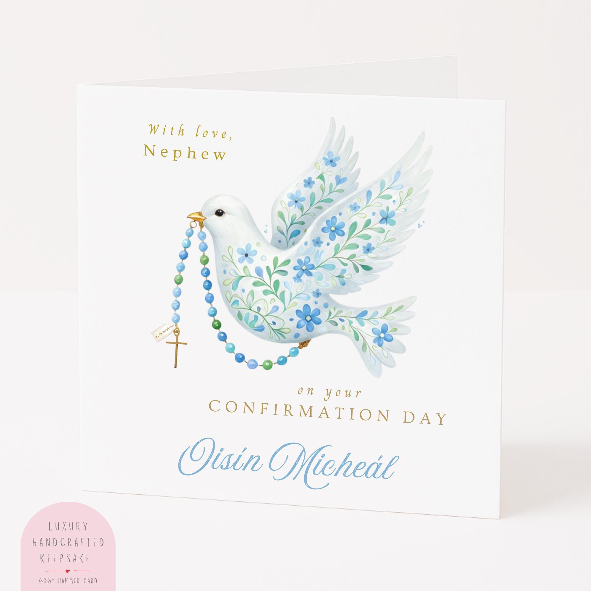A personalised Confirmation card for nephew, this religious keepsake card features a soft watercolour dove and rosary design, created to celebrate a Catholic Confirmation Day in a meaningful and timeless way. Thoughtfully illustrated and made with love, this Confirmation card for a nephew is designed to honour an important faith milestone and become a cherished keepsake for years to come.