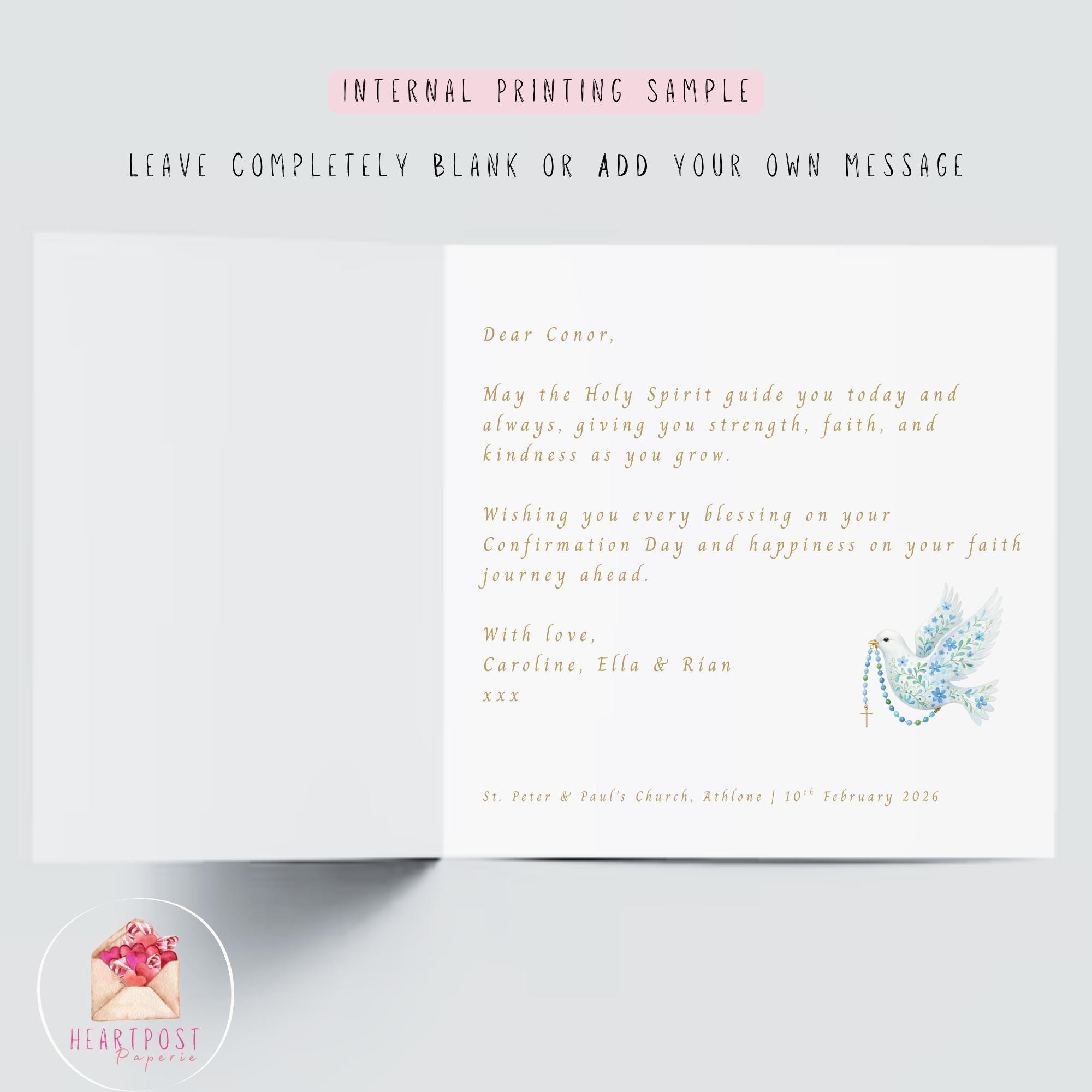 ✨ This personalised Confirmation card for a boy with a custom front message is designed to celebrate faith, love, and family. It is a thoughtful Catholic Confirmation keepsake for anyone who wishes to mark the day with something personal, heartfelt, and lasting.
