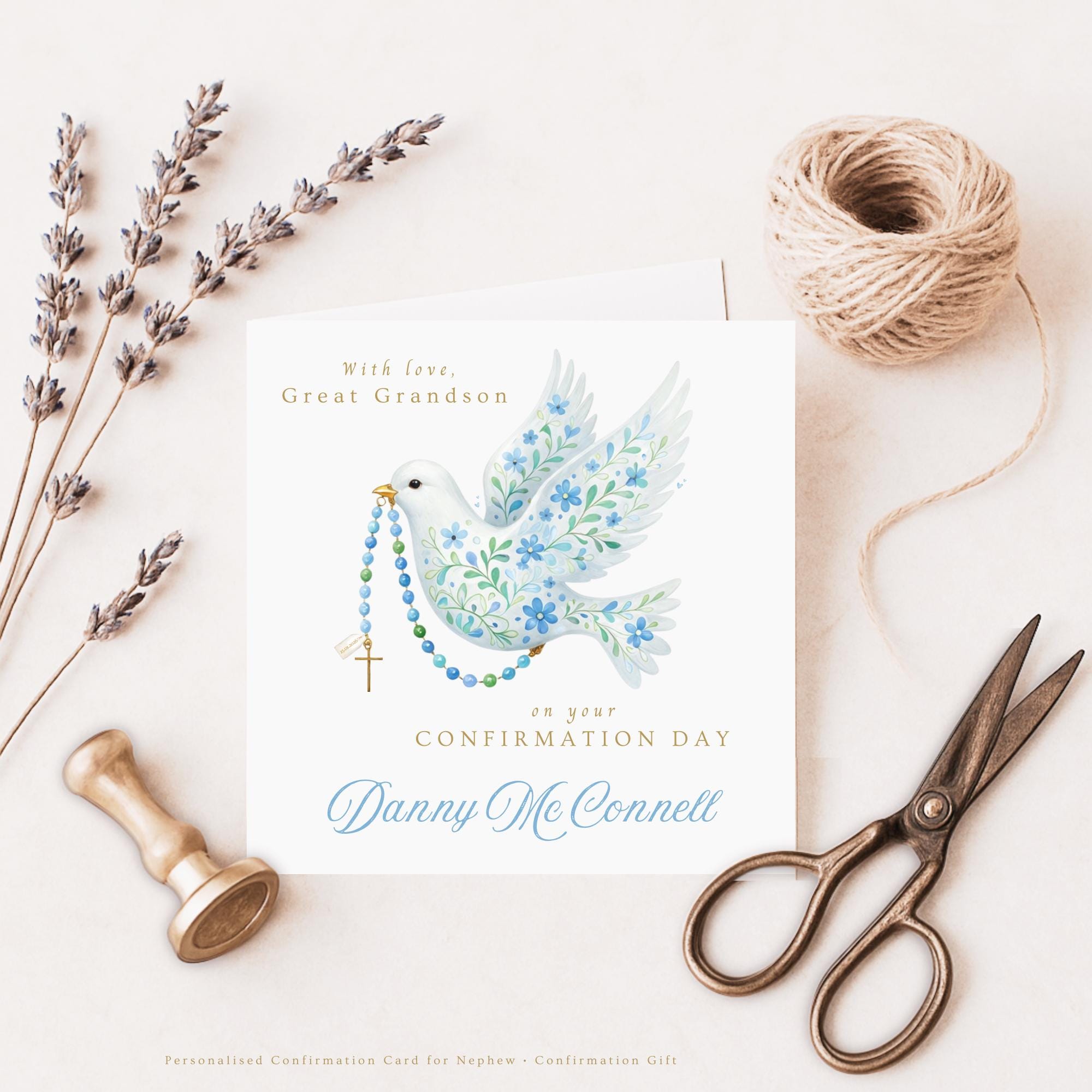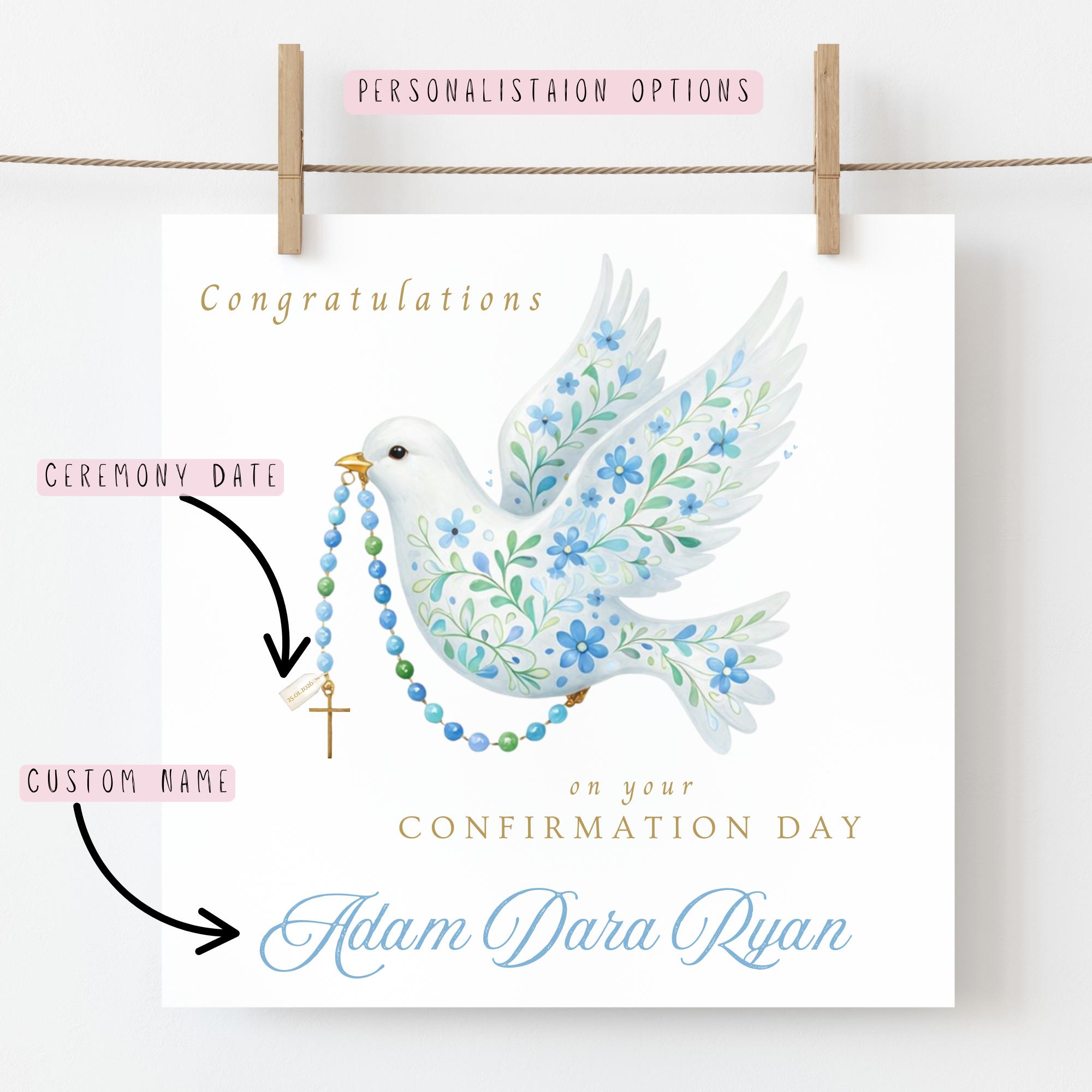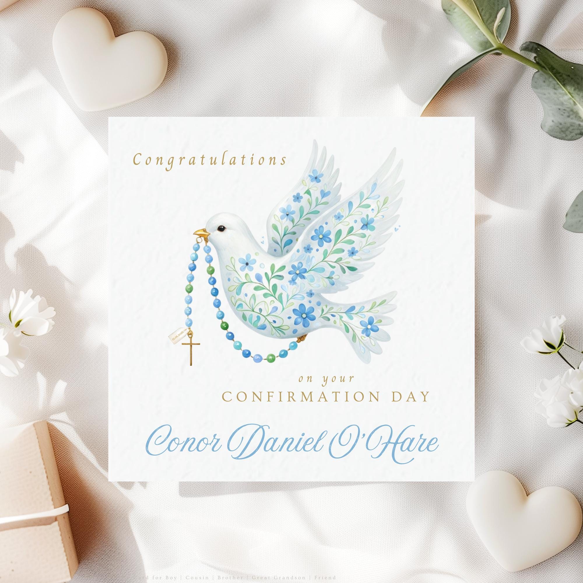 A personalised Confirmation card for a boy, this religious keepsake card features a soft watercolour dove and rosary design, created to celebrate a Catholic Confirmation Day in a meaningful and timeless way. Thoughtfully illustrated and made with love, this Confirmation card for a boy is designed to honour an important faith milestone and become a cherished keepsake for years to come.