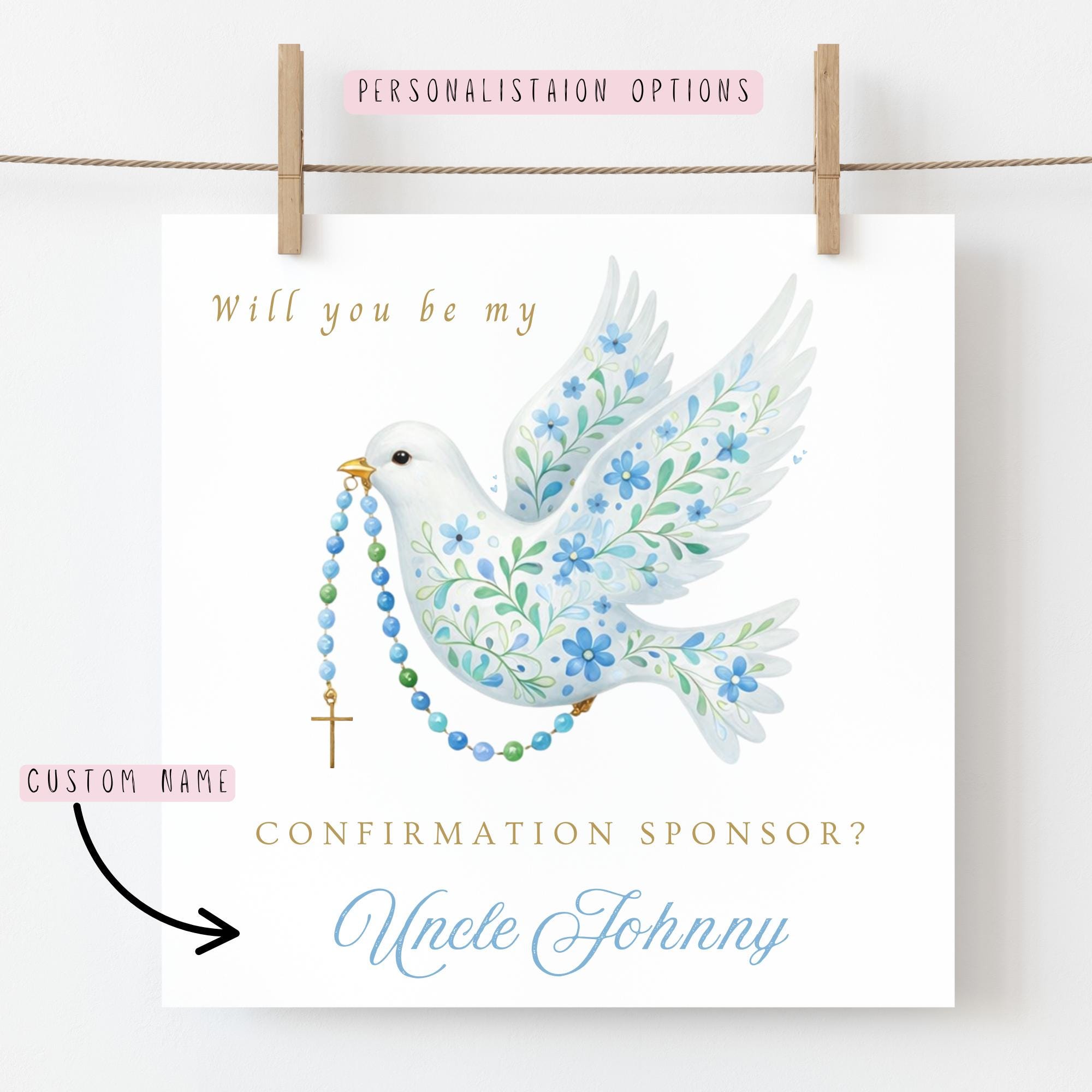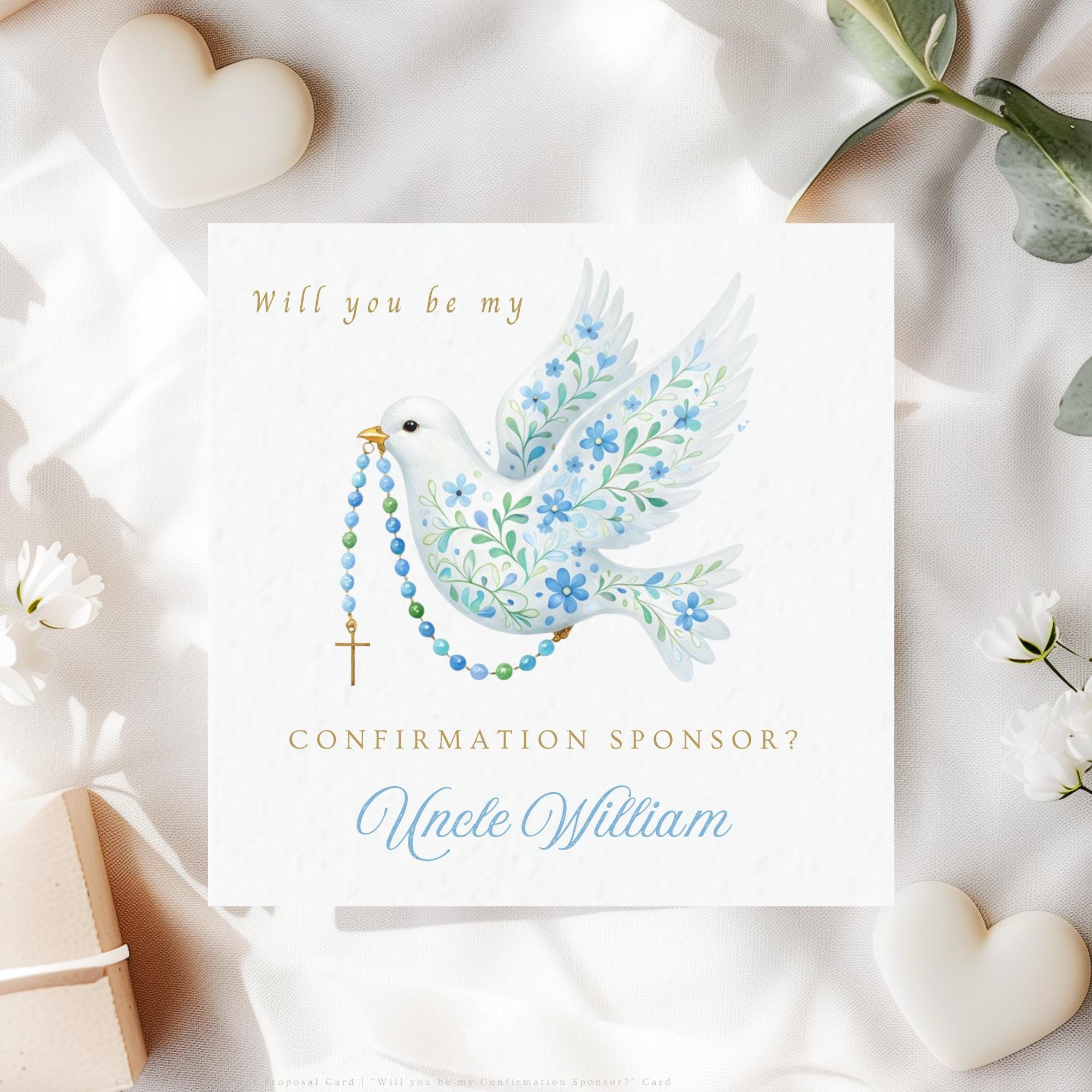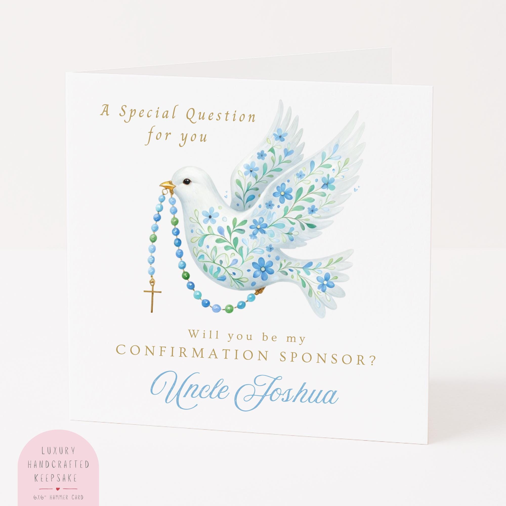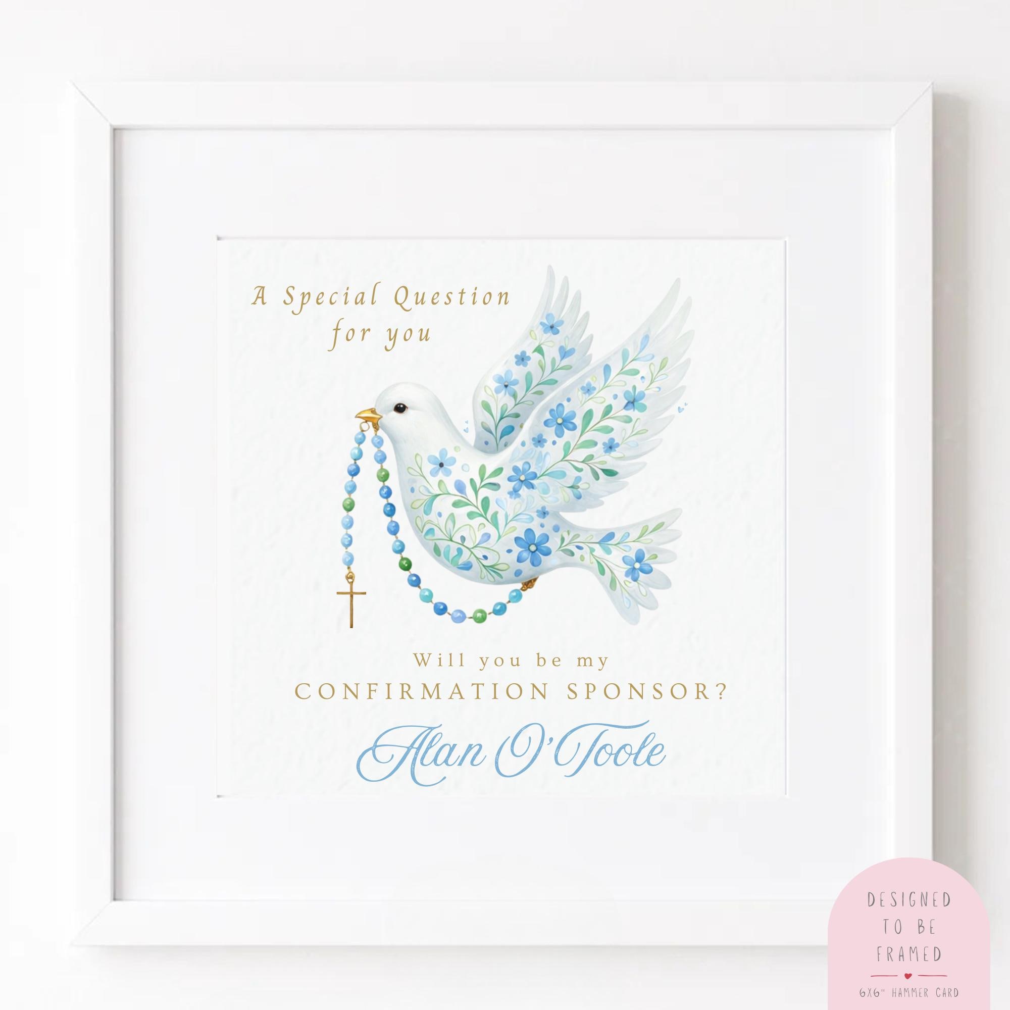 A personalised “Will you be my Confirmation Sponsor?” card for a boy, this religious keepsake card features a soft watercolour dove and rosary design in gentle blue tones, created to ask a special Confirmation sponsor in a meaningful and timeless way. Thoughtfully illustrated and made with love, this Catholic Confirmation sponsor card for a boy is designed to mark an important faith moment and become a cherished keepsake for years to come.