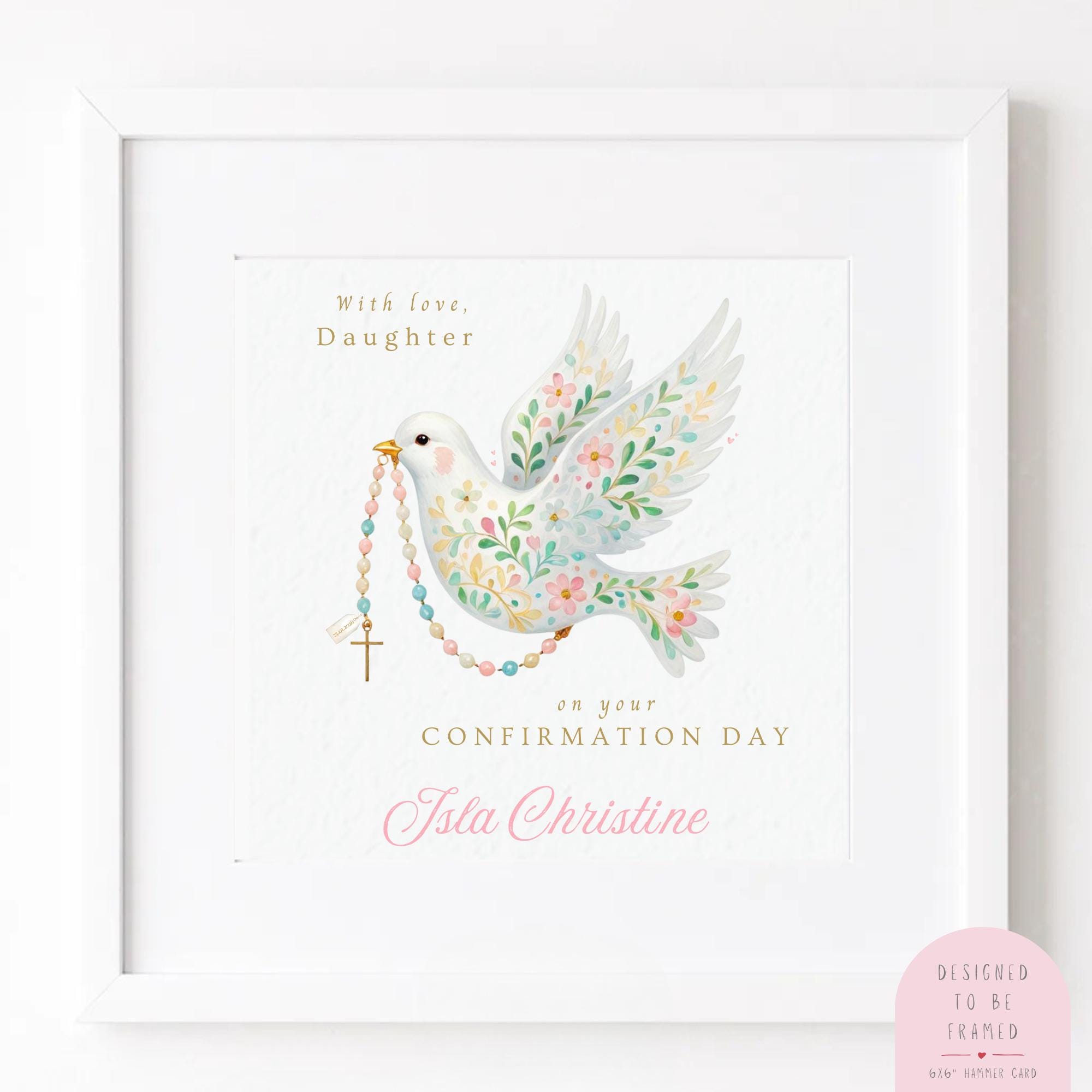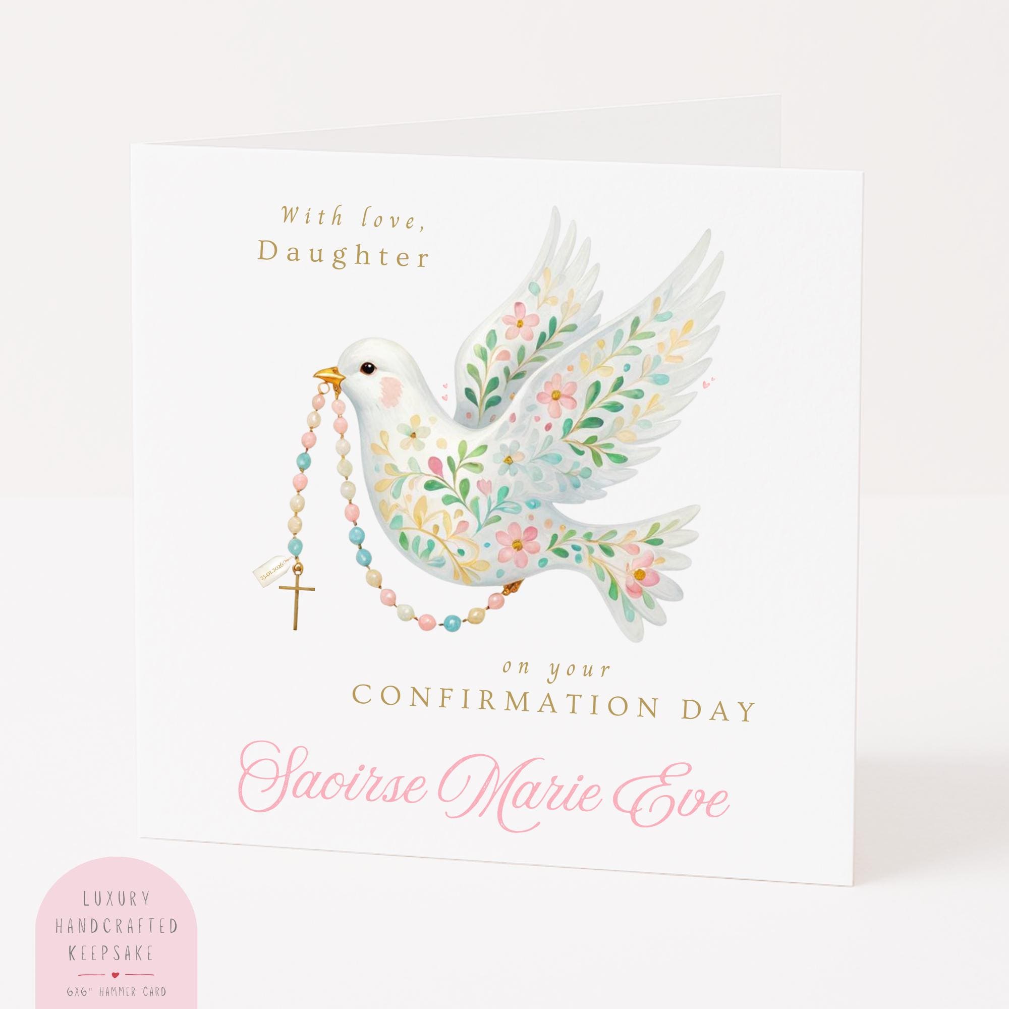 Confirmation Card for Daughter, a personalised religious keepsake card featuring a soft watercolour dove and rosary design. Thoughtfully illustrated and made with love, this Confirmation card is created to celebrate a special faith milestone and become a cherished keepsake for years to come.