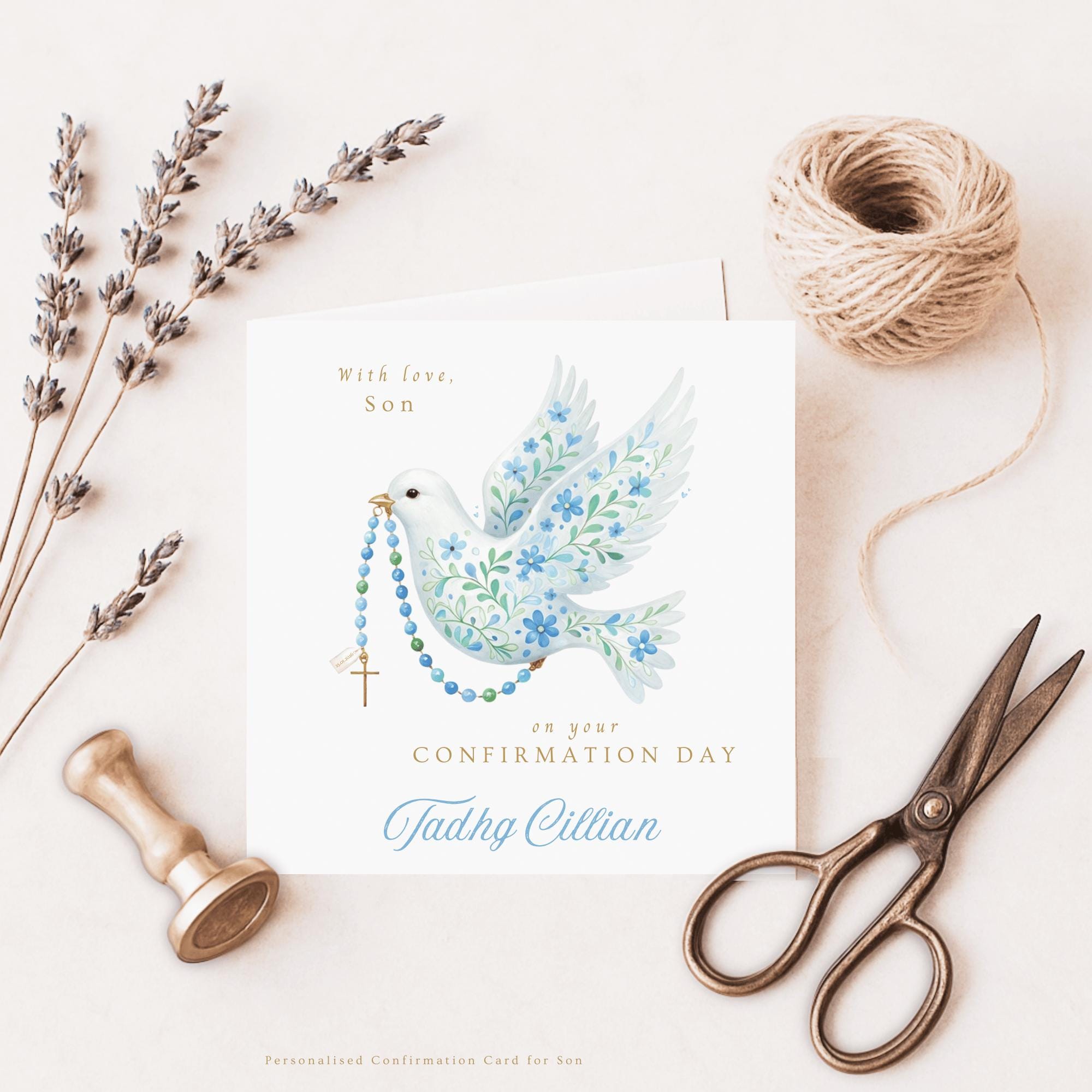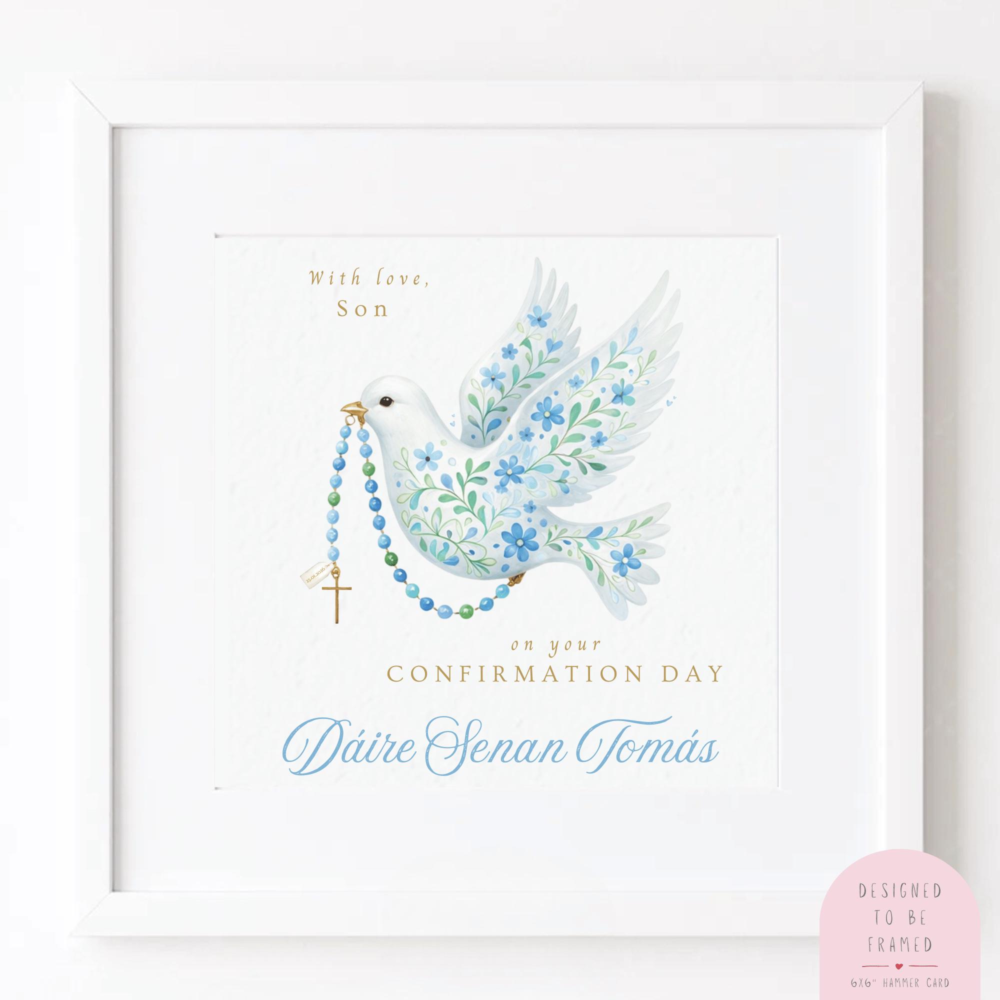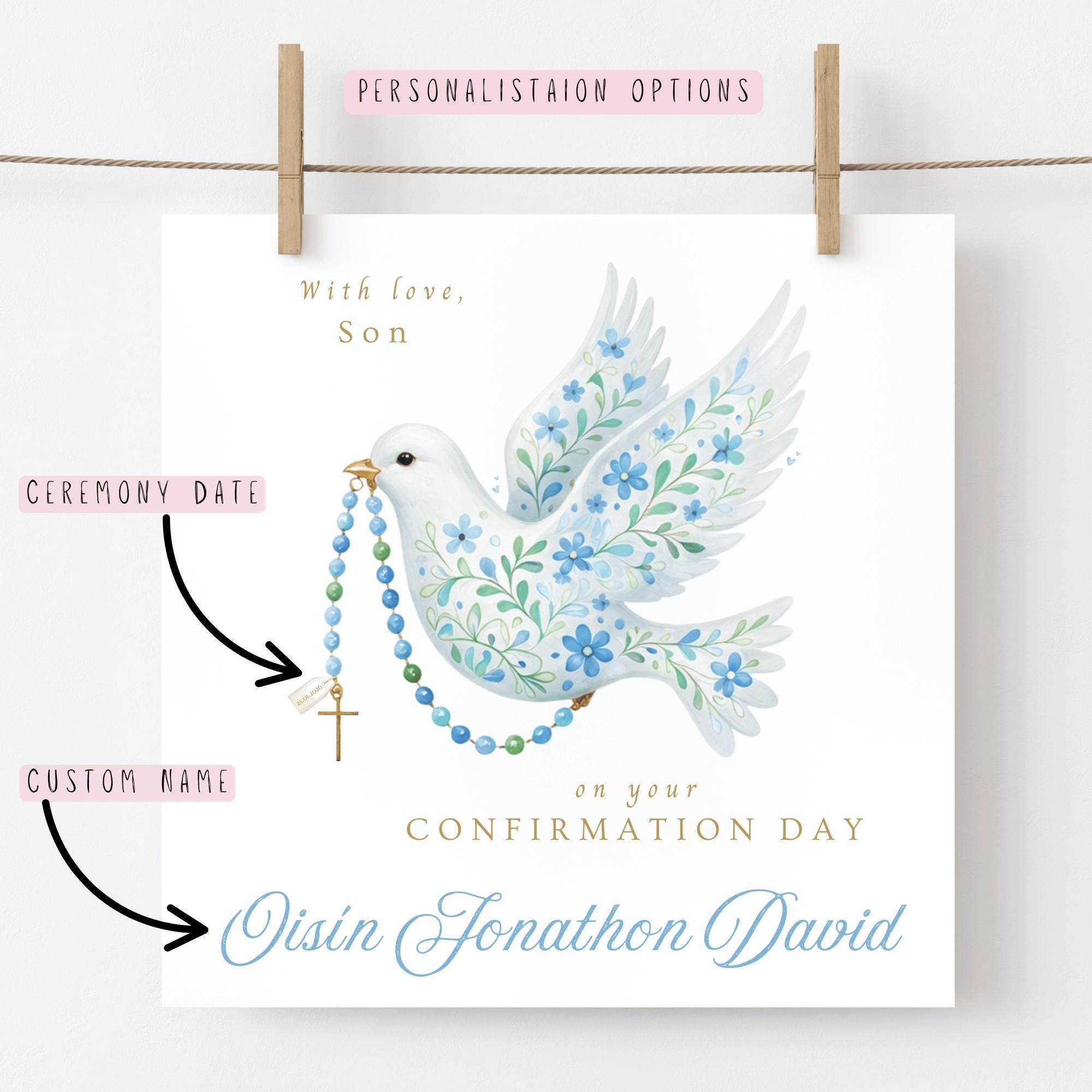 Confirmation Card for Son, a personalised religious keepsake card featuring a soft watercolour dove and rosary design. Thoughtfully illustrated and made with love, this Confirmation card is created to celebrate a special faith milestone and become a cherished keepsake for years to come.