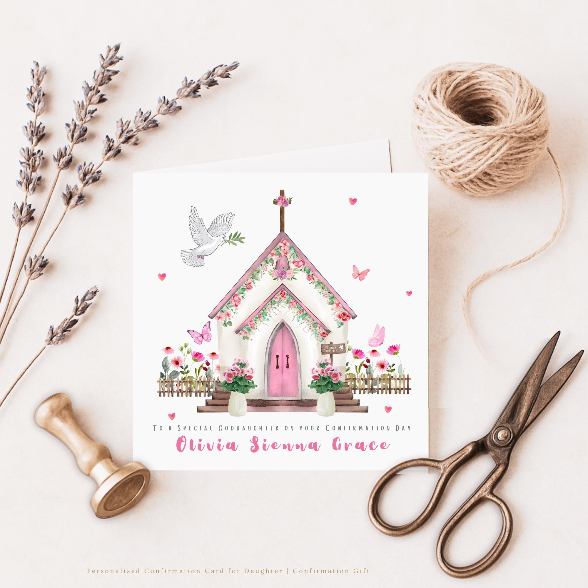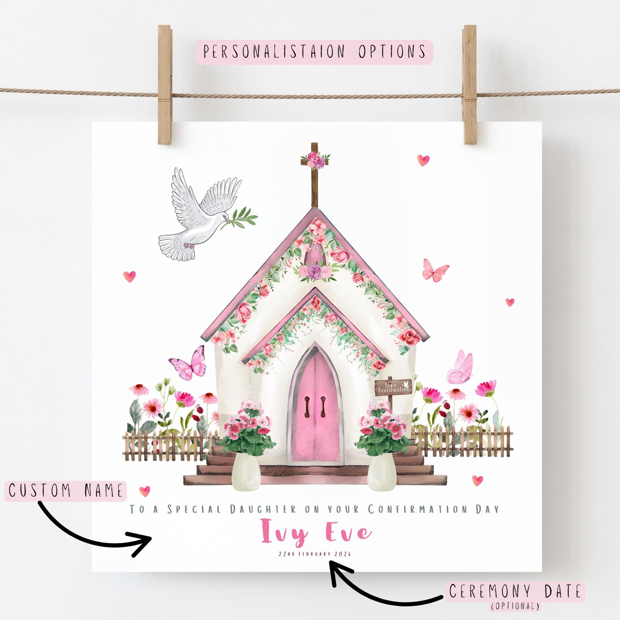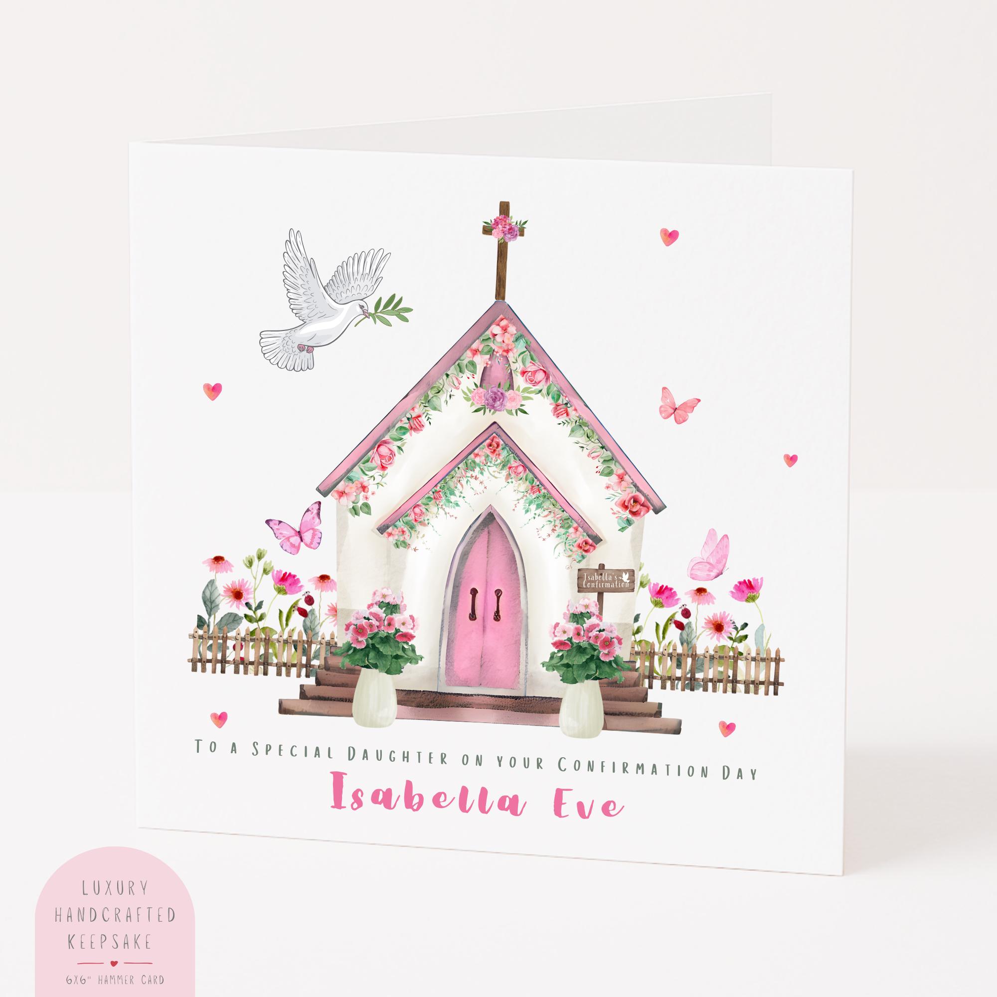 A personalised Confirmation card for a daughter, this elegant Catholic Confirmation keepsake card features a soft watercolour floral church illustration with dove and delicate pink details, thoughtfully designed to celebrate a special Confirmation Day in a meaningful and timeless way. Created to honour a beautiful faith milestone, this daughter Confirmation card is a heartfelt keepsake she can treasure for years to come.