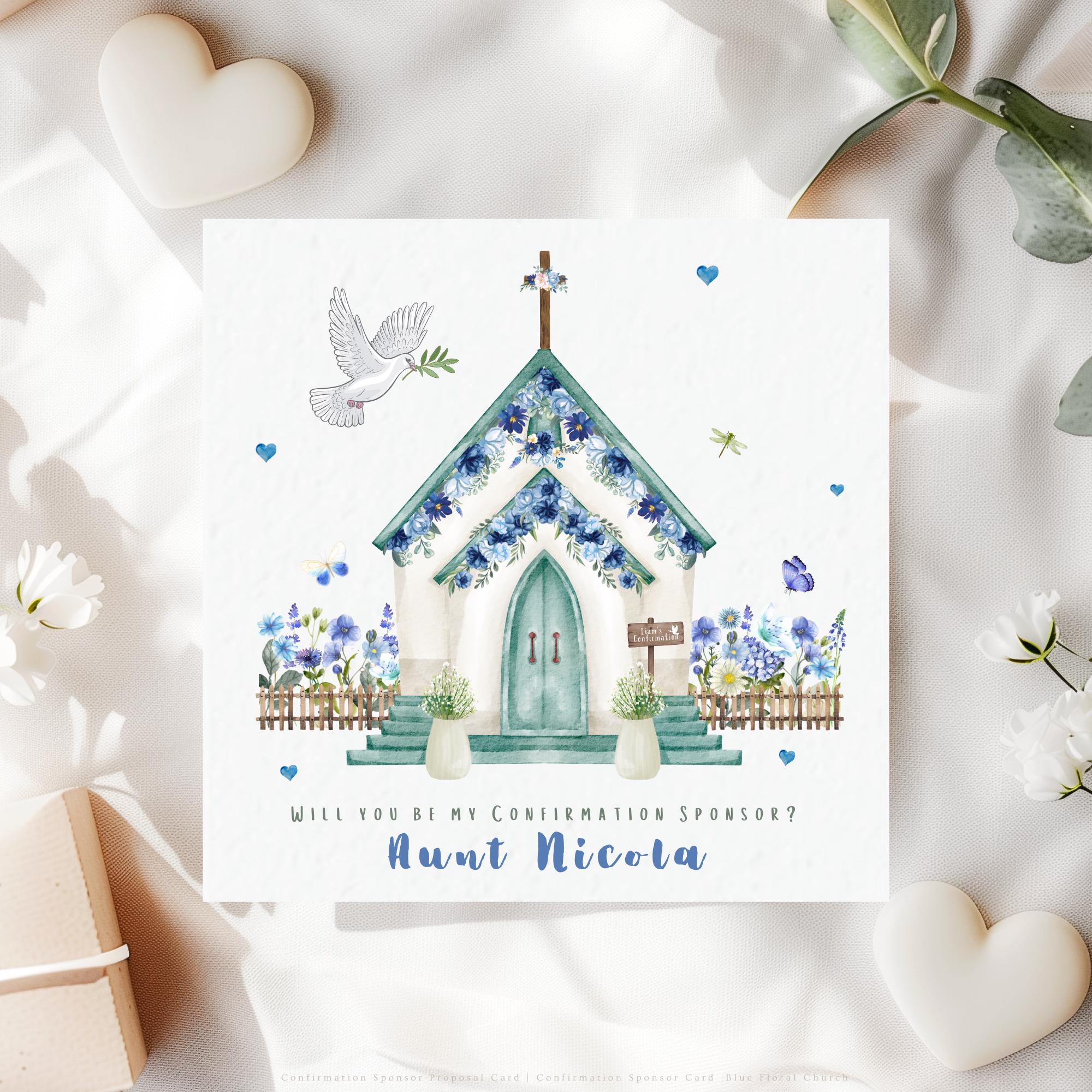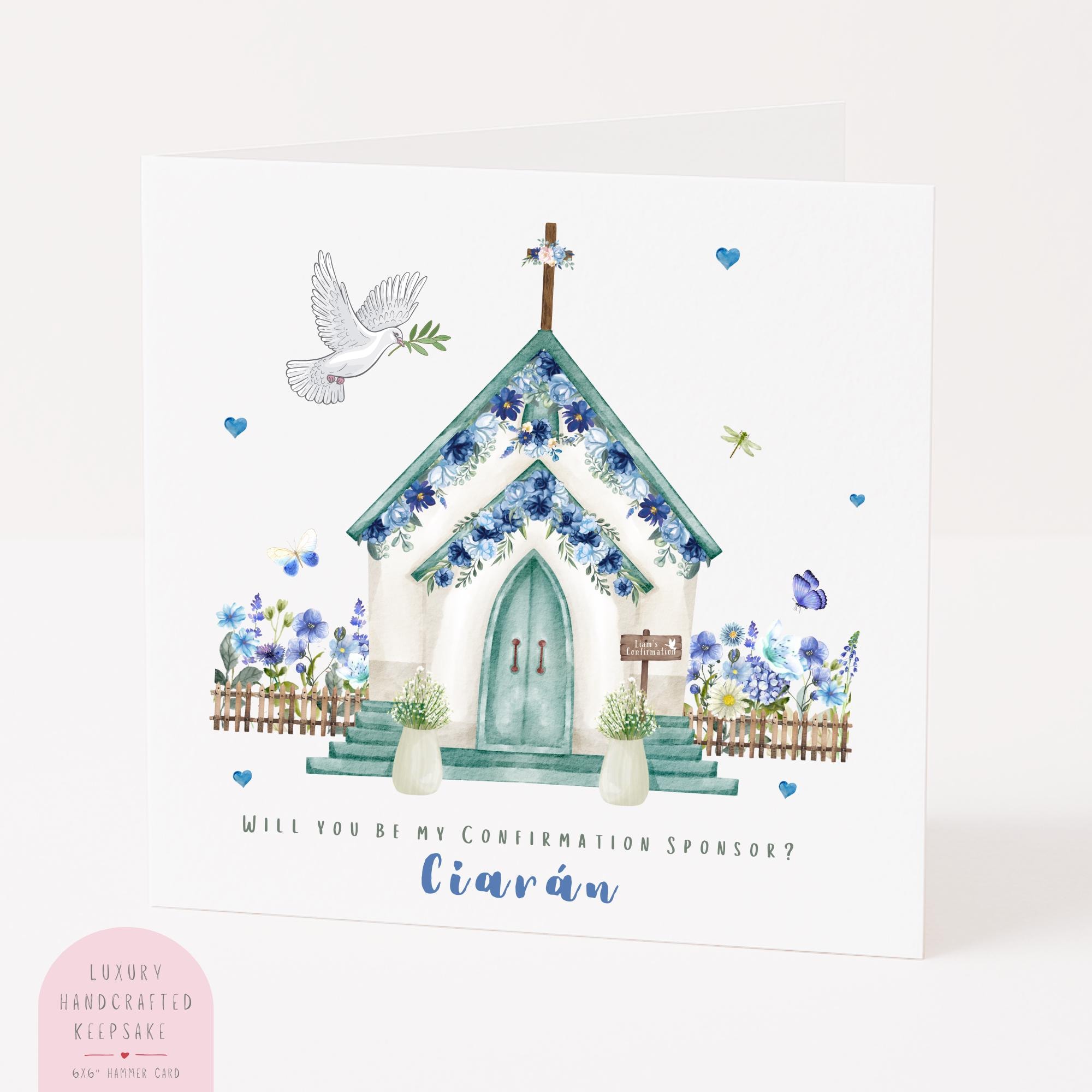 This handmade Confirmation sponsor thank you card from a boy is personalised with the sponsor’s name on the front, making it a meaningful and elegant way for a child to thank their chosen sponsor, godparent, aunt, uncle, or family friend. Designed in soft blue and green pastel tones with delicate floral details, it is a timeless Catholic keepsake that reflects gratitude, faith, and connection.