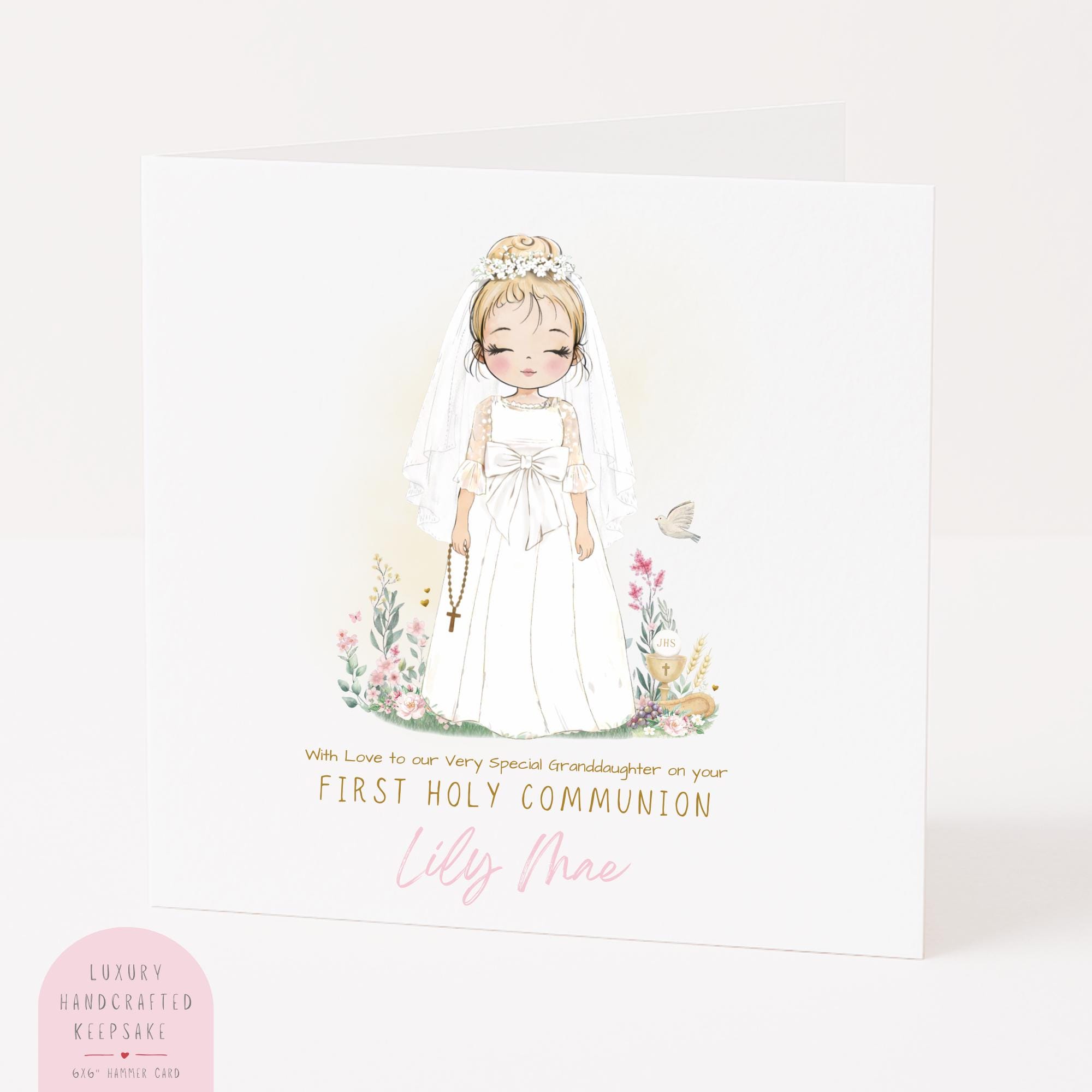 This handmade First Holy Communion card is ideal for a very special or beautiful granddaughter and has been created to reflect faith, love, and family tradition. Printed on luxury hammered cardstock, it is designed to be kept, framed, or stored as a lasting memory of her Communion Day.