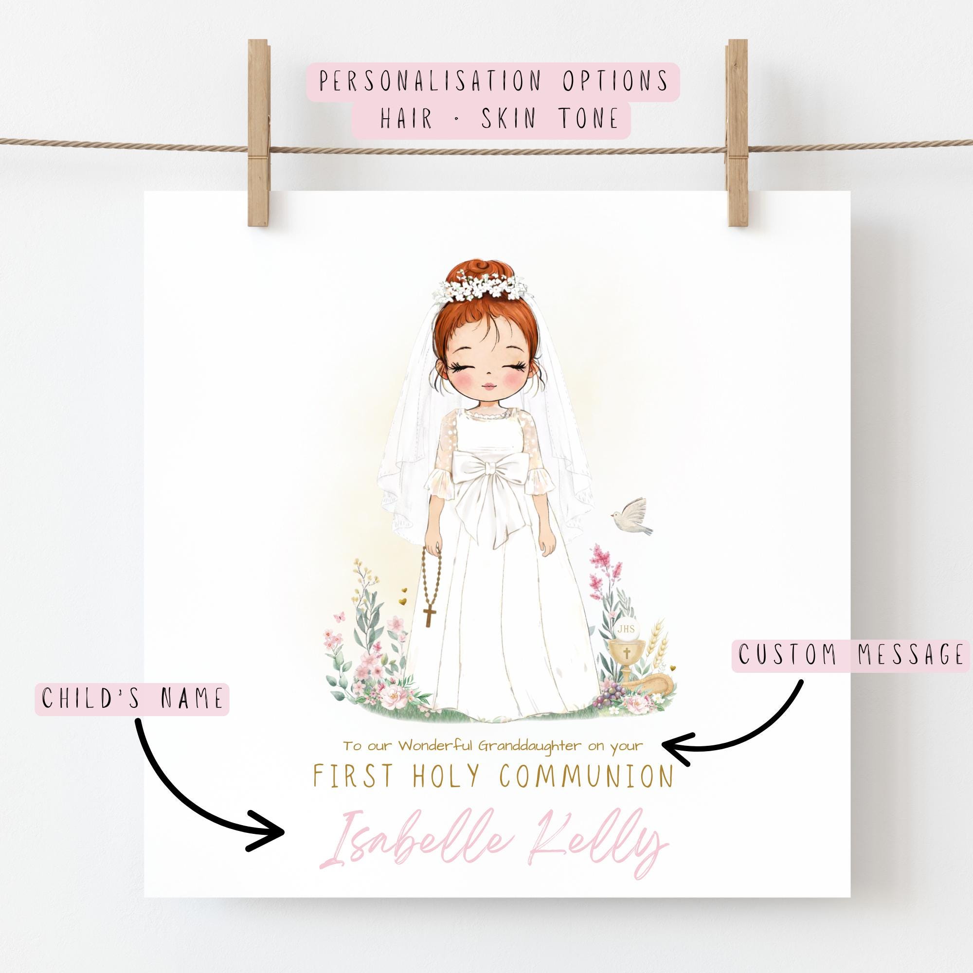 A personalised First Holy Communion card for a granddaughter, beautifully illustrated in soft watercolour and customisable with hair colour and skin tone. A meaningful Catholic keepsake to celebrate her special Communion Day.