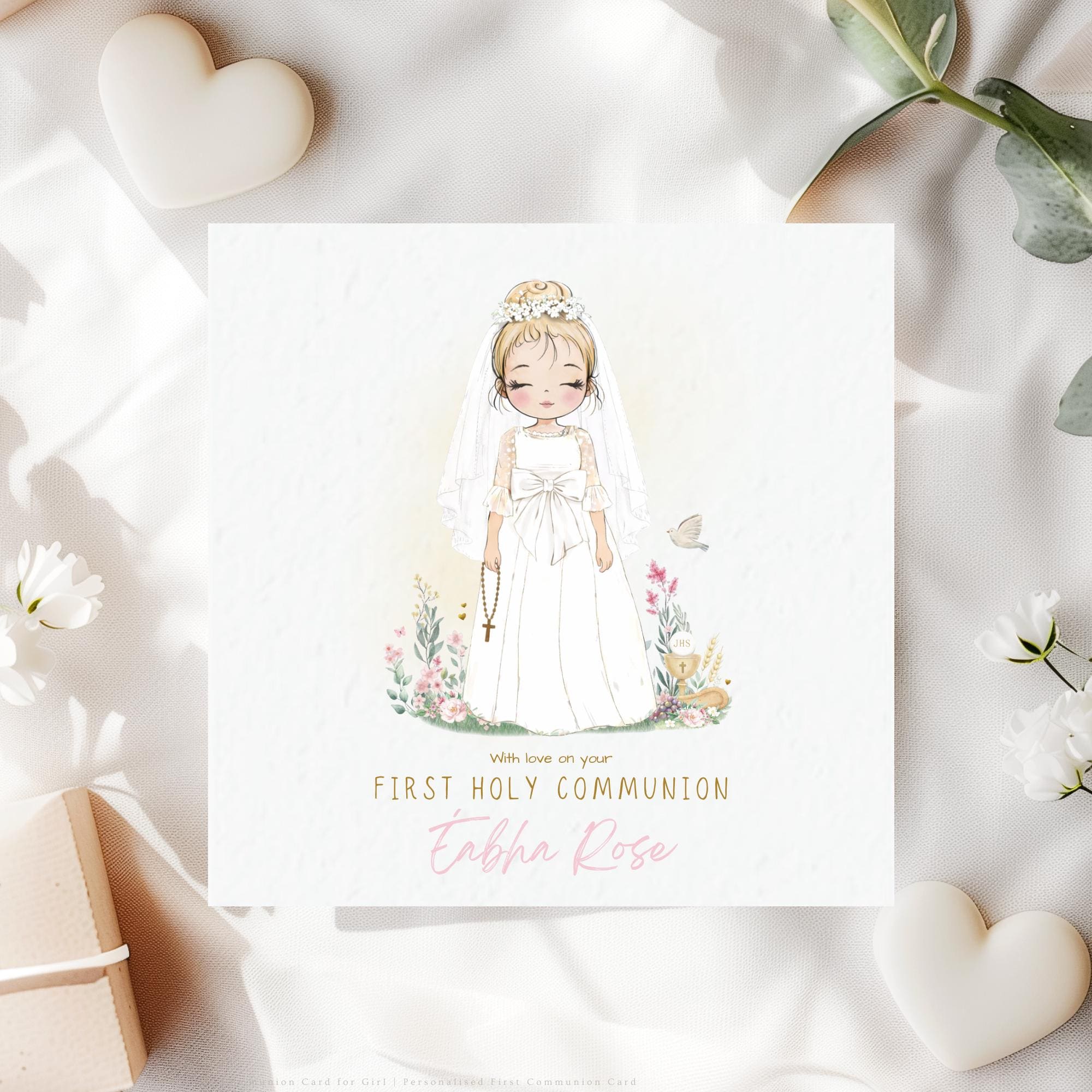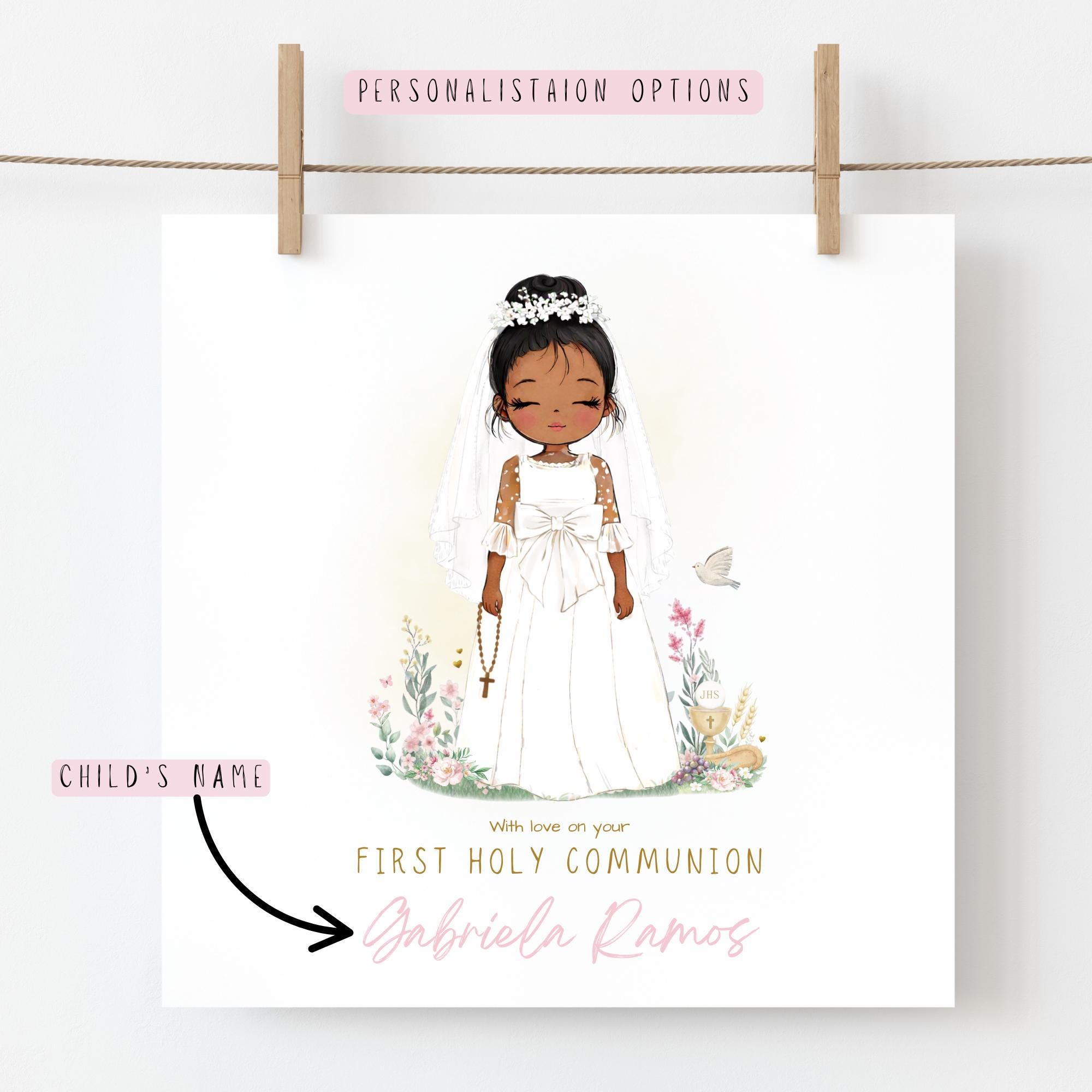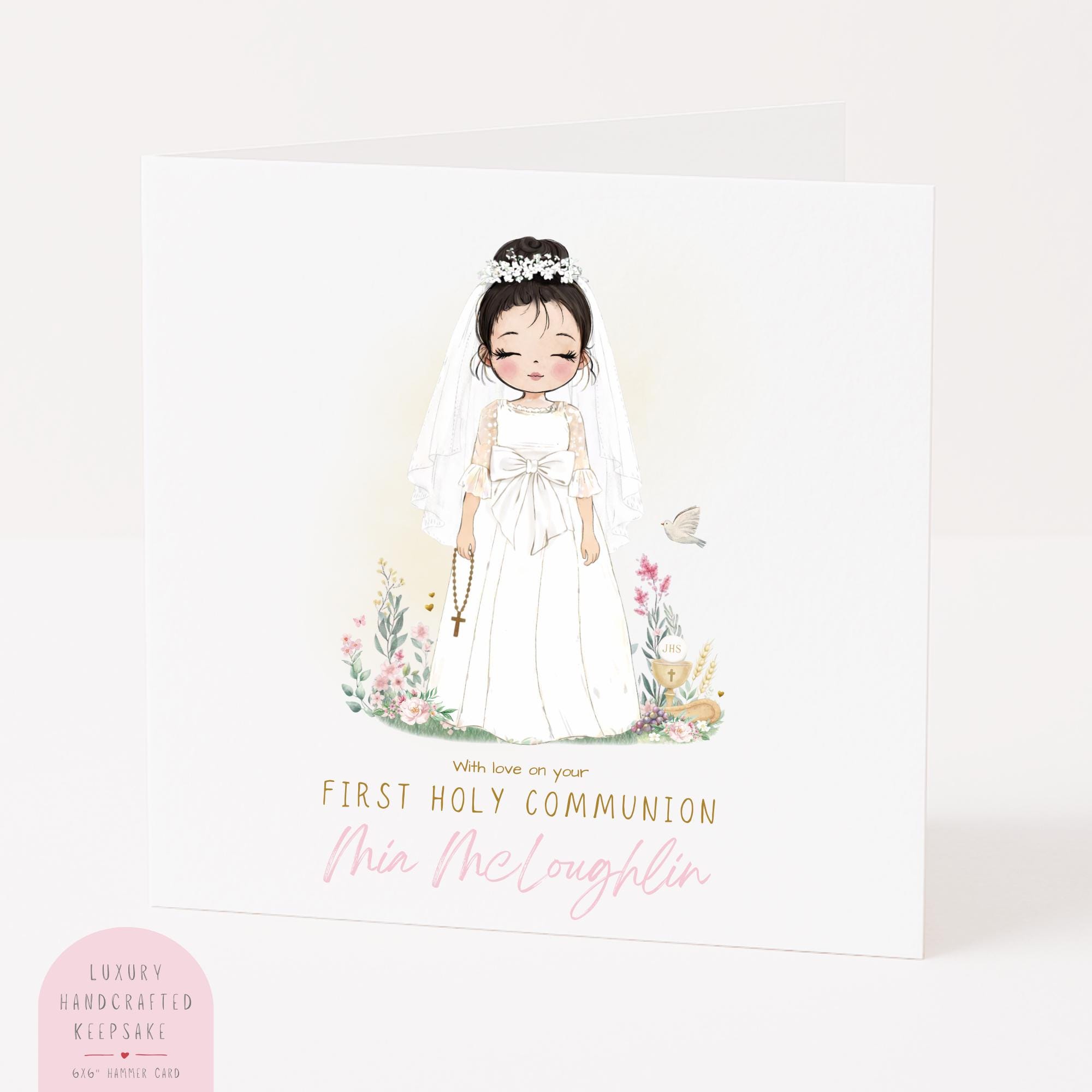 A personalised First Holy Communion card for a girl, beautifully illustrated in soft watercolour and customisable with hair colour and skin tone. A meaningful Catholic keepsake to celebrate her special Communion Day.