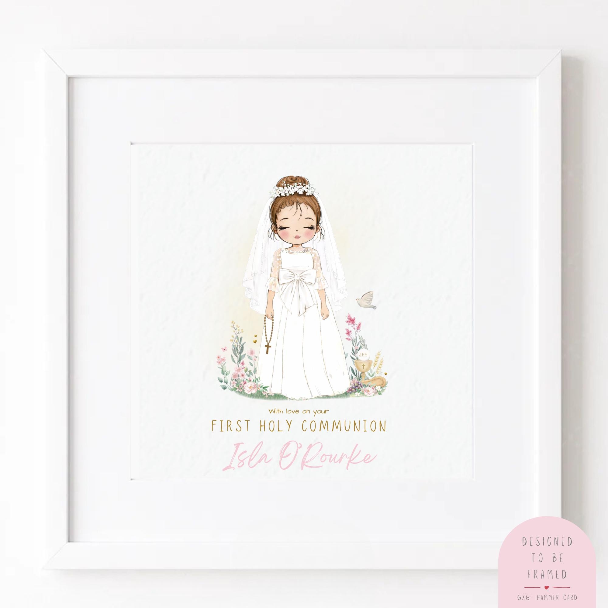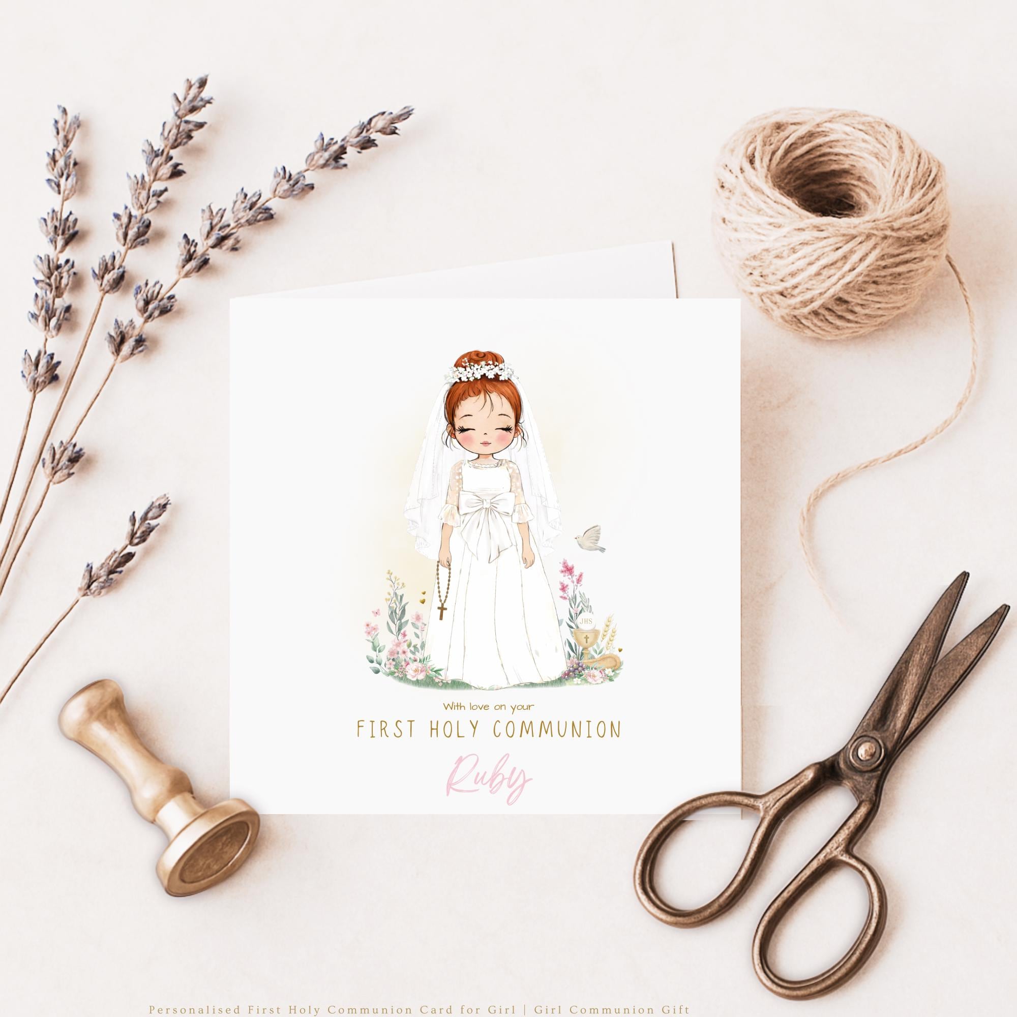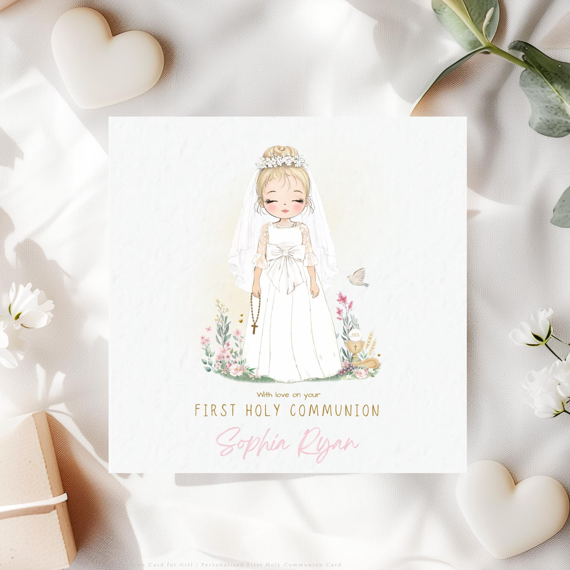 A personalised First Holy Communion card for a girl, beautifully illustrated in soft watercolour and customisable with hair colour and skin tone. A meaningful Catholic keepsake to celebrate her special Communion Day.