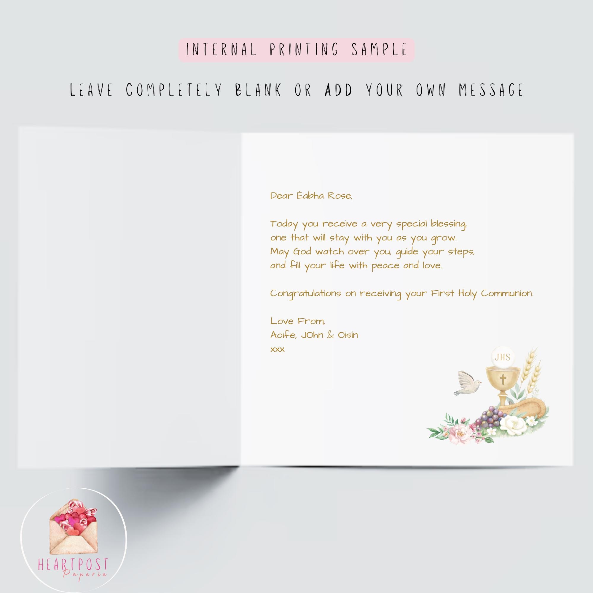 This First Holy Communion card for a girl is designed to celebrate faith, love, and family connections of all kinds. With personalised wording and a timeless illustration, it is a thoughtful keepsake to mark this important milestone in her faith journey.