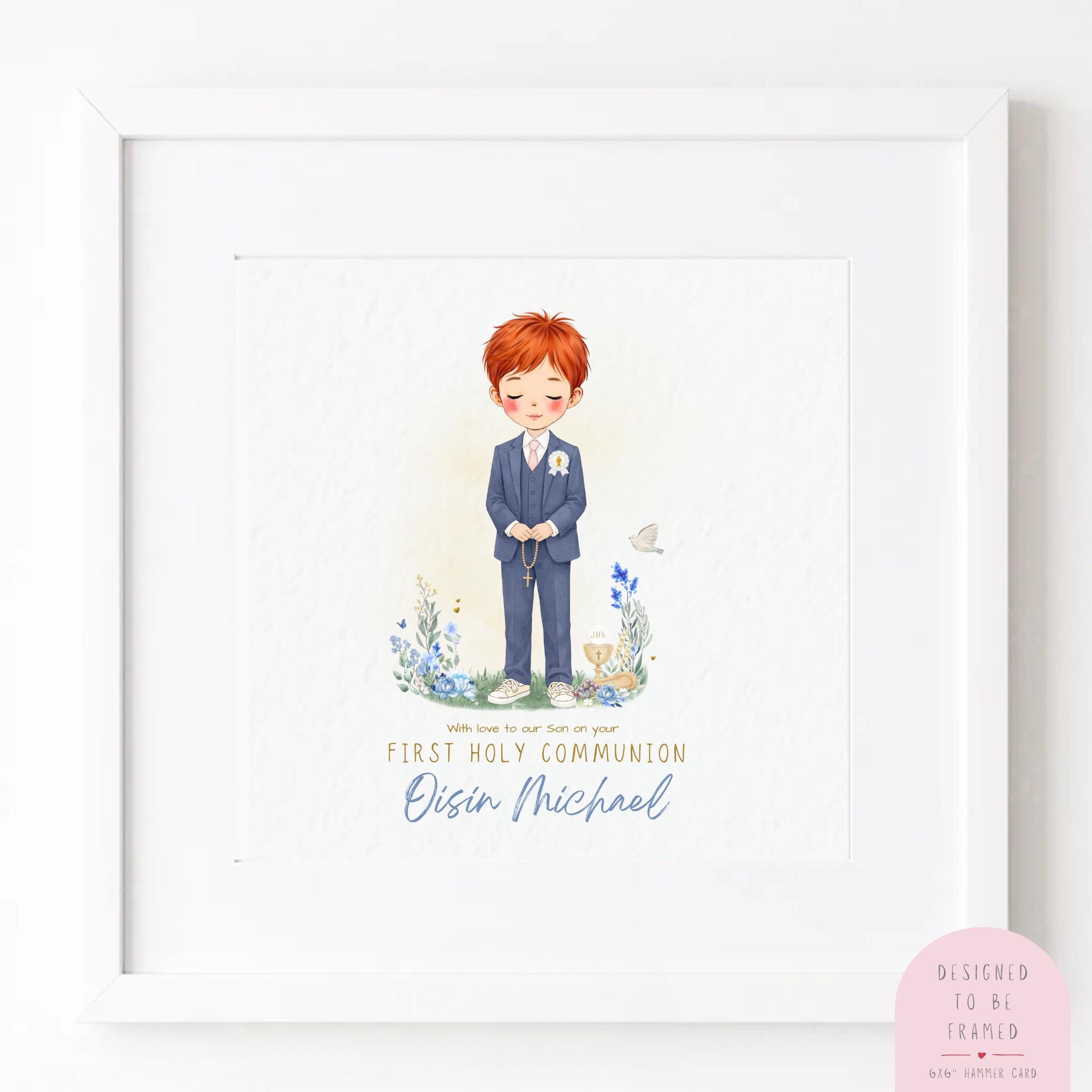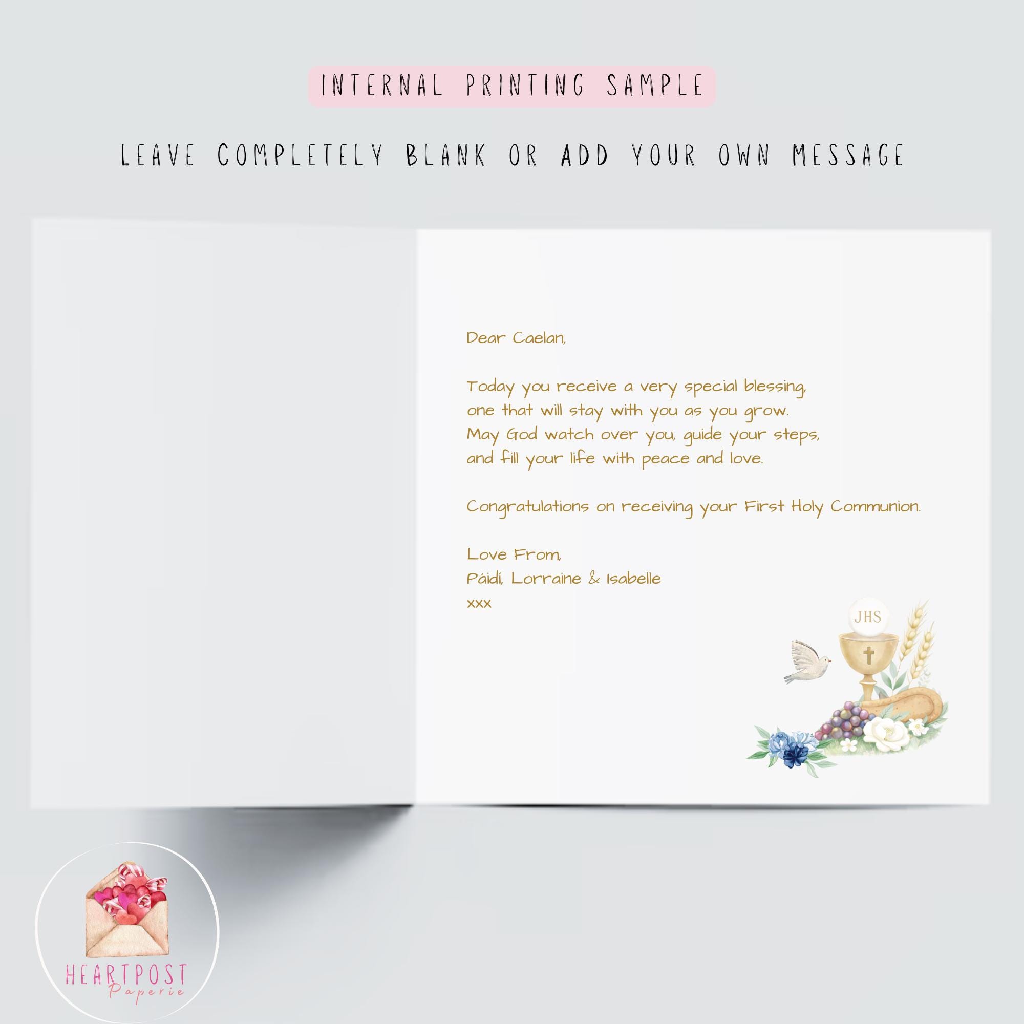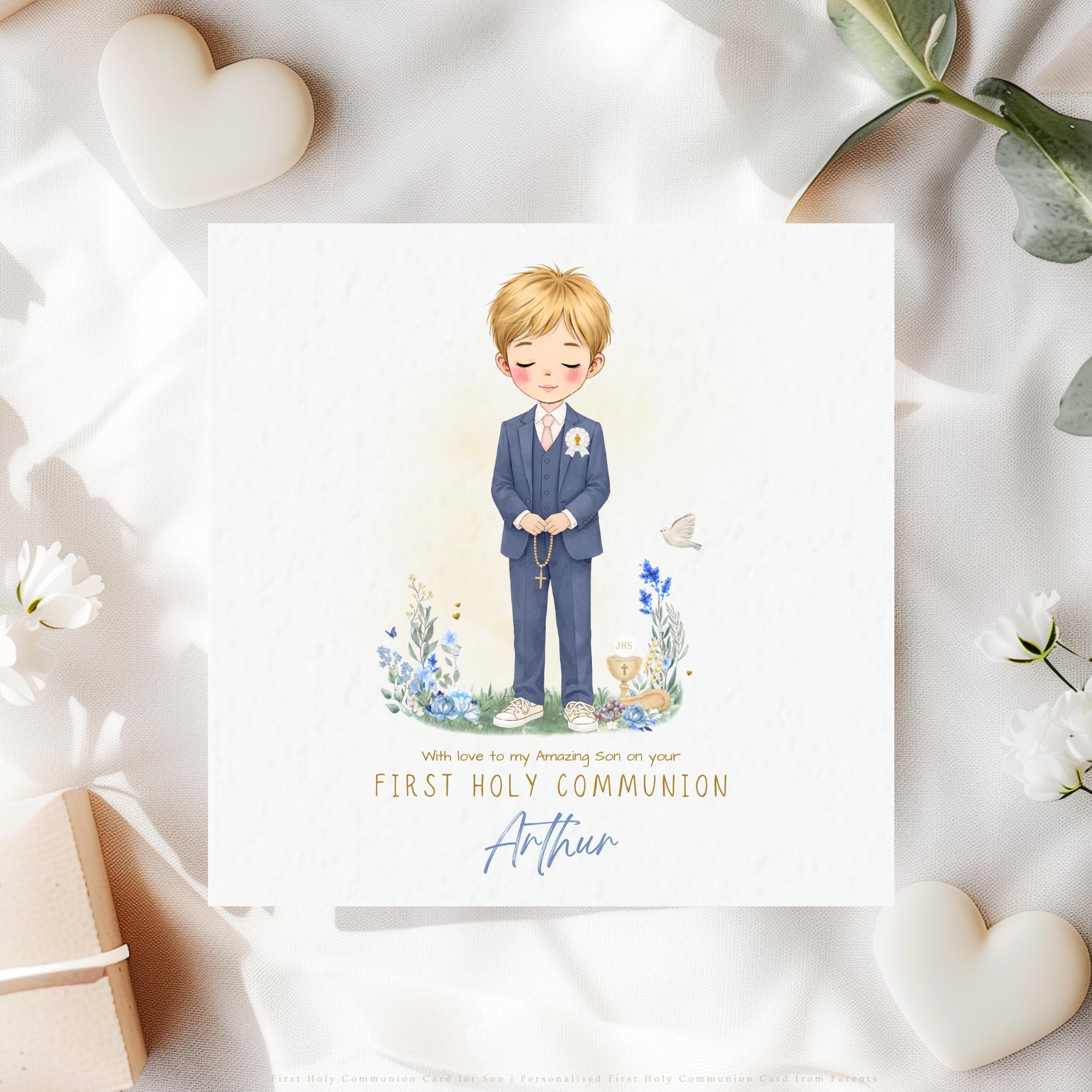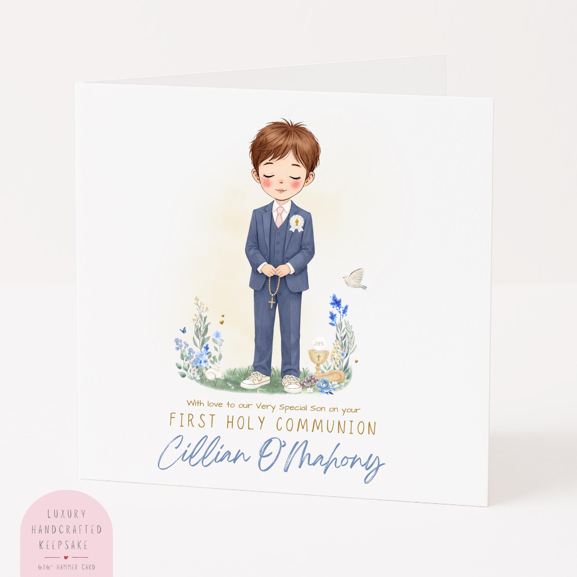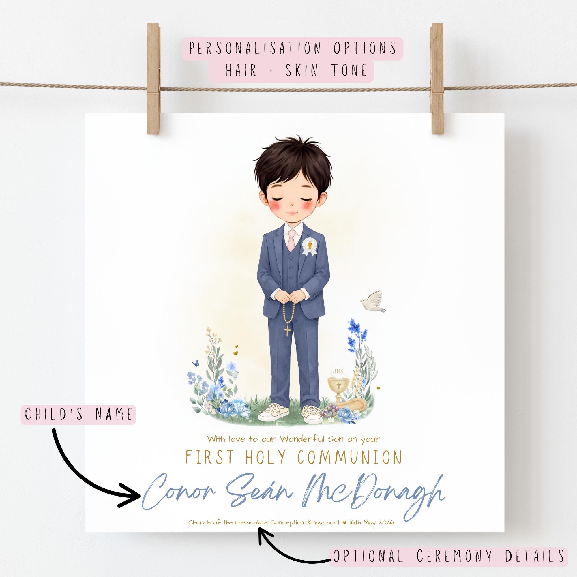 Celebrate your son’s First Holy Communion with a beautifully illustrated personalised keepsake card, thoughtfully created from parents to mark this special milestone in his faith journey.