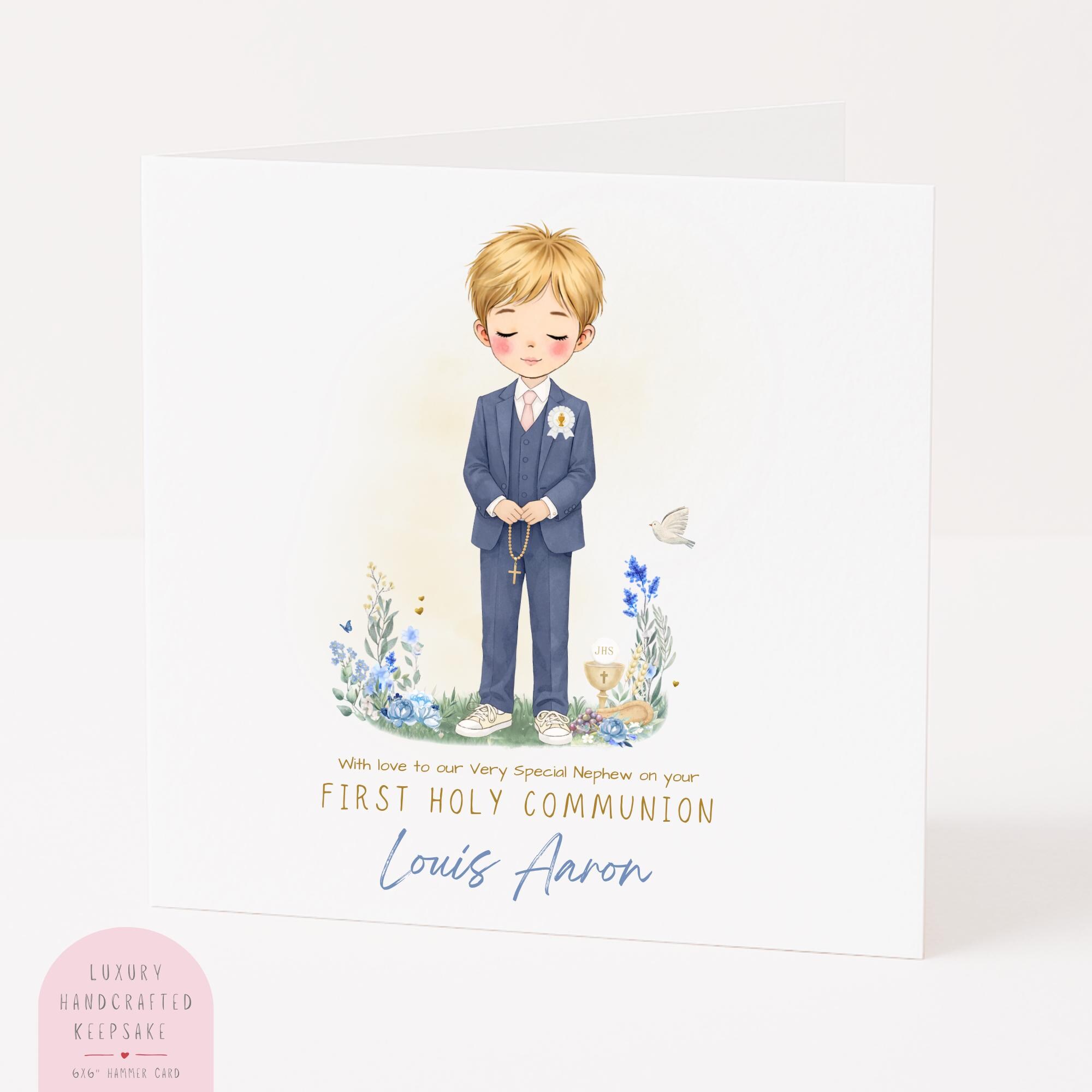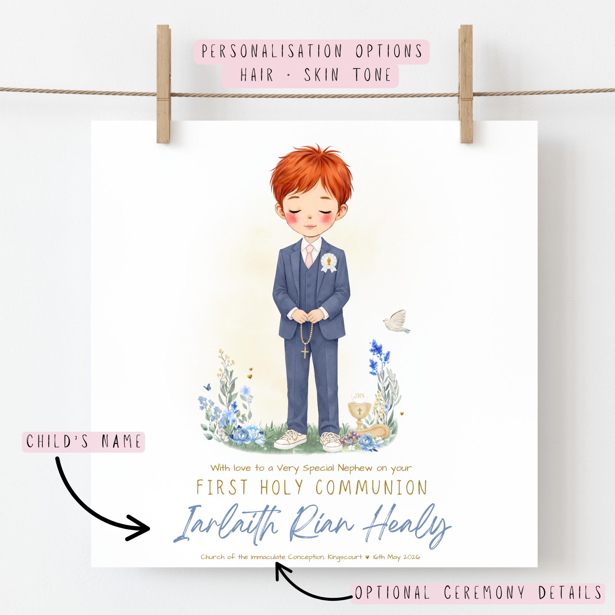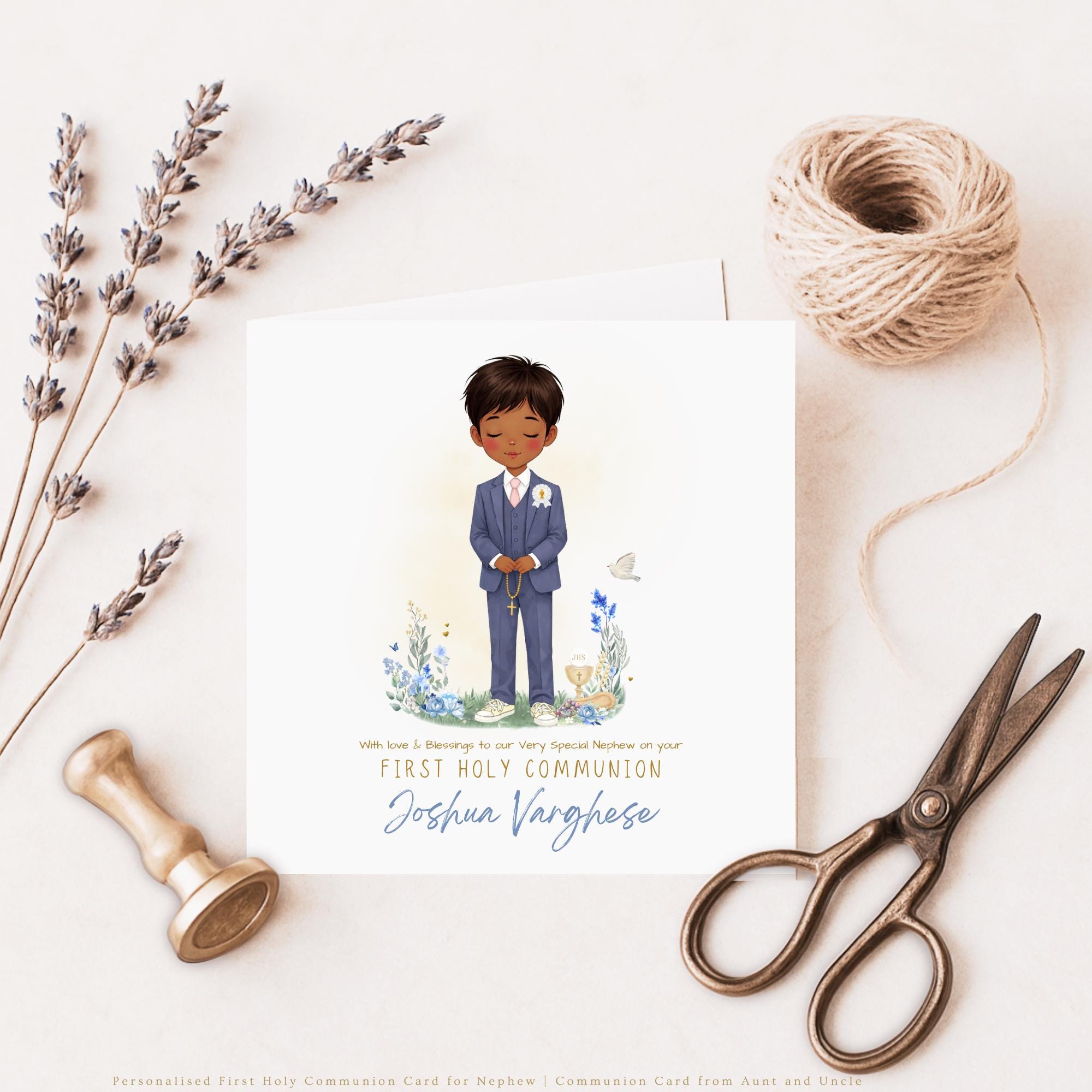 Personalised First Holy Communion Card for Nephew – From Aunt & Uncle – Custom Hair & Skin Tone – Catholic Keepsake