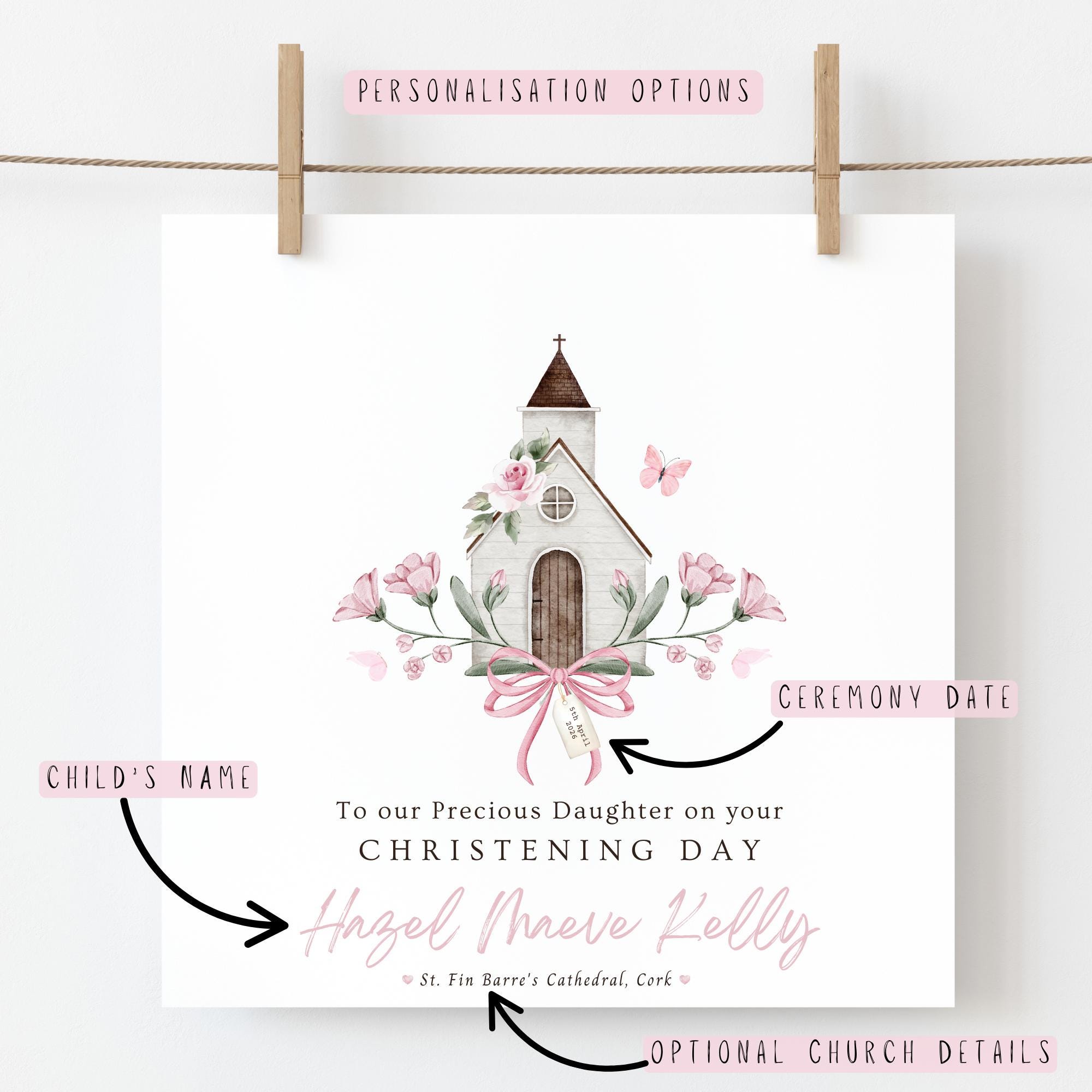 This elegant baby girl Baptism card features a delicate hand painted watercolour church adorned with soft pink florals, a gentle butterfly detail and a classic bow accent. Designed in a timeless heirloom style, this religious Christening keepsake is created to be framed and treasured long after her special day.