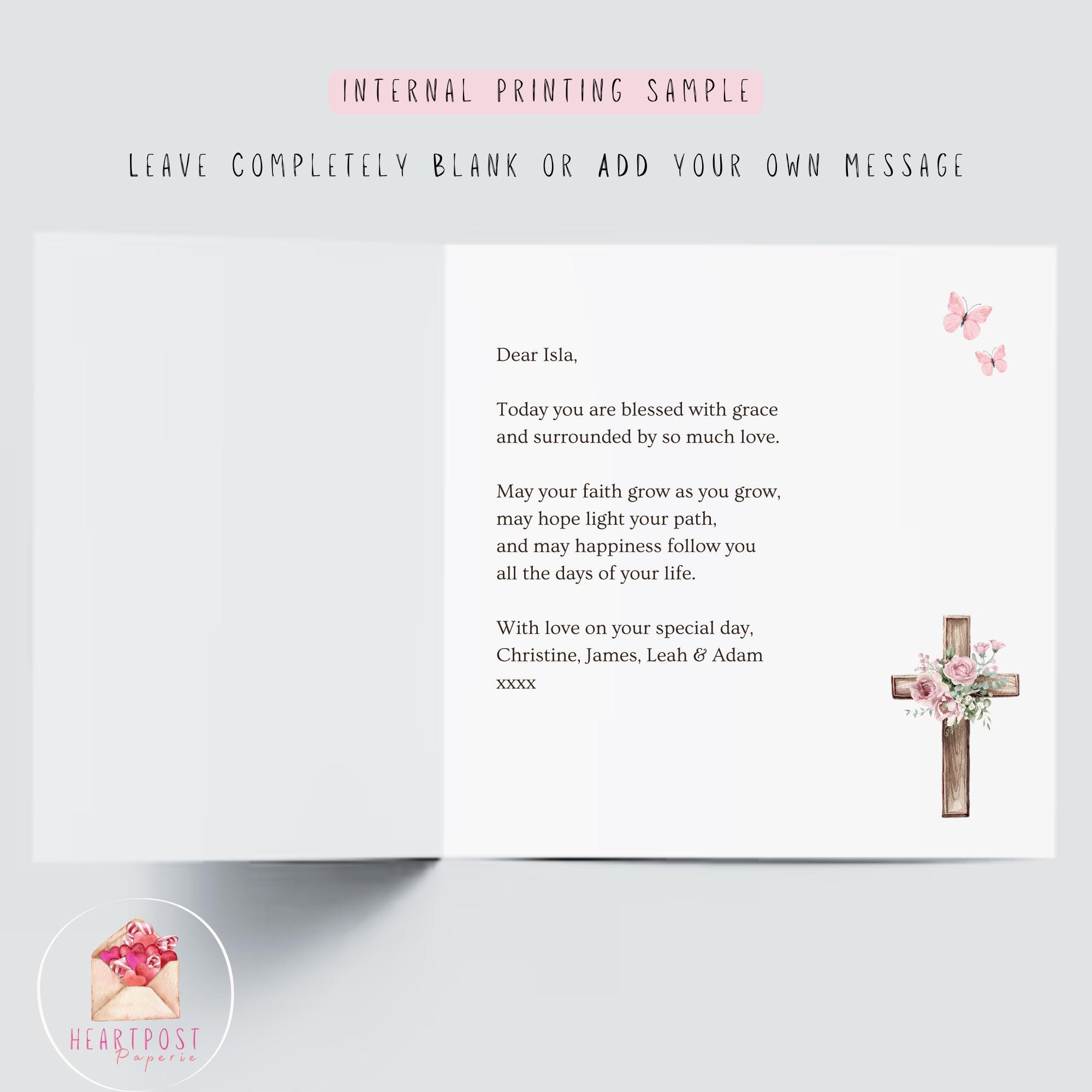 Perfect for a daughter, little girl, sister, cousin, grand-niece, great-niece, family friend or any special girl in your life, this personalised Christening card is a heartfelt way to mark the beginning of her faith journey.