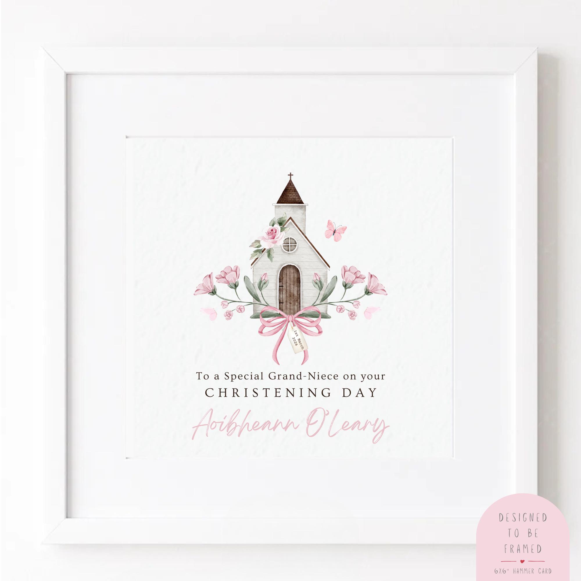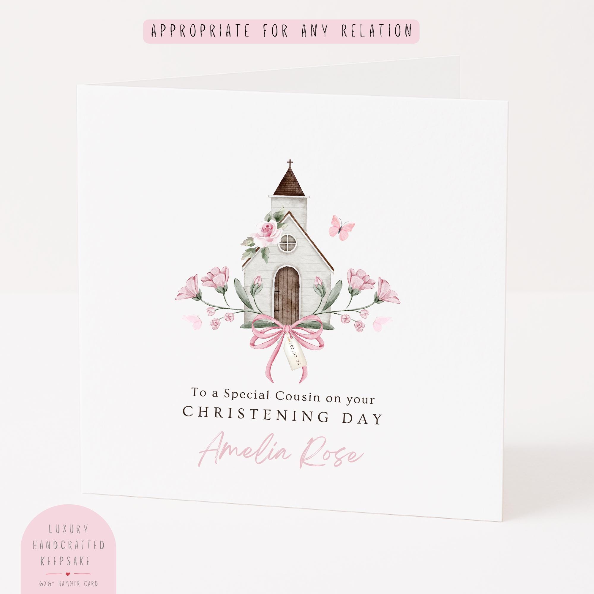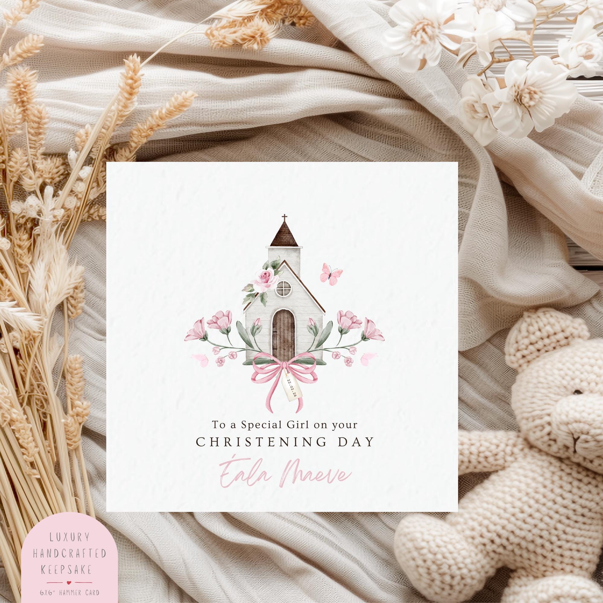 This elegant religious Baptism card features a delicate hand painted watercolour church adorned with soft pink florals, a gentle butterfly detail and a classic bow accent. Designed in a timeless heirloom style, it is created to feel soft, feminine and truly keepsake worthy.