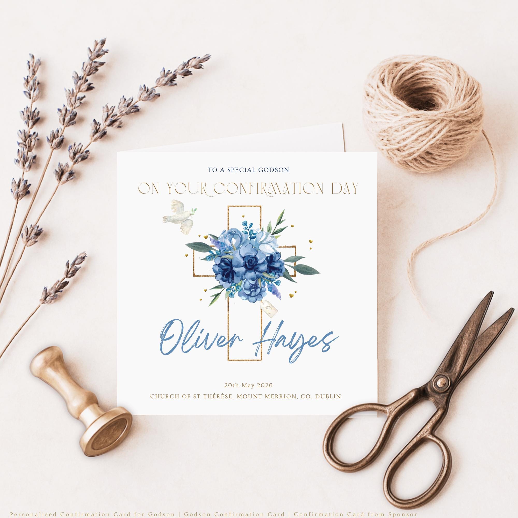 A personalised Confirmation card for a godson, featuring a blue floral cross and dove illustration. Customised with name, date, and church, this is a meaningful Catholic keepsake from a godparent or sponsor.