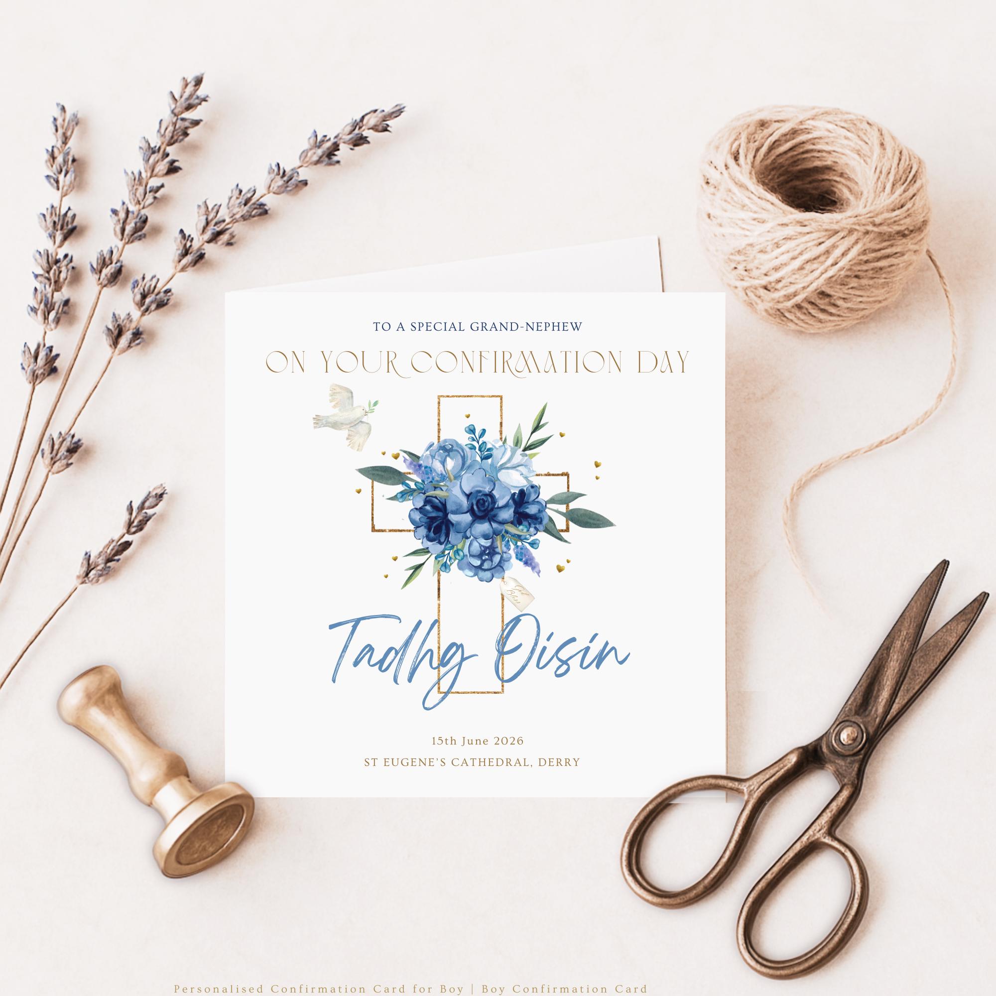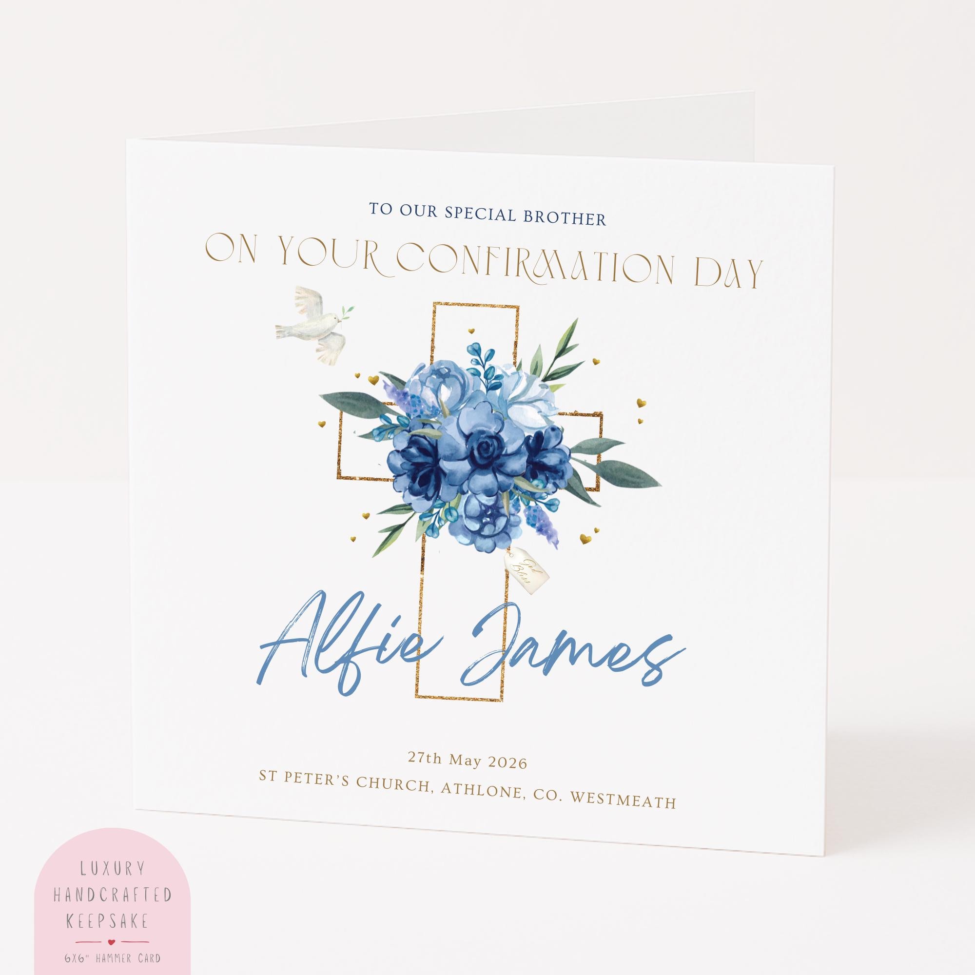 A personalised Confirmation card for a boy, featuring a blue floral cross and dove illustration. Customised with name, date, church, and relationship wording to create a meaningful Catholic keepsake.