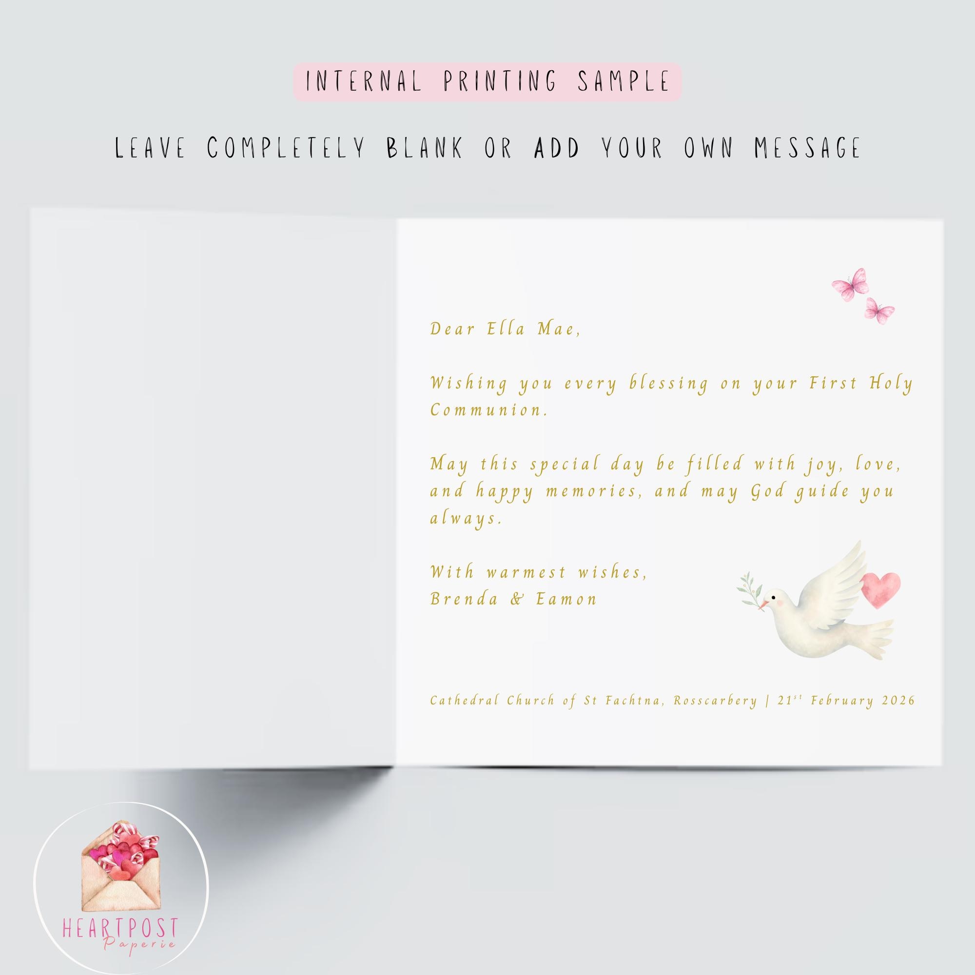 This personalised Communion card for a girl is ideal for parents, grandparents, godparents, aunts, uncles, and family friends searching for a meaningful Catholic Communion card or religious keepsake gift. The elegant chalice design and soft pastel colour palette give this First Holy Communion card a refined heirloom quality, perfect for marking such a special day in her faith journey.
