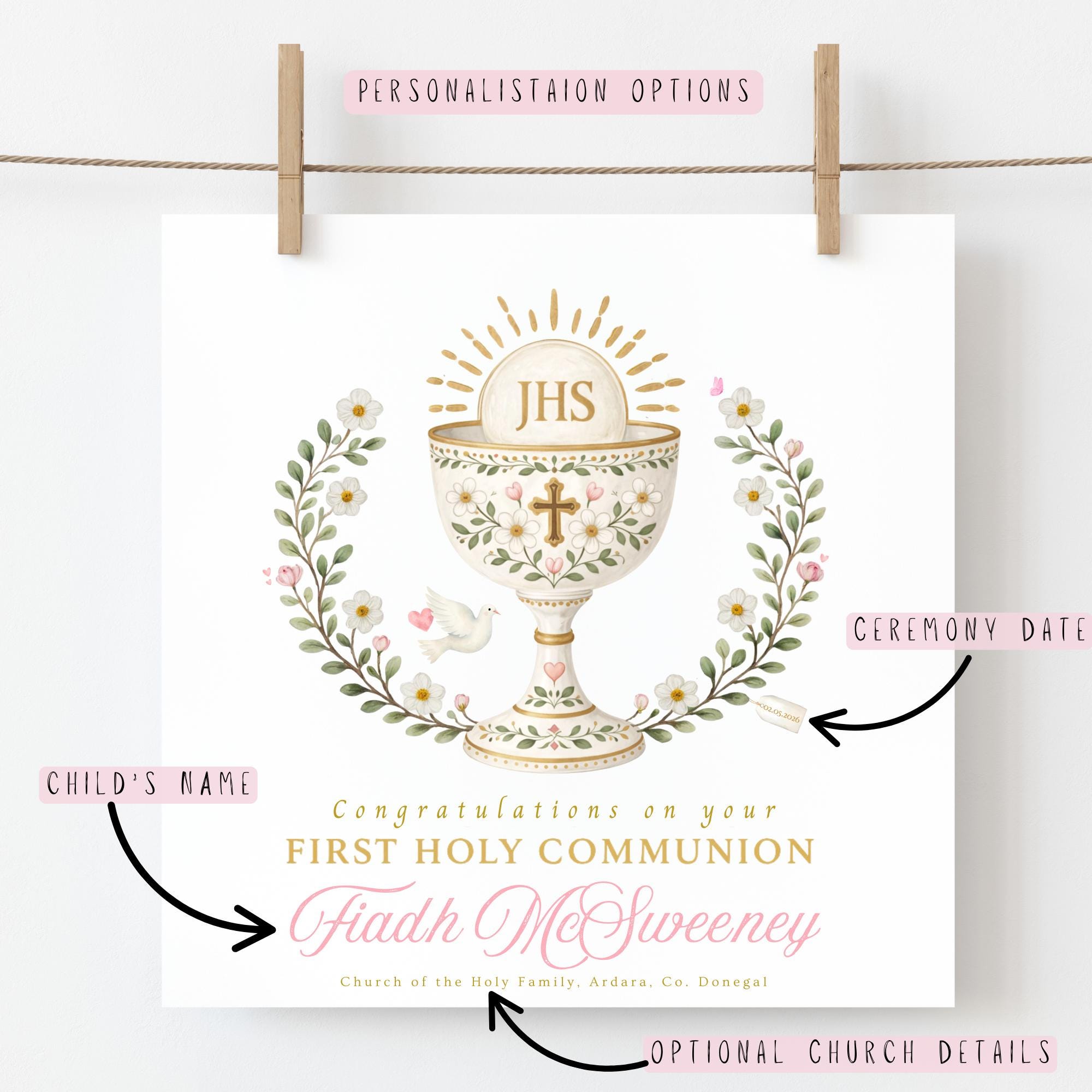 A personalised First Holy Communion card for a girl featuring a traditional Catholic chalice illustration, custom printed with her name and optional ceremony details. This First Holy Communion keepsake card is beautifully illustrated in soft watercolour and designed to celebrate her First Communion Day in a timeless and meaningful way.