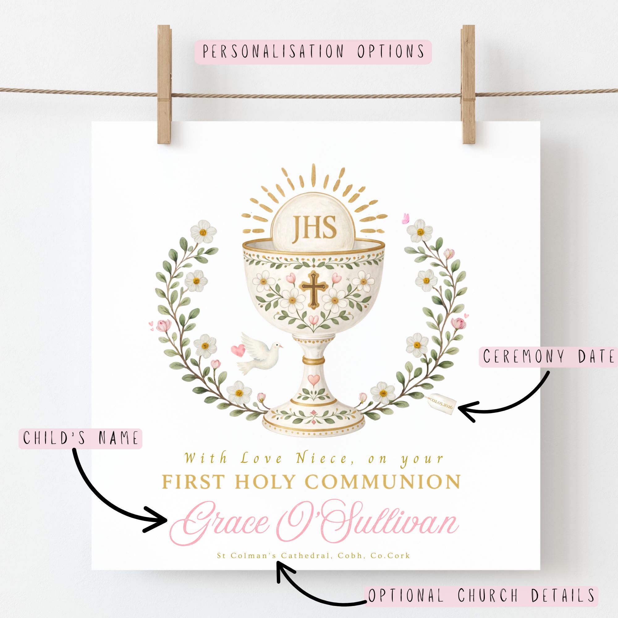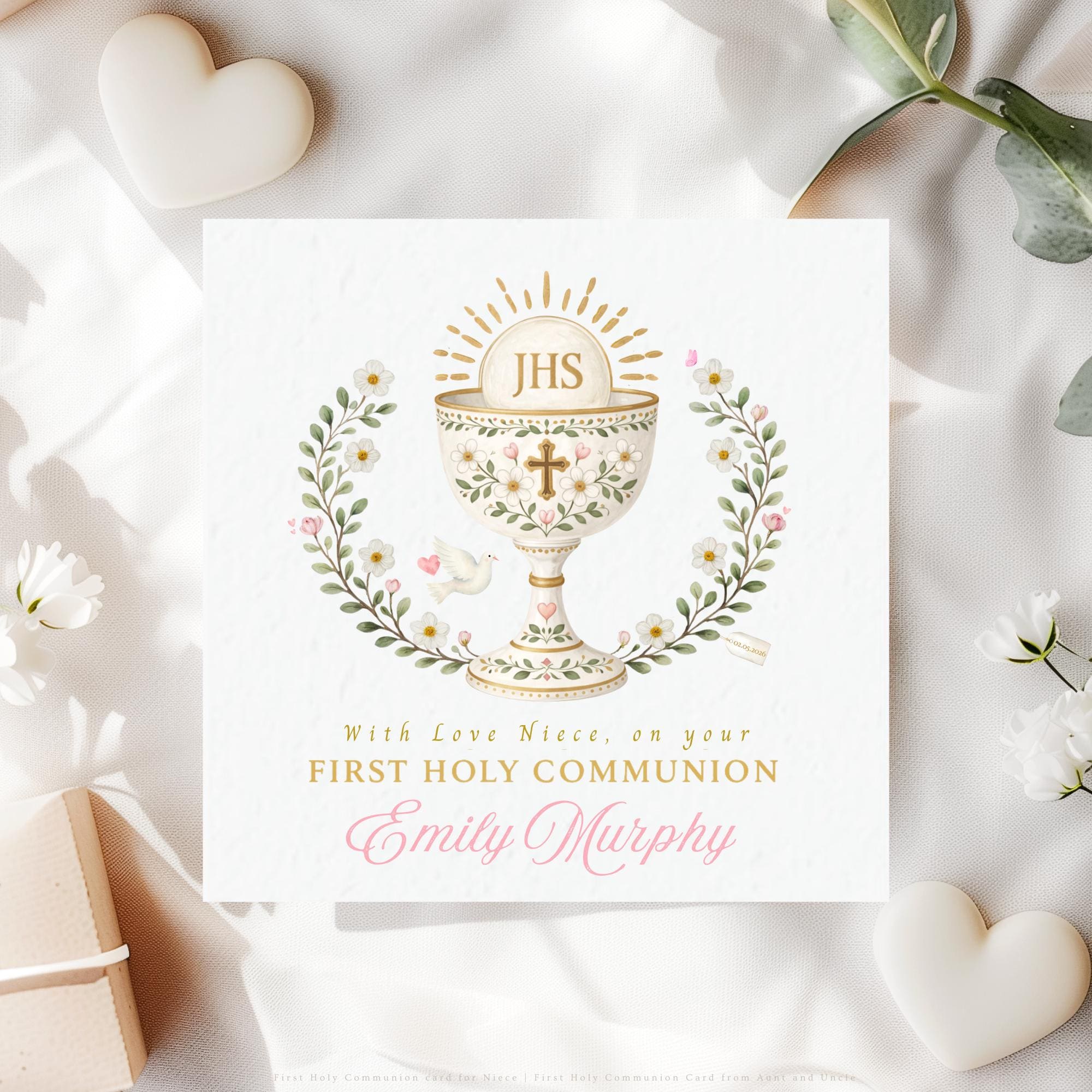 A personalised First Holy Communion card for niece featuring a traditional Catholic chalice watercolour design and customised with her name. This personalised niece Communion card is a meaningful religious keepsake created to celebrate her First Holy Communion and honour the special bond between aunt, uncle, and niece.