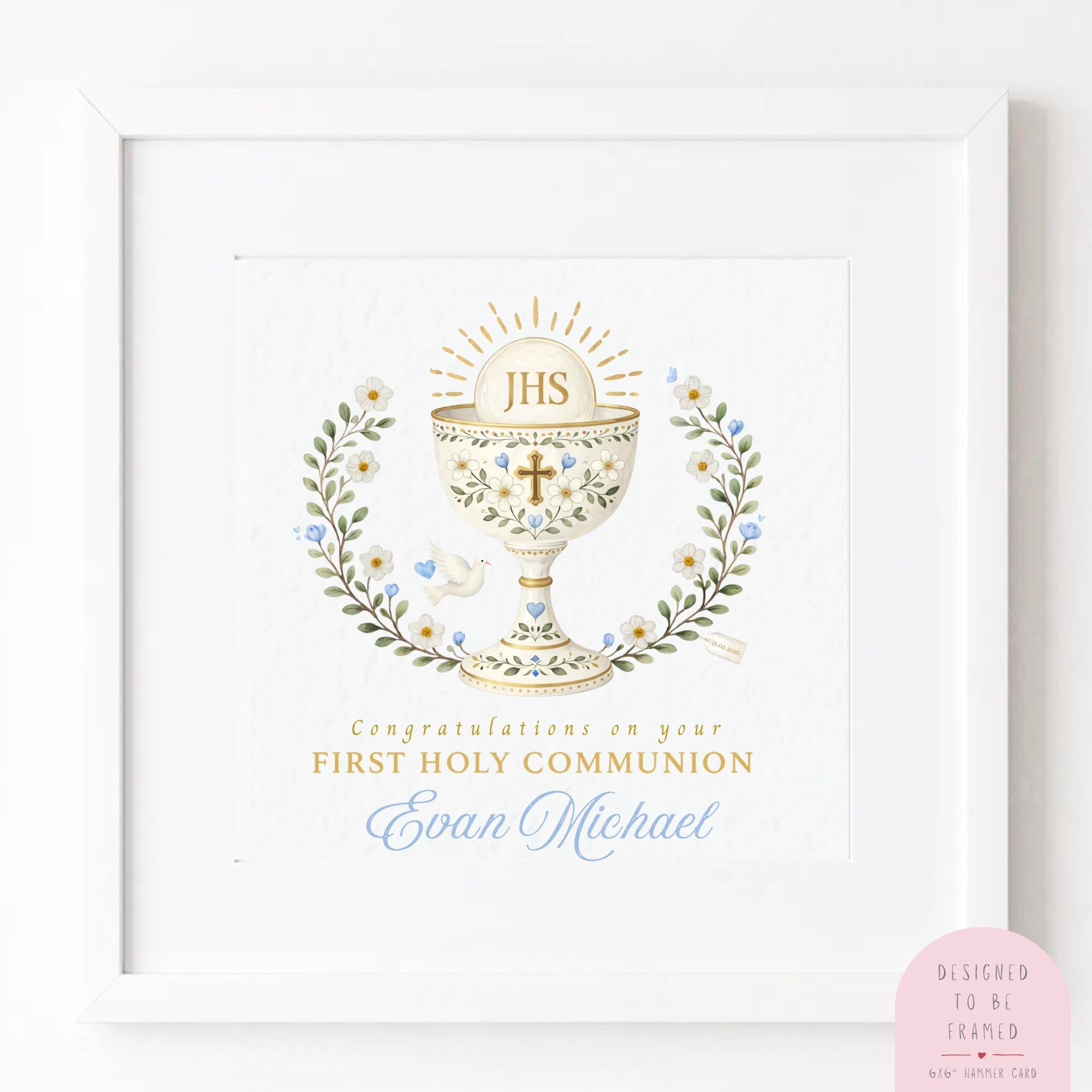 A personalised First Holy Communion card for a boy featuring a traditional Catholic chalice illustration, custom printed with his name and optional ceremony details. This First Holy Communion keepsake card is beautifully illustrated in soft watercolour and designed to celebrate a meaningful religious milestone in a timeless and elegant way.