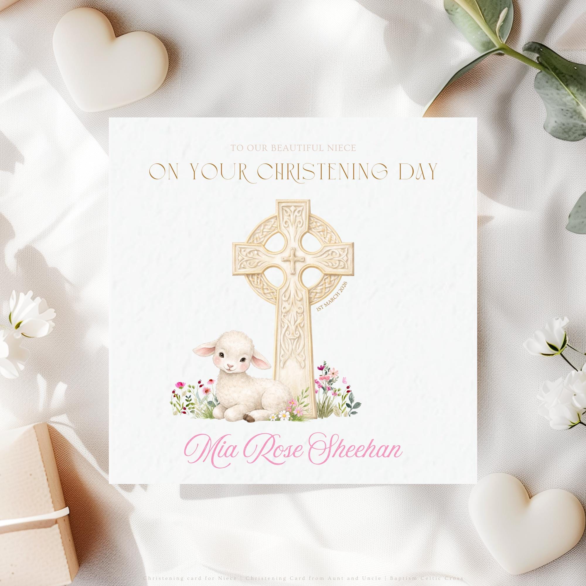 This Catholic Christening card for a niece features a delicate hand illustrated watercolour lamb resting beneath a traditional Celtic cross, symbolising faith, protection, innocence, and God’s loving presence. Thoughtfully personalised, it makes a timeless Christening gift from aunt and uncle and a keepsake to be treasured long after her Christening Day.