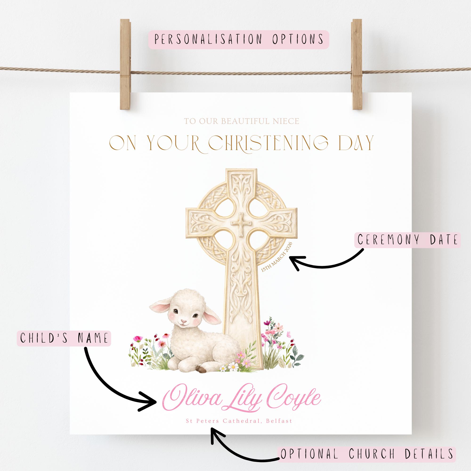 This personalised Christening card for a niece is designed as a heartfelt Christening gift from aunt and uncle, celebrating faith, love, and family connection. With its traditional Celtic cross and lamb illustration, it is a timeless Catholic Baptism keepsake to mark one of life’s most precious milestones.
