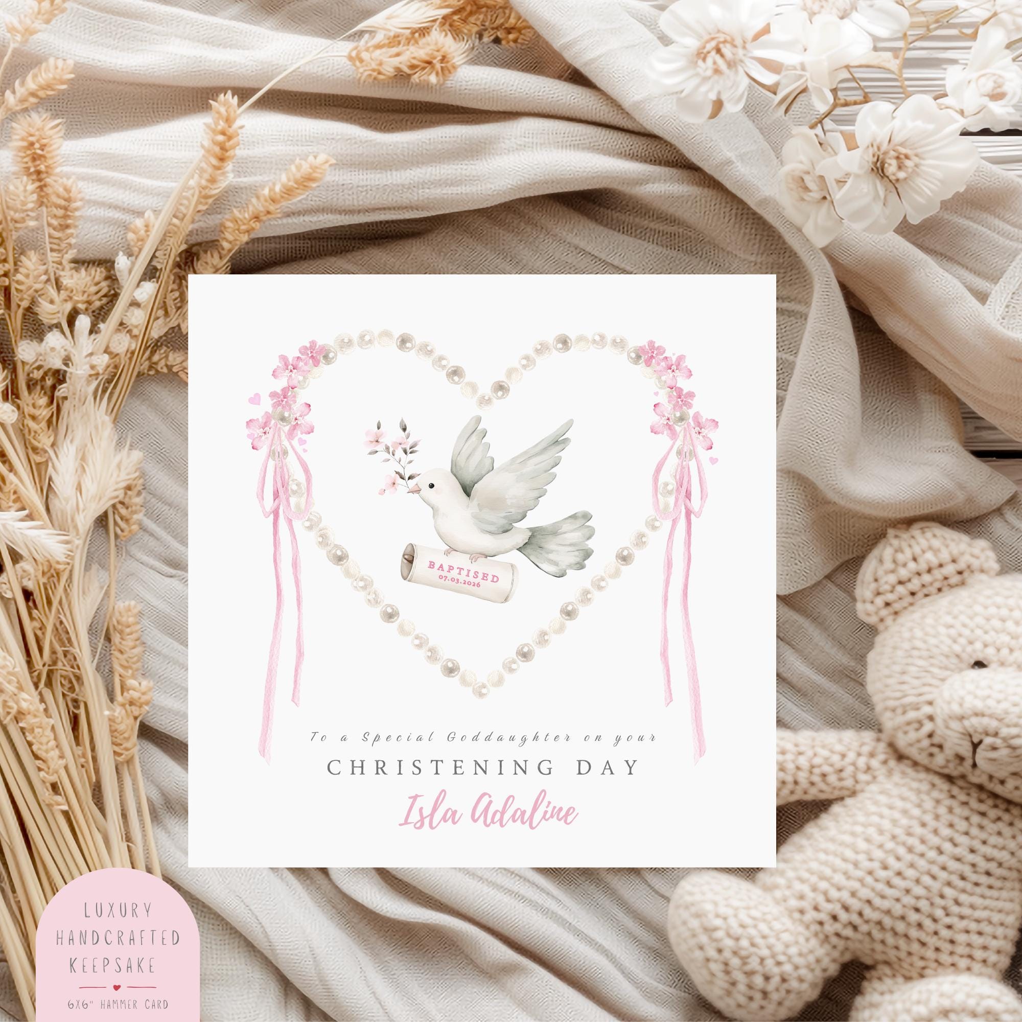 Professionally printed on luxury 6 x 6 inch hammered cardstock, this personalised Christening keepsake card is designed to be framed, displayed, or stored as a lasting reminder of her special day.