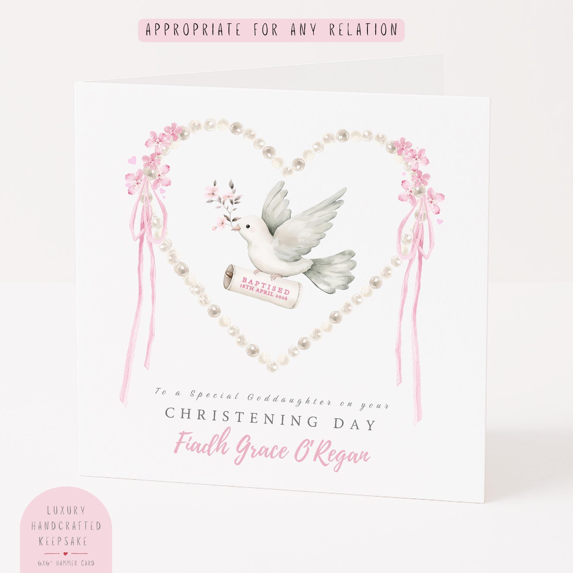 Whether you are celebrating a daughter, niece, cousin, sister, granddaughter, grand-niece, step-sister, goddaughter, or family friend, this personalised Baptism card can be tailored to suit your relationship perfectly. The relationship text is fully customisable using the dropdown option, making this Christening card suitable for a wide range of family connections.
