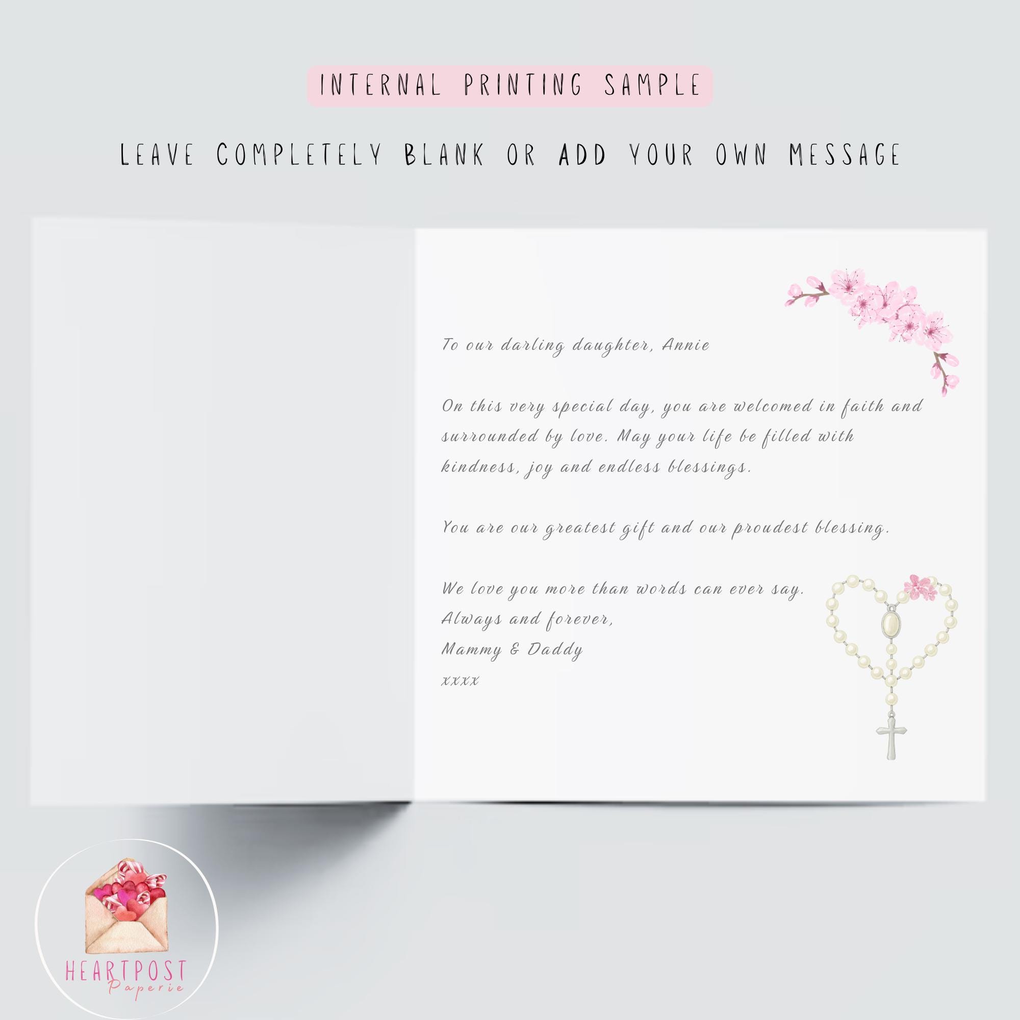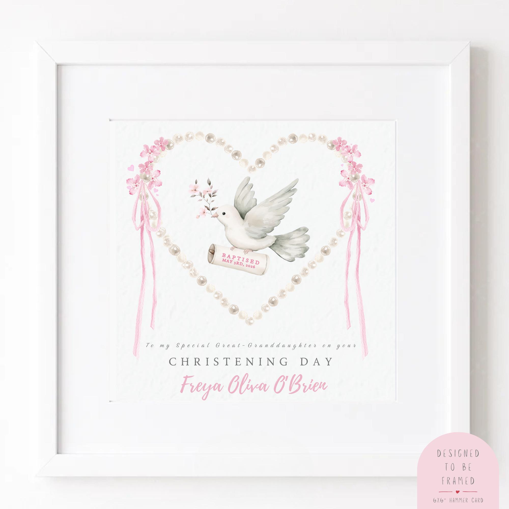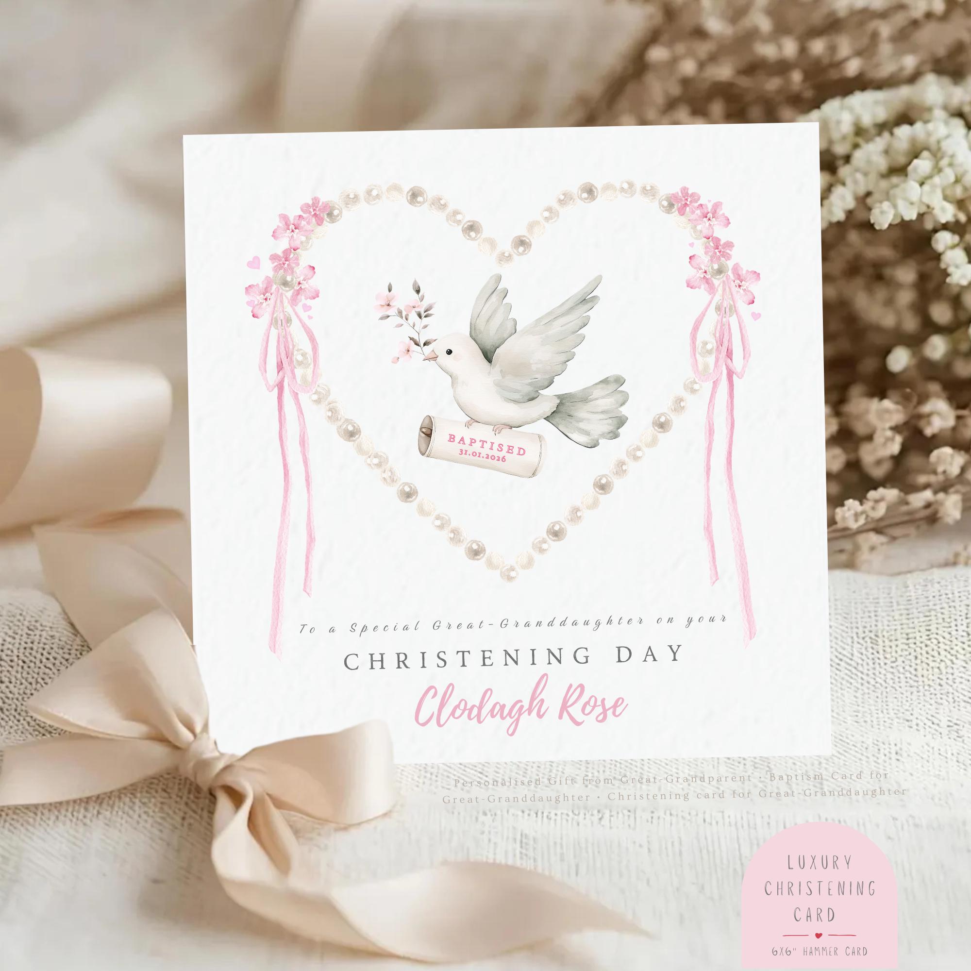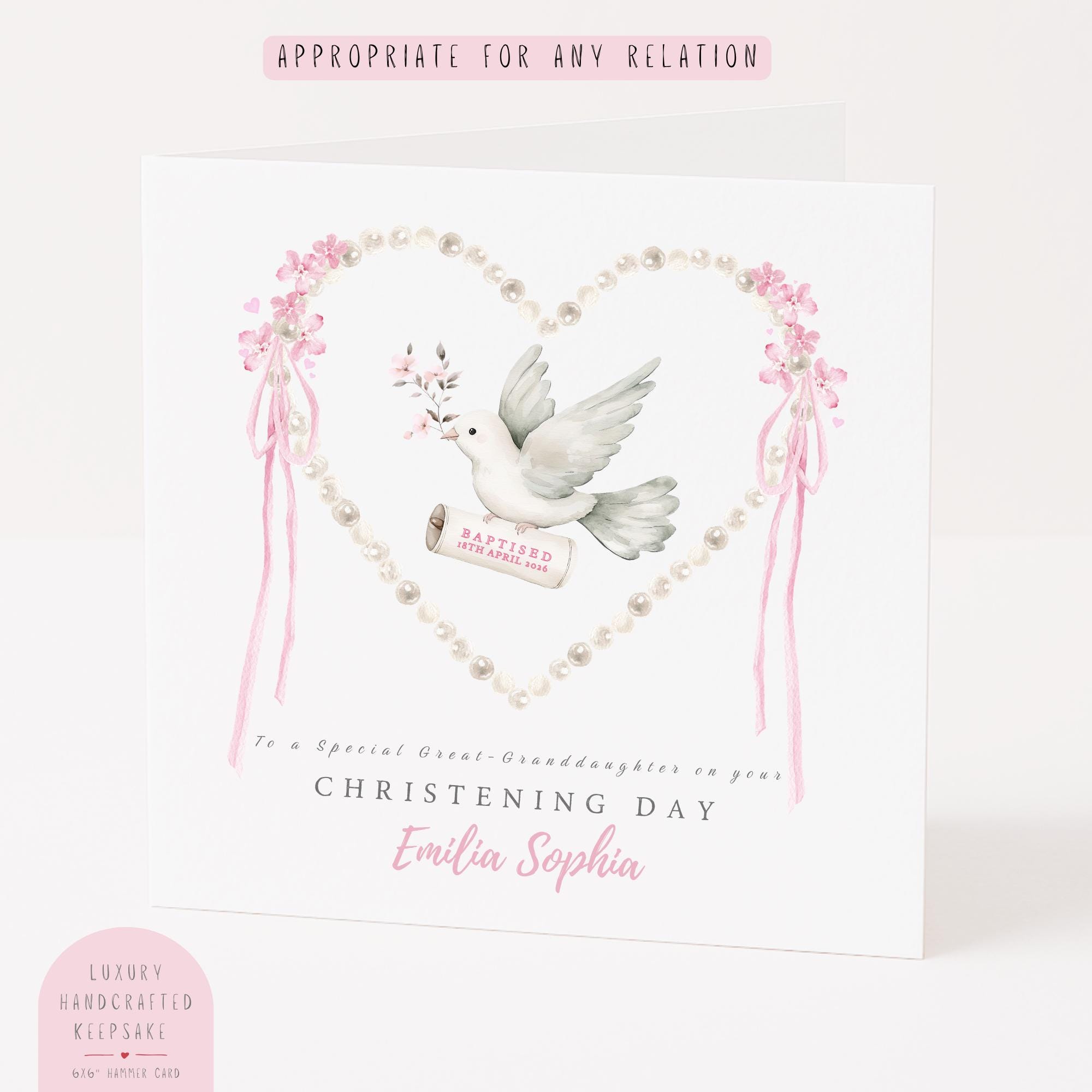 This Christening Card for Great-Granddaughter is a personalised religious keepsake created to honour a Catholic Christening or Baptism Day. The soft watercolour dove symbolises peace and faith, while the pearl heart and gentle pink florals create an elegant, timeless design that families love to treasure.