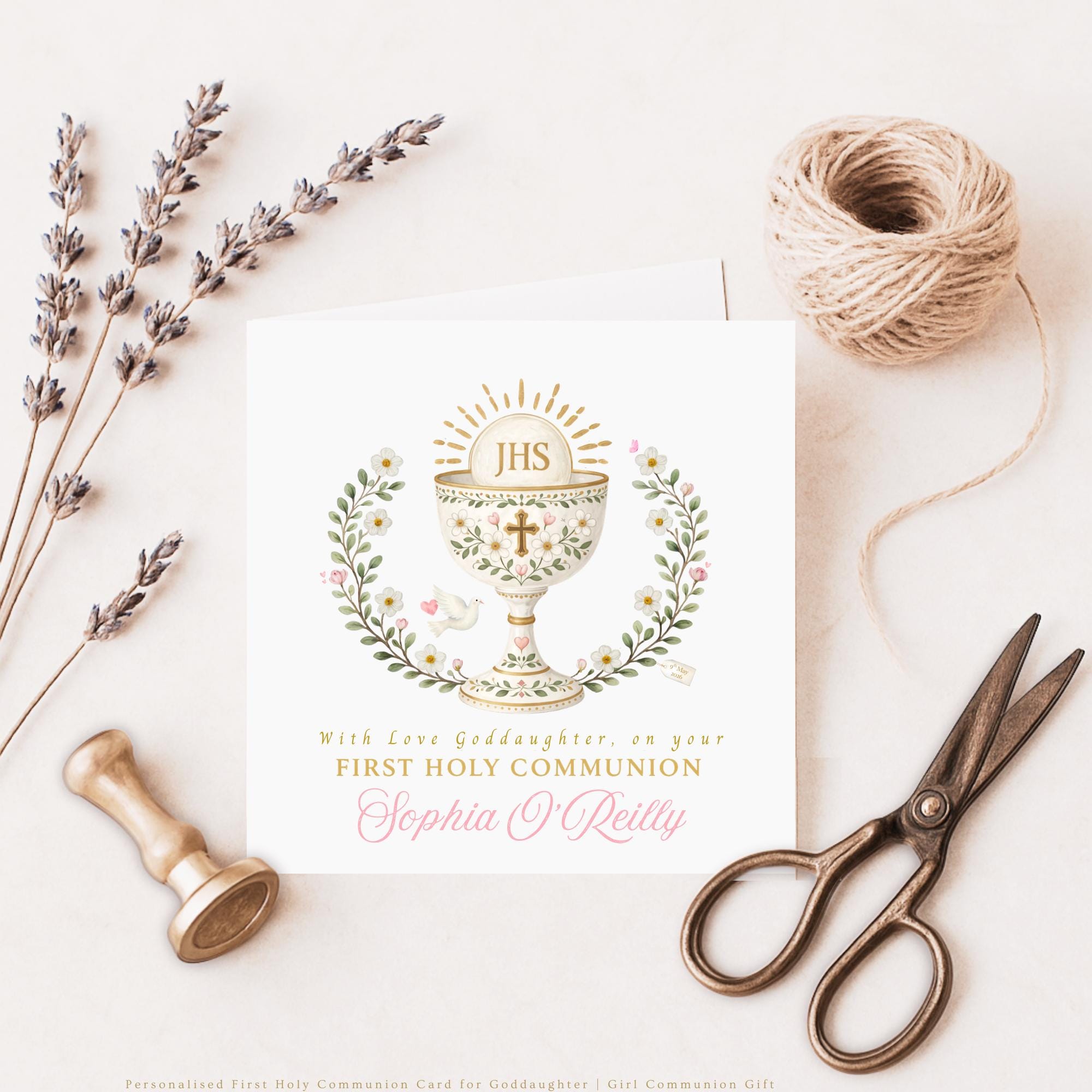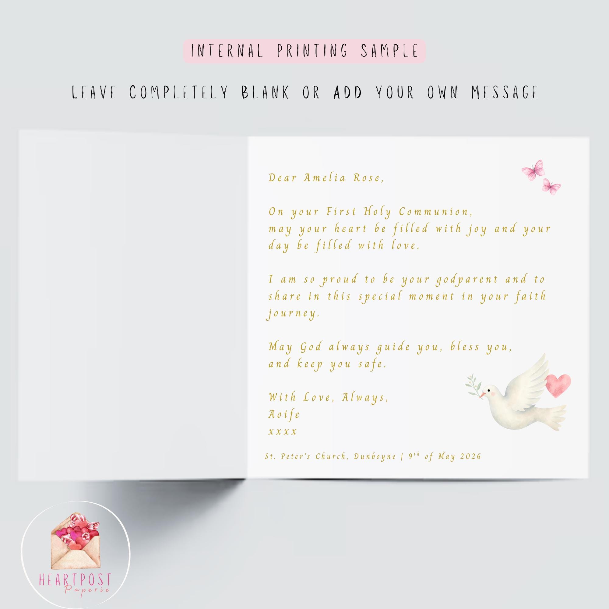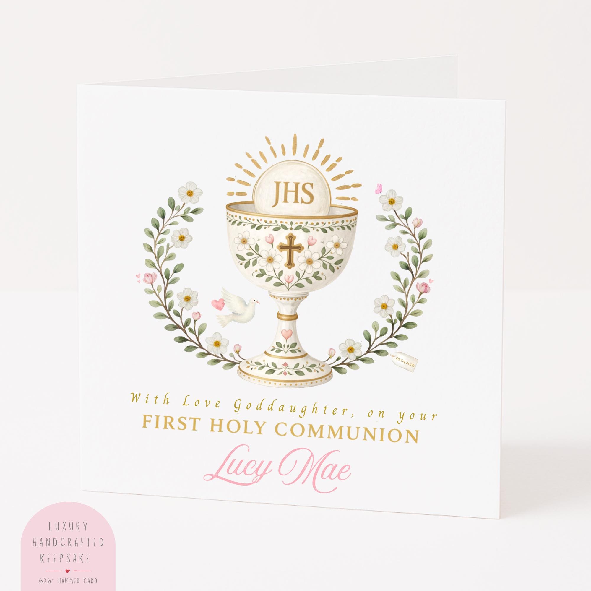 You can personalise this First Holy Communion card for your goddaughter with: