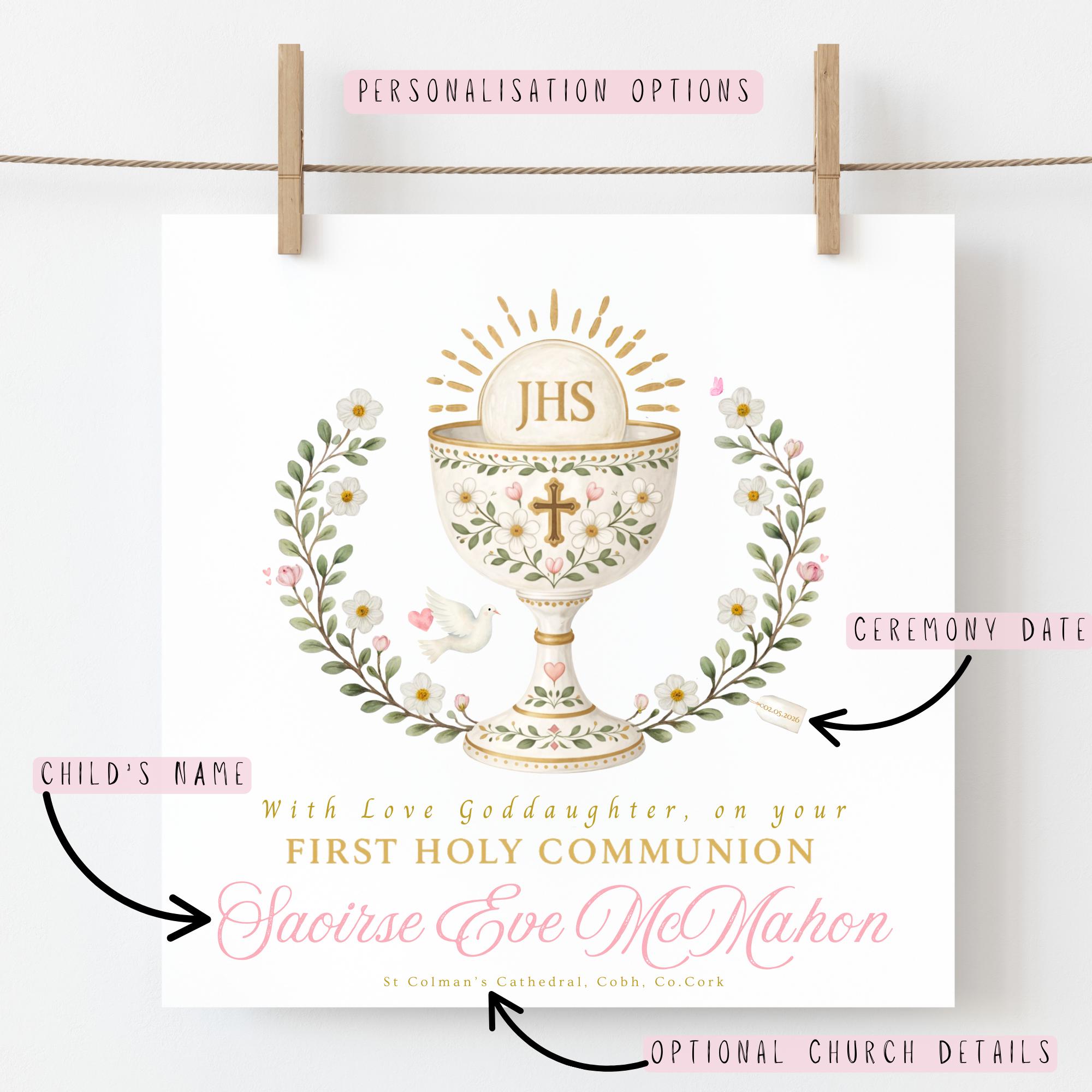 A personalised First Holy Communion card for goddaughter from godparents, featuring a traditional Catholic chalice watercolour design and customised with her name. This personalised goddaughter Communion card is a meaningful religious keepsake created to celebrate her First Holy Communion and honour the special bond between a godparent and goddaughter.