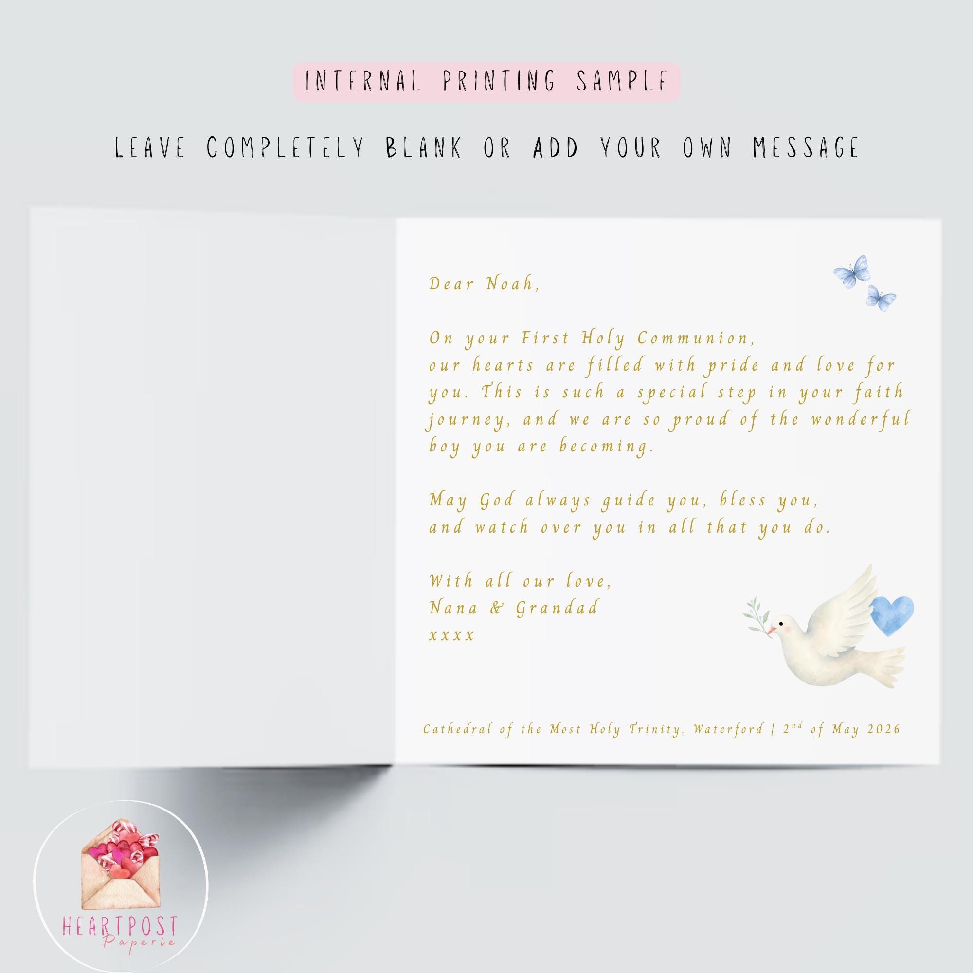 This personalised Catholic Communion card from grandparents is thoughtfully created to mark an important milestone in his faith journey. Whether given on the day itself or kept as a lasting reminder of your pride, love, and blessings, this card is designed to feel traditional, heartfelt, and deeply meaningful.