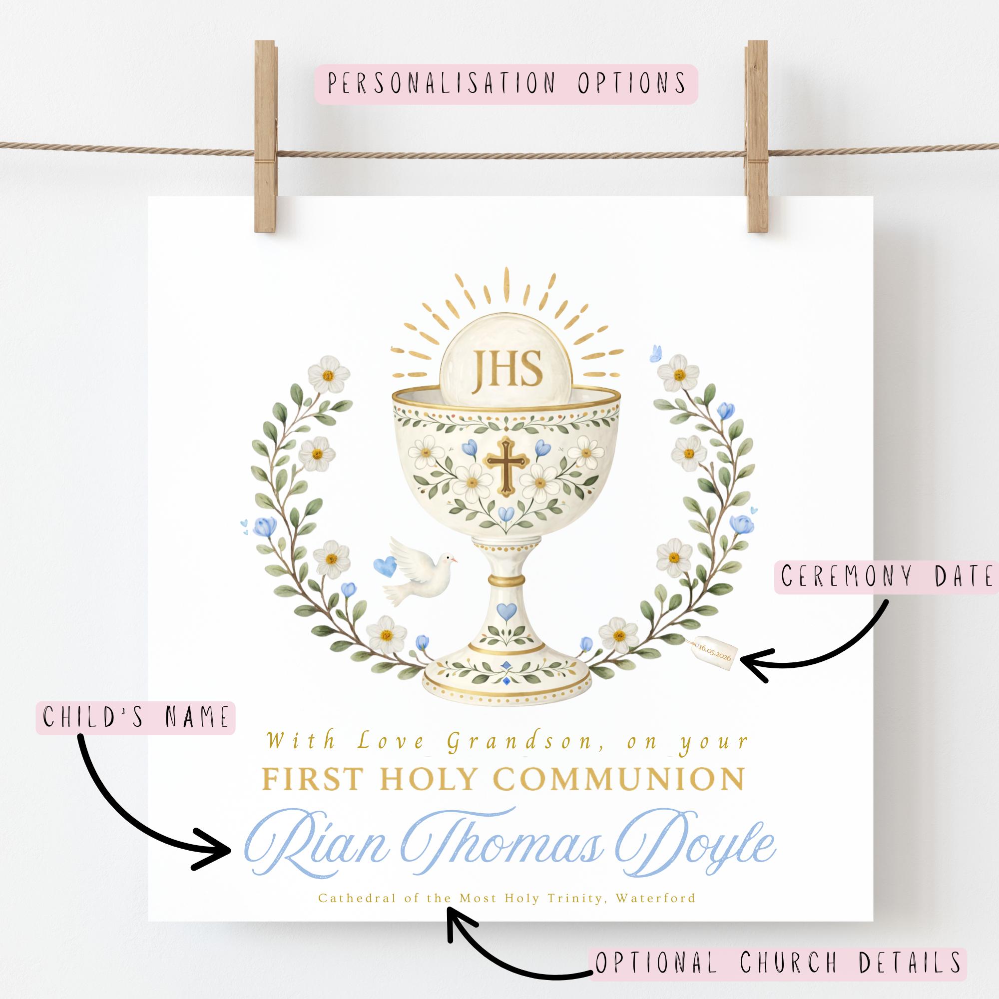 A personalised First Holy Communion card for grandson from grandparents, featuring a traditional Catholic chalice watercolour design and customised with his name. This personalised grandson Communion card is a meaningful religious keepsake created to celebrate his First Holy Communion and honour the special bond between grandparents and grandson.