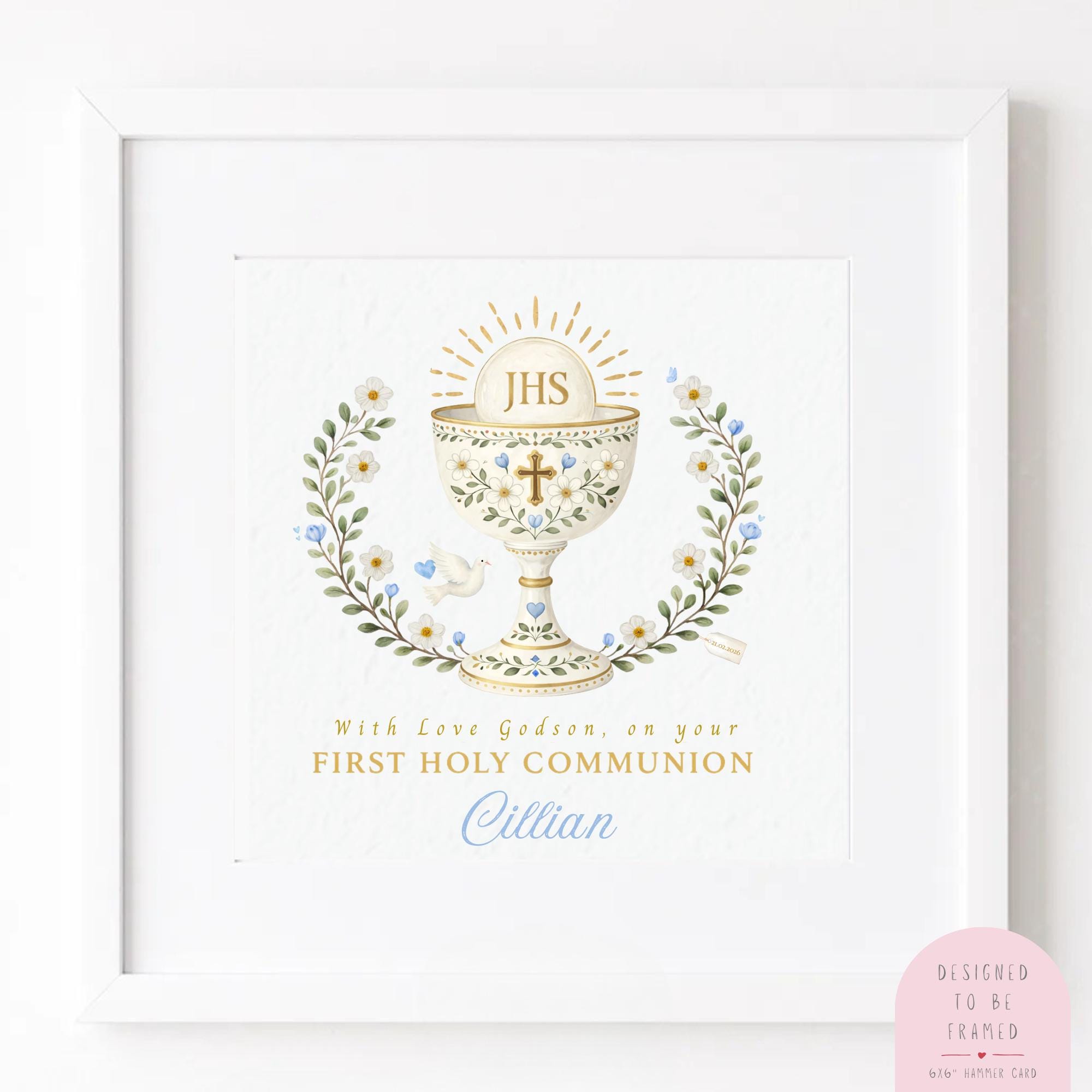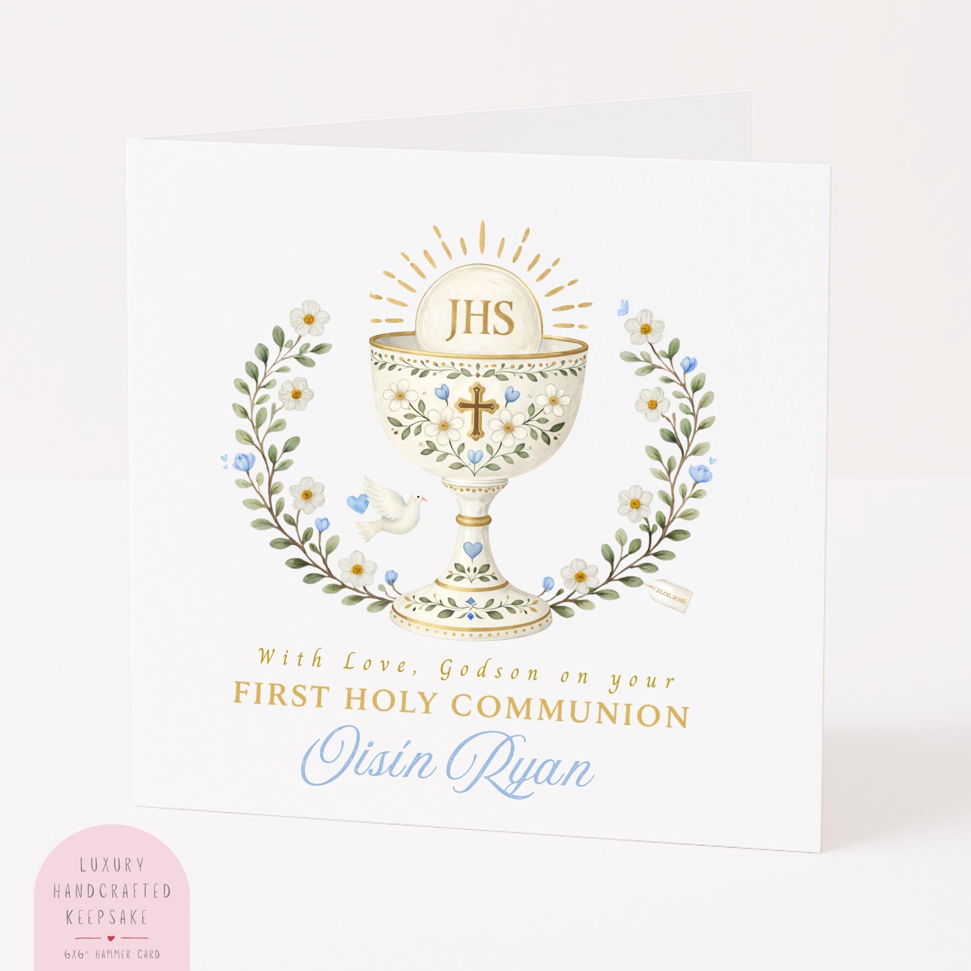 A personalised First Holy Communion card for godson from godparents, featuring a traditional Catholic chalice watercolour design and customised with his name. This personalised godson Communion card is a meaningful religious keepsake created to celebrate his First Holy Communion and honour the special spiritual bond between a godparent and godson.