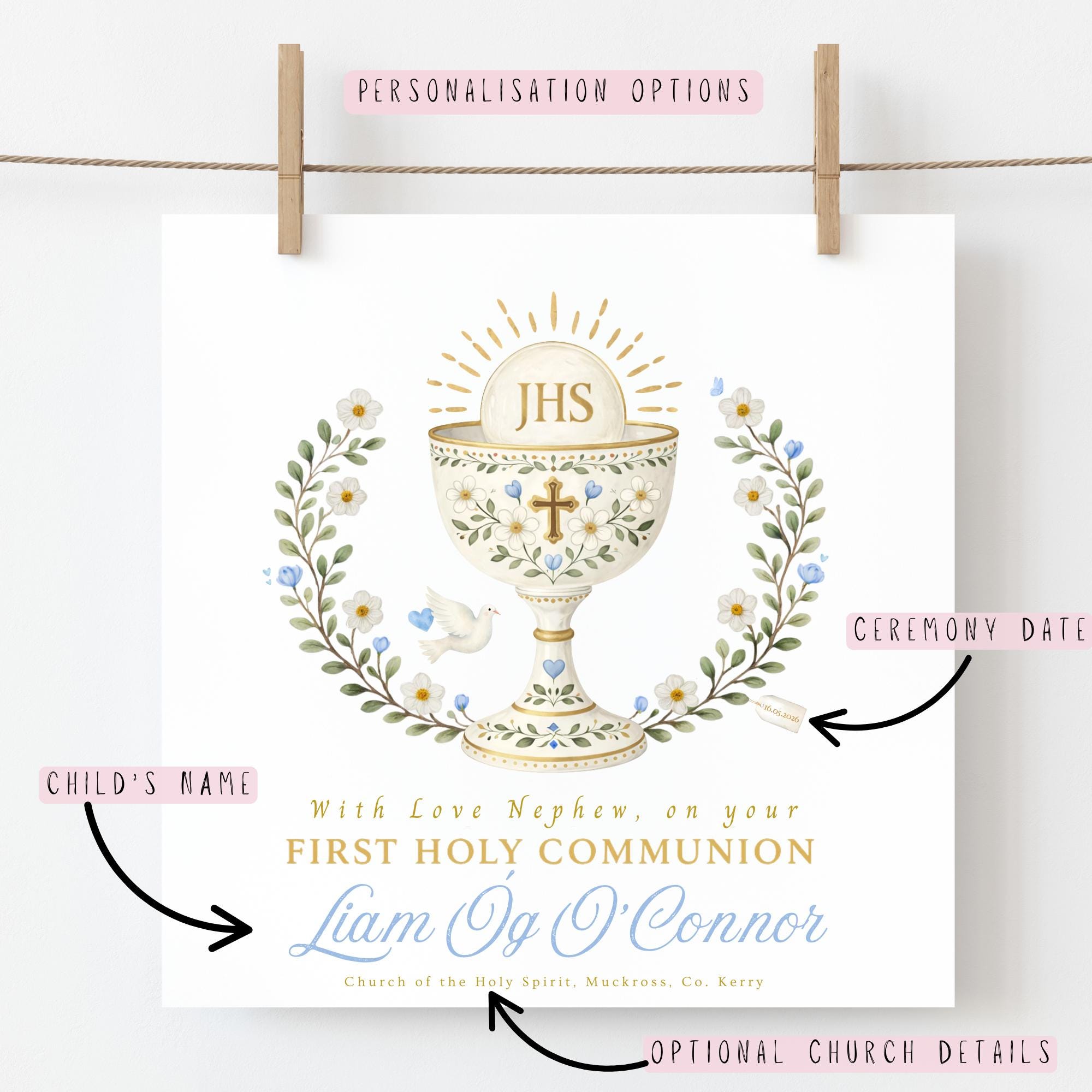 Designed as a timeless Catholic First Communion keepsake, this elegant Communion card for a nephew showcases a hand-illustrated chalice adorned with delicate florals, a dove, and the sacred host — classic symbols of faith, peace, and devotion. The soft blue and gold pastel colour palette and refined watercolour illustration give this card a beautiful heirloom feel, making it a treasured memento long after his Communion Day.