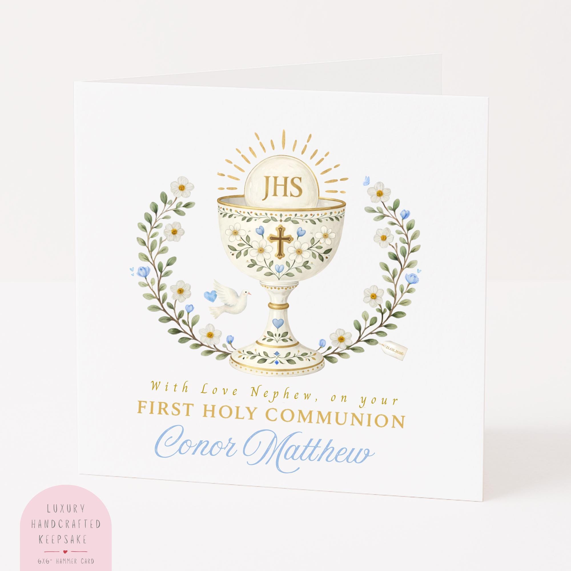 You can personalise this First Holy Communion card for your nephew with: