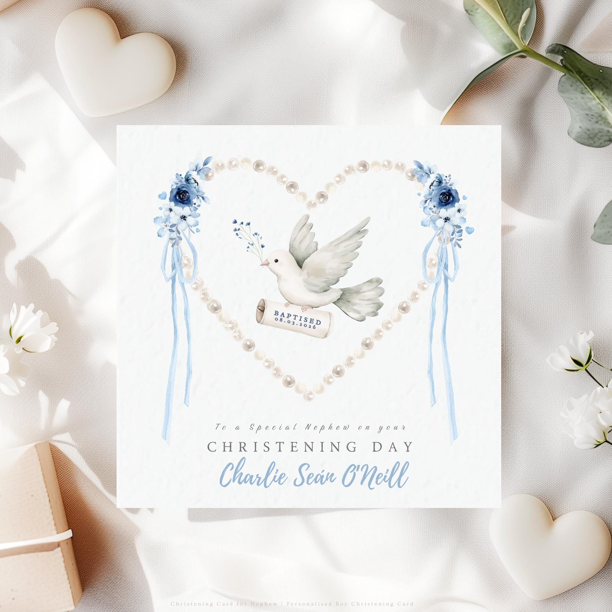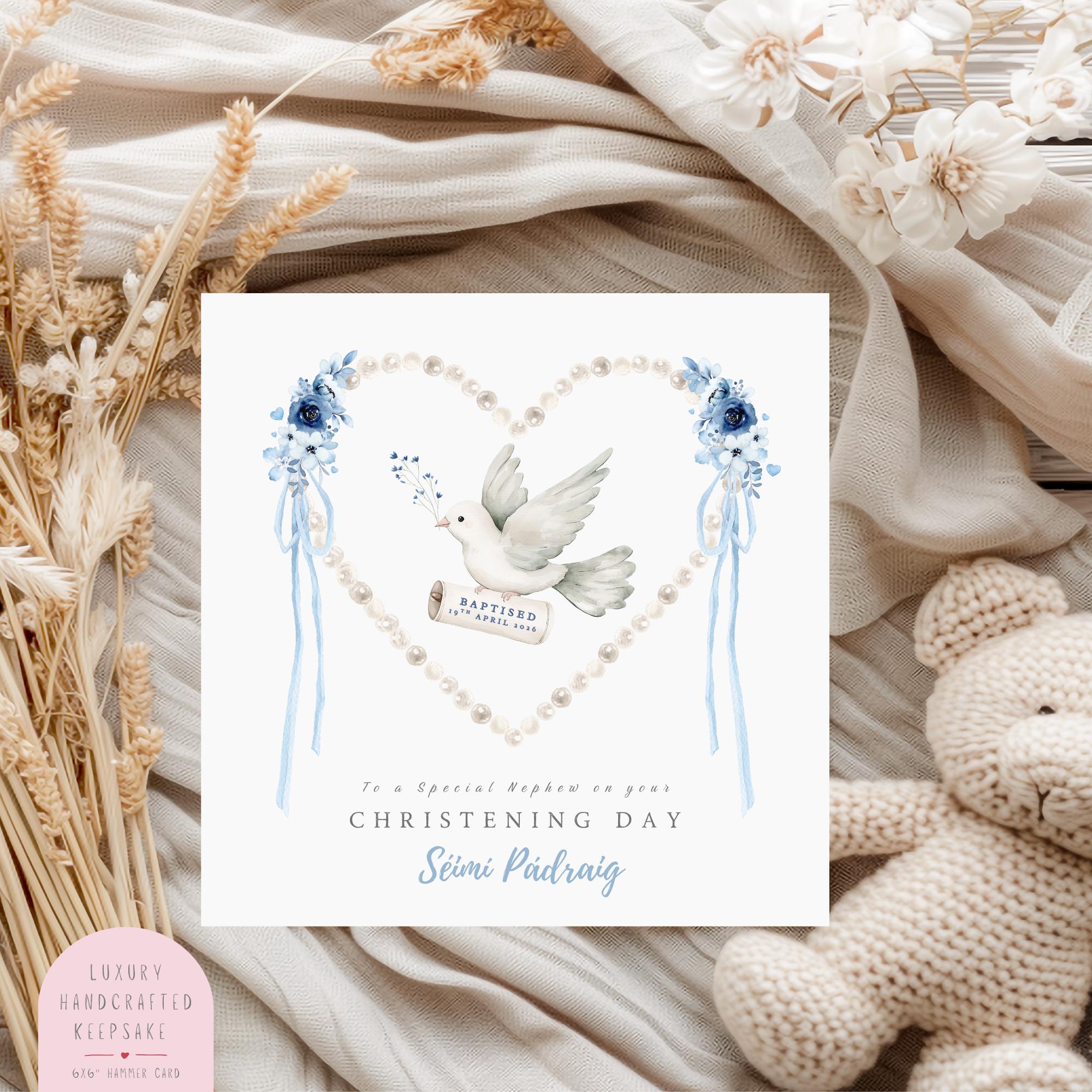 This Christening Card for Nephew is a personalised religious keepsake created to honour a Catholic Christening or Baptism Day. The soft watercolour dove symbolises peace, faith, and protection, while the pearl heart and gentle blue florals create an elegant, timeless design that families love to treasure.