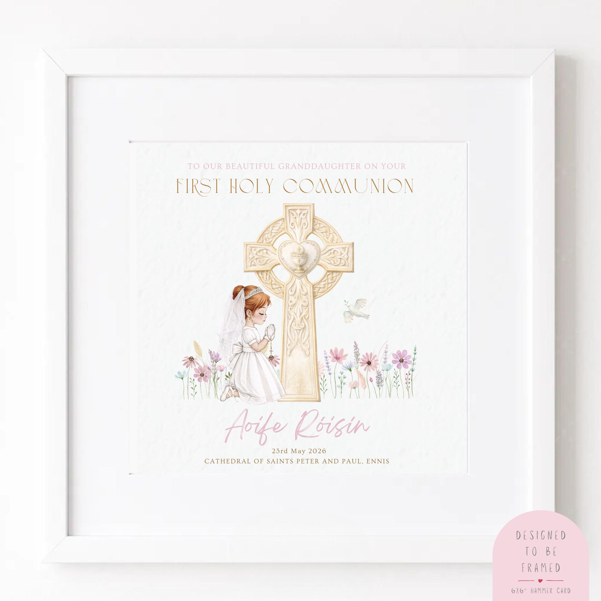 A personalised First Holy Communion card for granddaughter from grandparents, featuring a beautiful Catholic cross illustration and customised with her name. This personalised granddaughter Communion card is a meaningful religious keepsake created especially to celebrate her First Holy Communion and honour the special bond shared between grandparents and granddaughter on this sacred day.