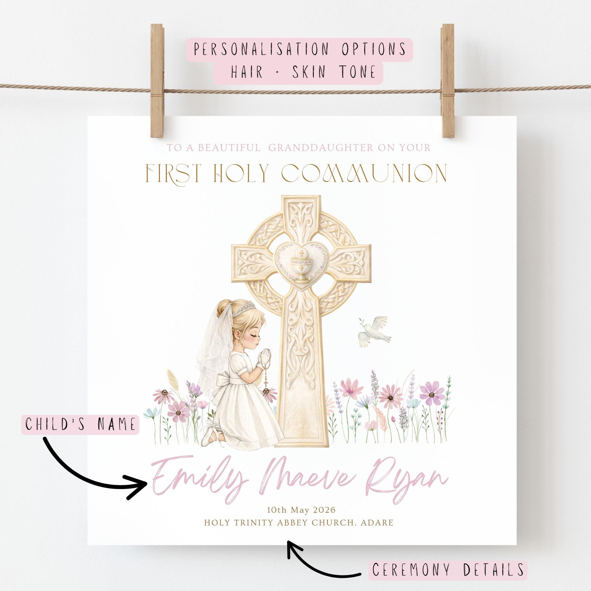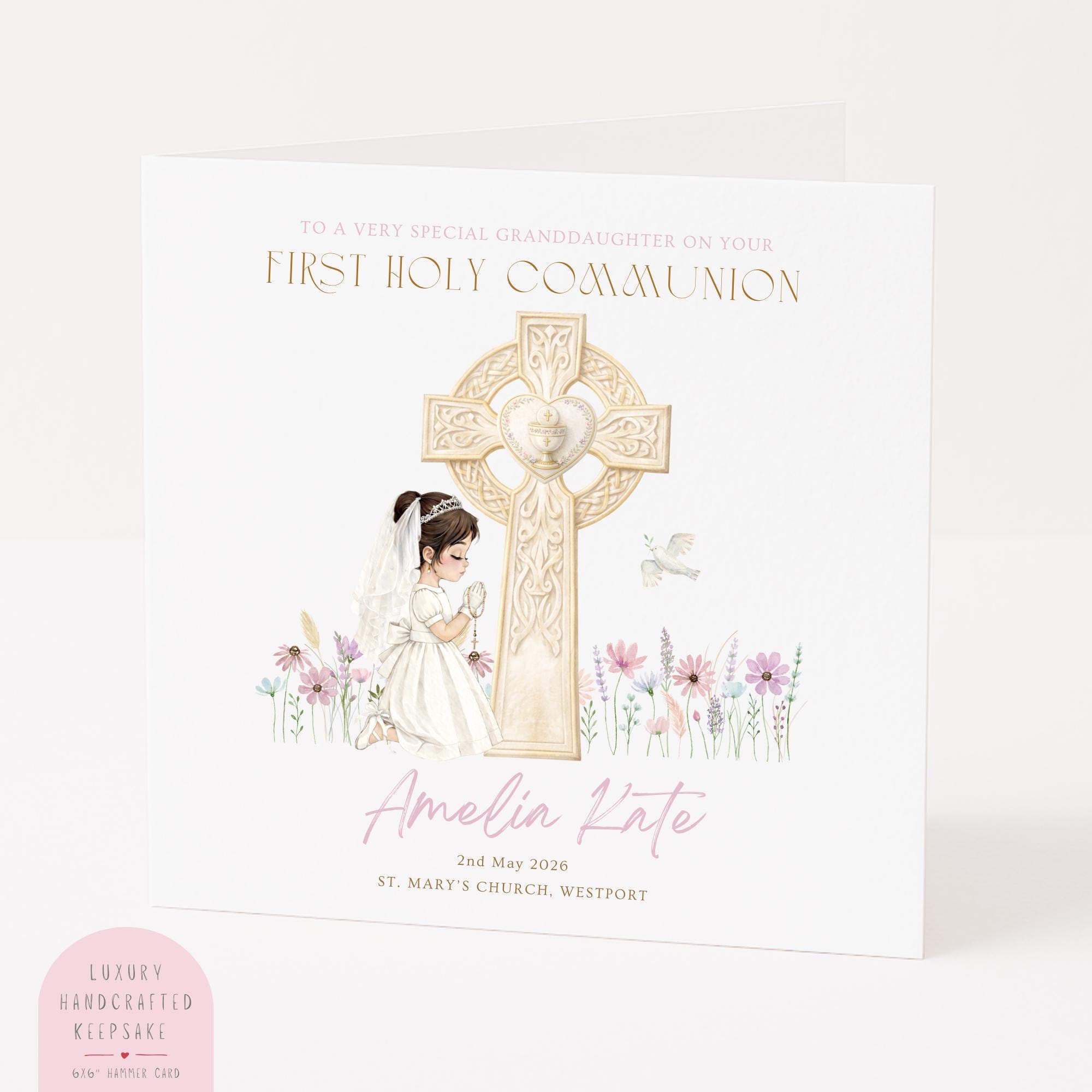You can personalise this First Holy Communion card for your granddaughter with:
