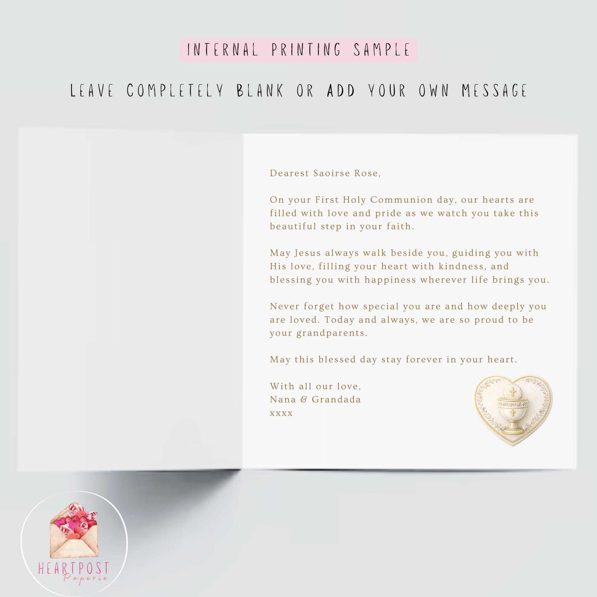This personalised Catholic Communion card from grandparents is thoughtfully created to mark an important milestone in your granddaughter’s faith journey. Whether given on the day itself or kept as a lasting reminder of your love and pride, it is designed to feel heartfelt, traditional, and deeply meaningful.