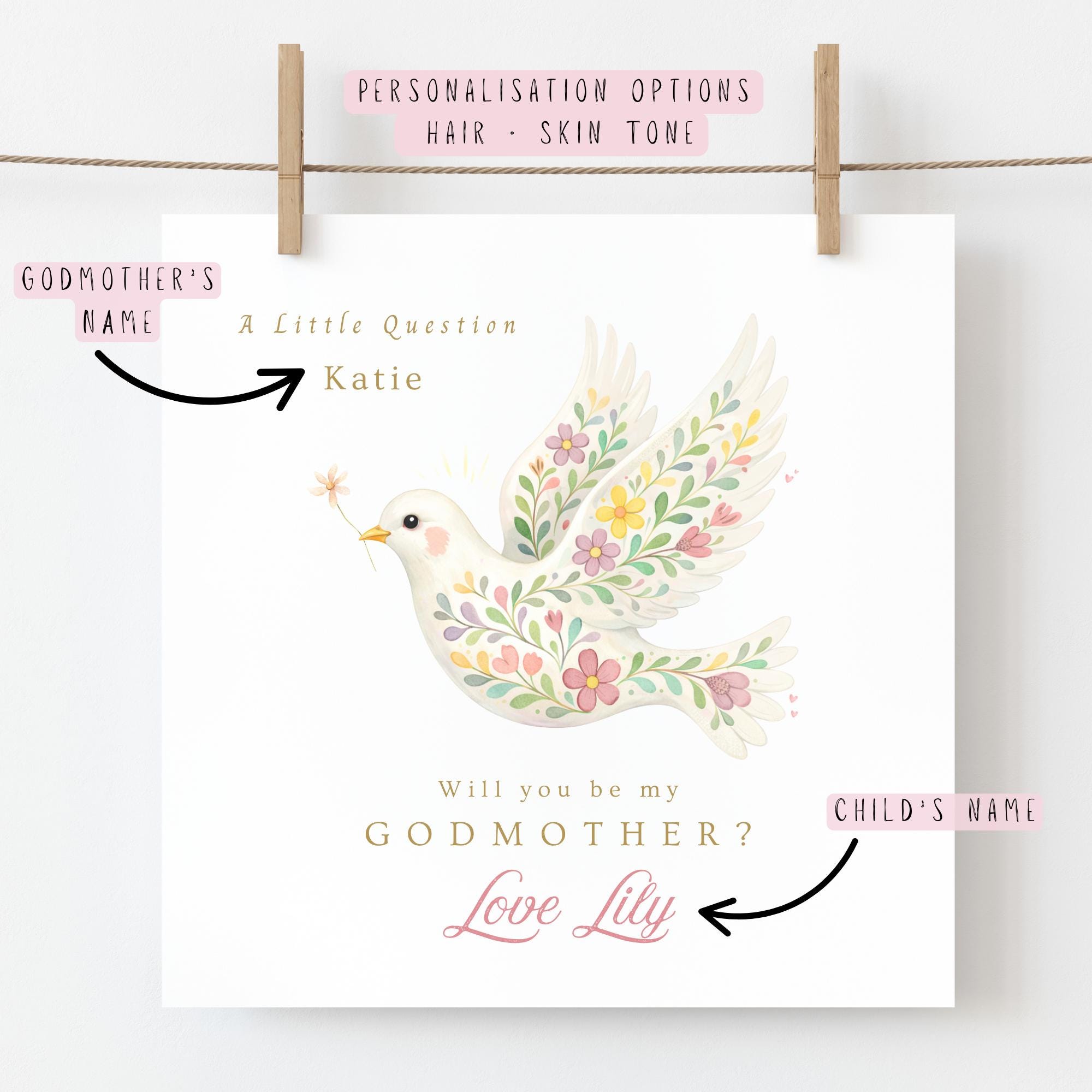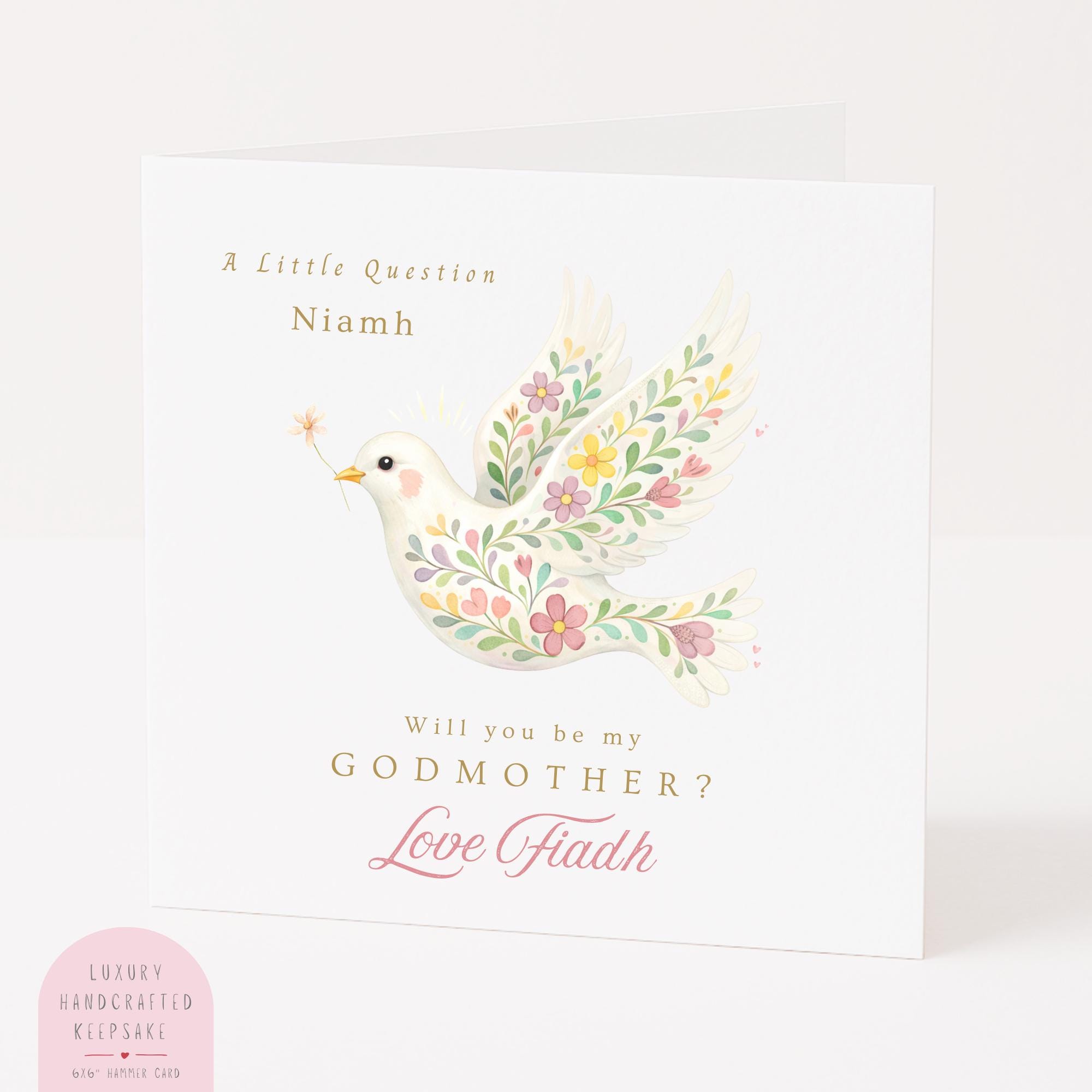 This personalised Godmother proposal card is more than a greeting card. It is a meaningful invitation and a lasting reminder of the special role a Godmother will play in your child’s life.