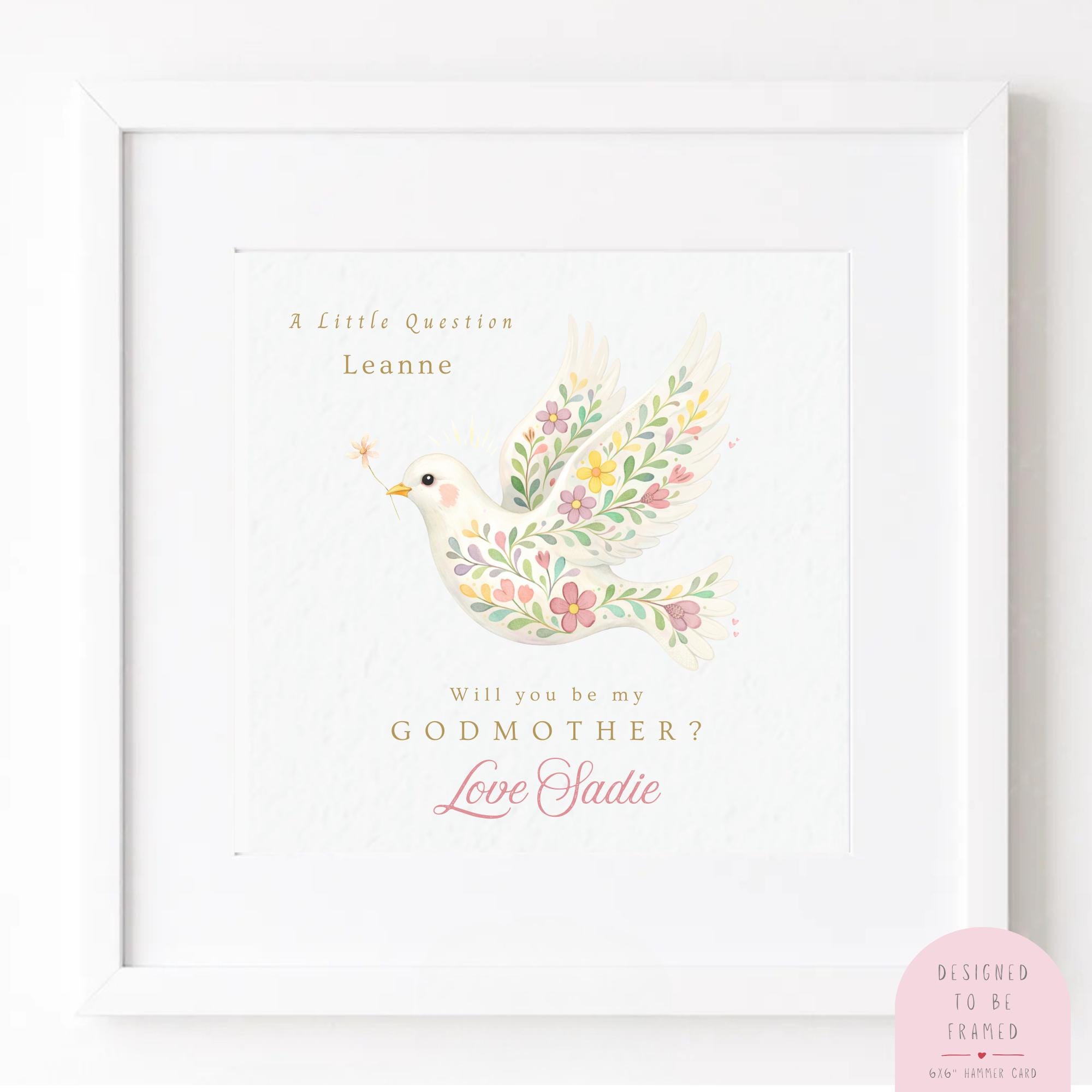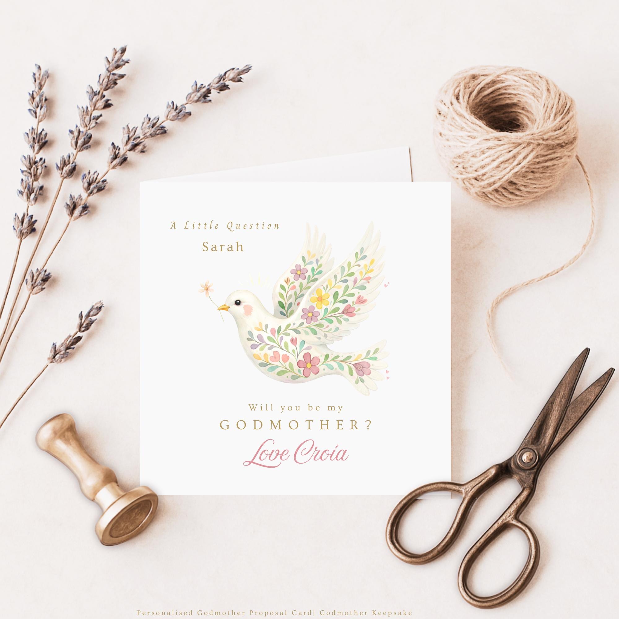 This elegant “Will you be my Godmother?” card features a delicate hand painted watercolour dove adorned with soft florals, symbolising love, peace and faith. Designed in a timeless heirloom style, this Godmother proposal card creates a meaningful keepsake to treasure long after your child’s Baptism or Christening Day.