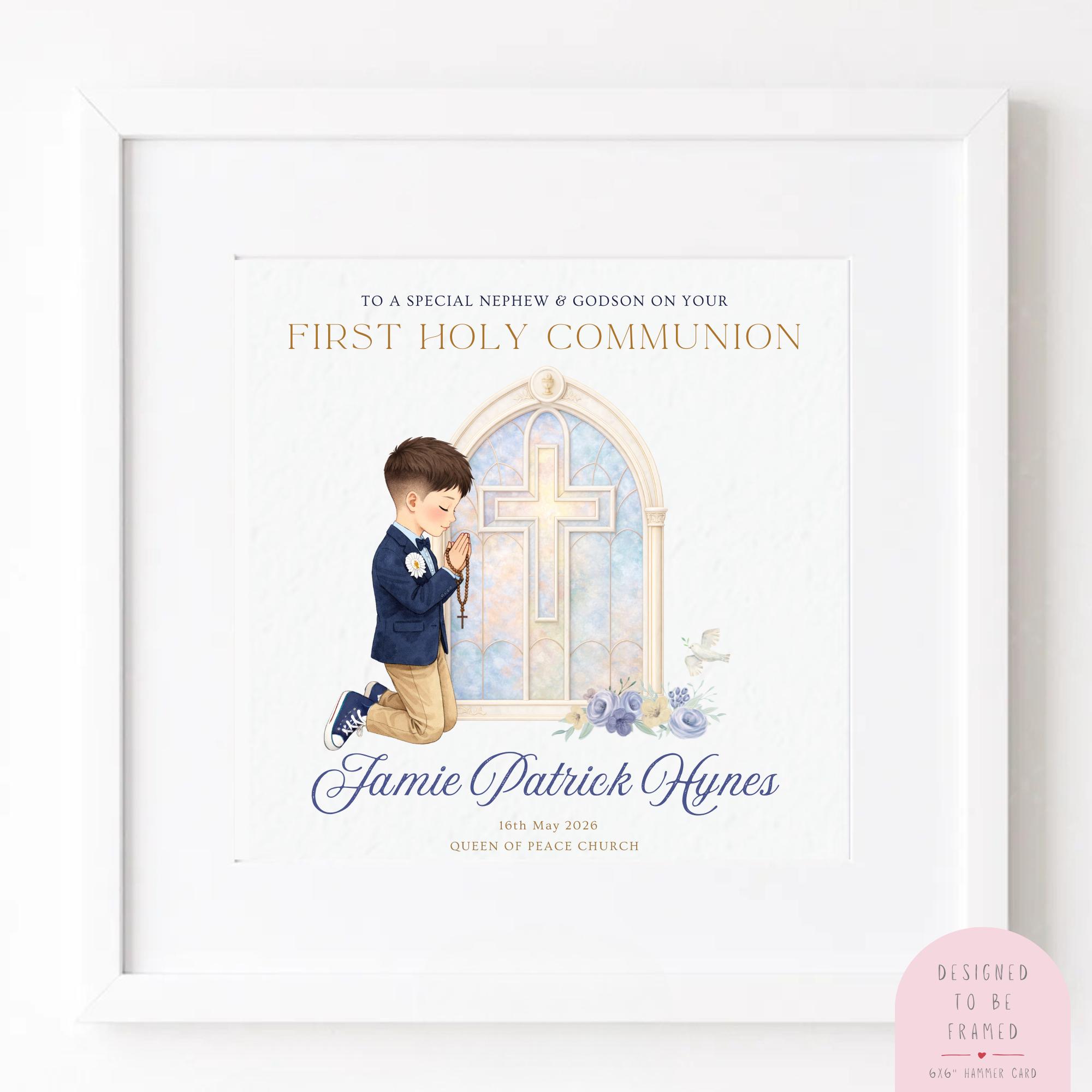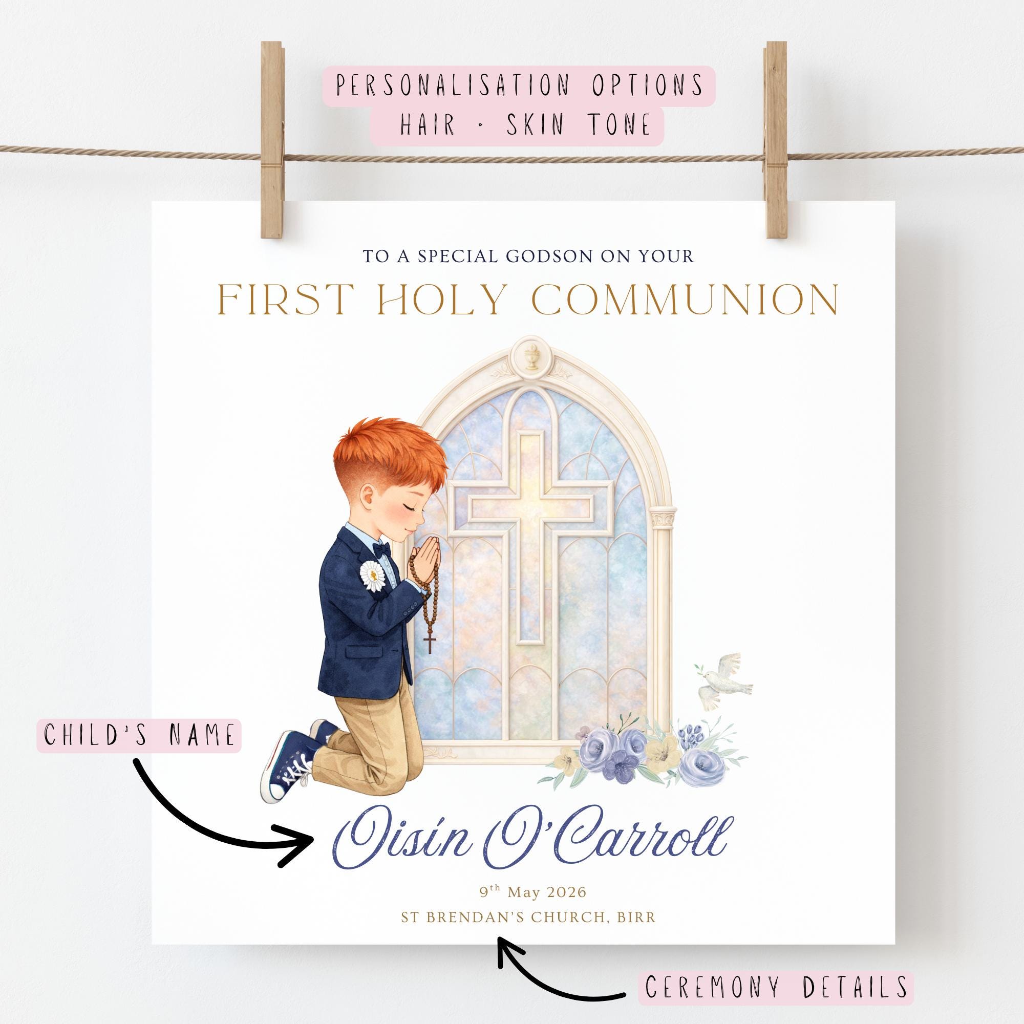 To make the card truly personal, the illustration can be customised with hair colour and skin tone, along with your godson’s name, ceremony date and church details, creating a unique personalised Communion keepsake card for a godson.