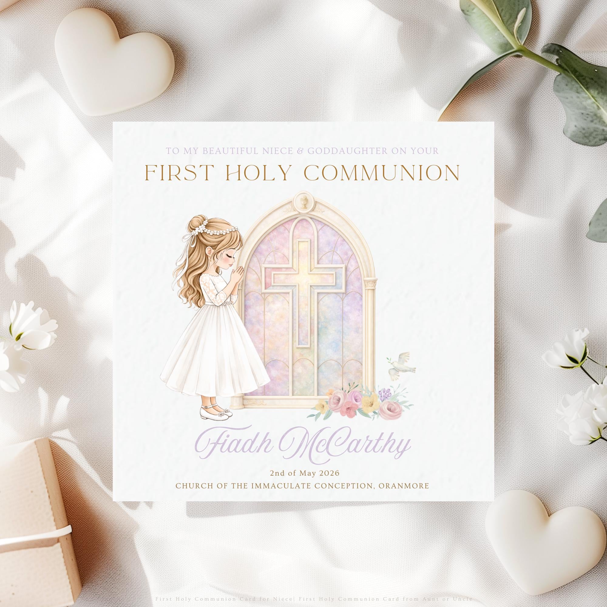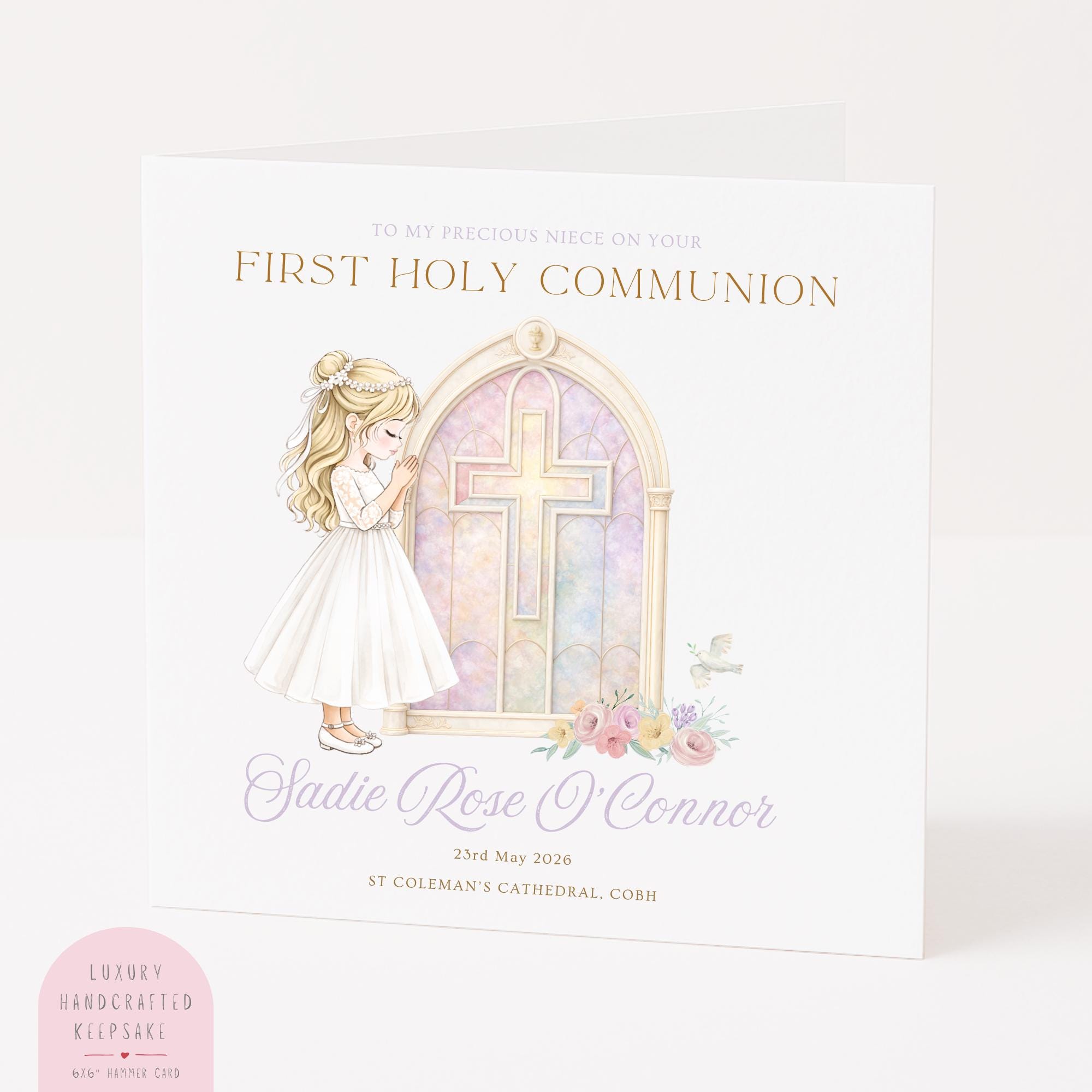 Personalised First Holy Communion Card for Niece from Aunt or Uncle, Catholic Communion Card for Niece, Girls First Communion Keepsake Card with Praying Girl, Church Window Cross, Chalice and Eucharist