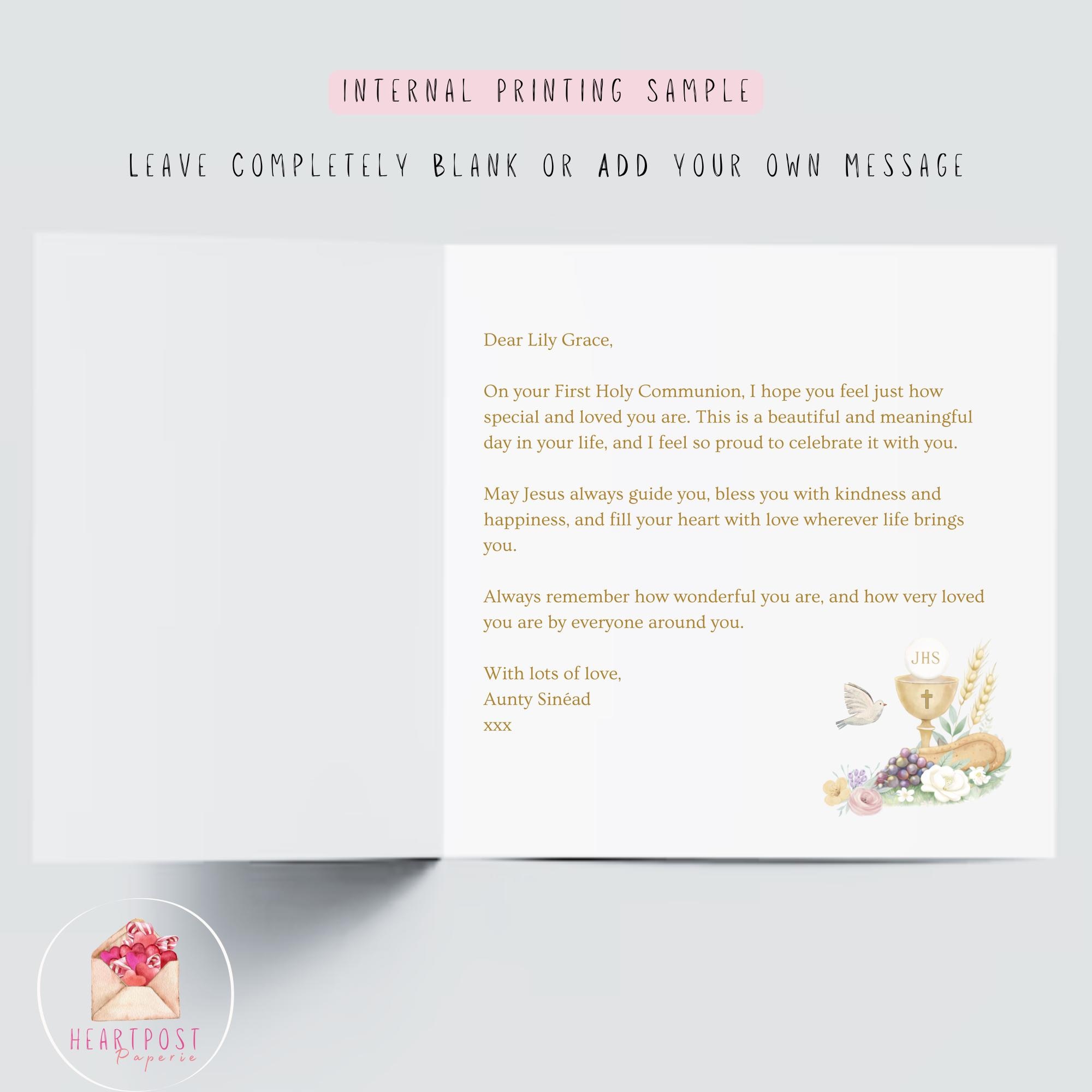 This design is created as a First Holy Communion card for niece from aunt or uncle, making it a thoughtful and meaningful way to celebrate this important Catholic sacrament.