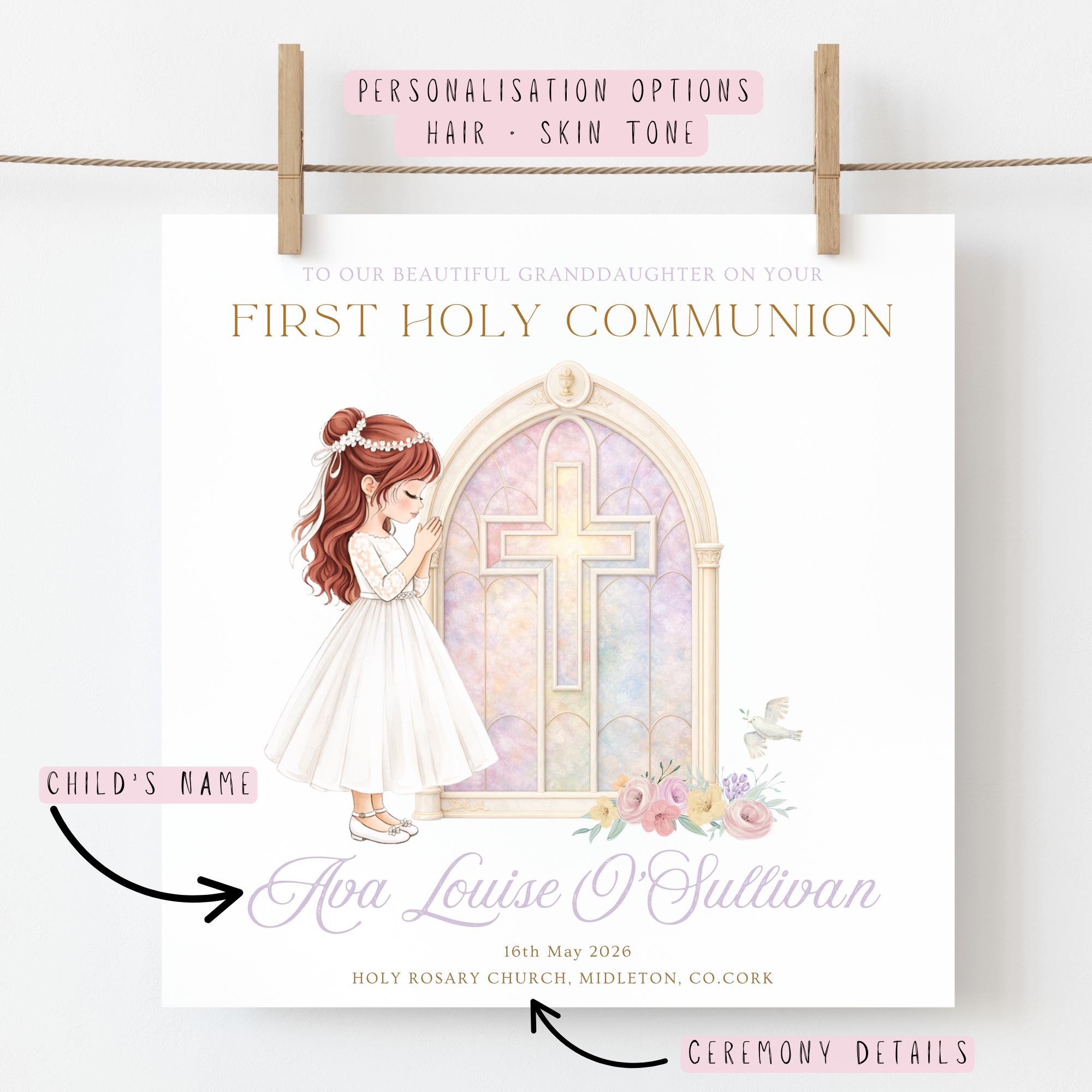 Personalised First Holy Communion Card for Granddaughter from Grandparents, Catholic Communion Card for Granddaughter, Girls First Communion Keepsake Card with Praying Girl, Church Window Cross, Chalice and Eucharist