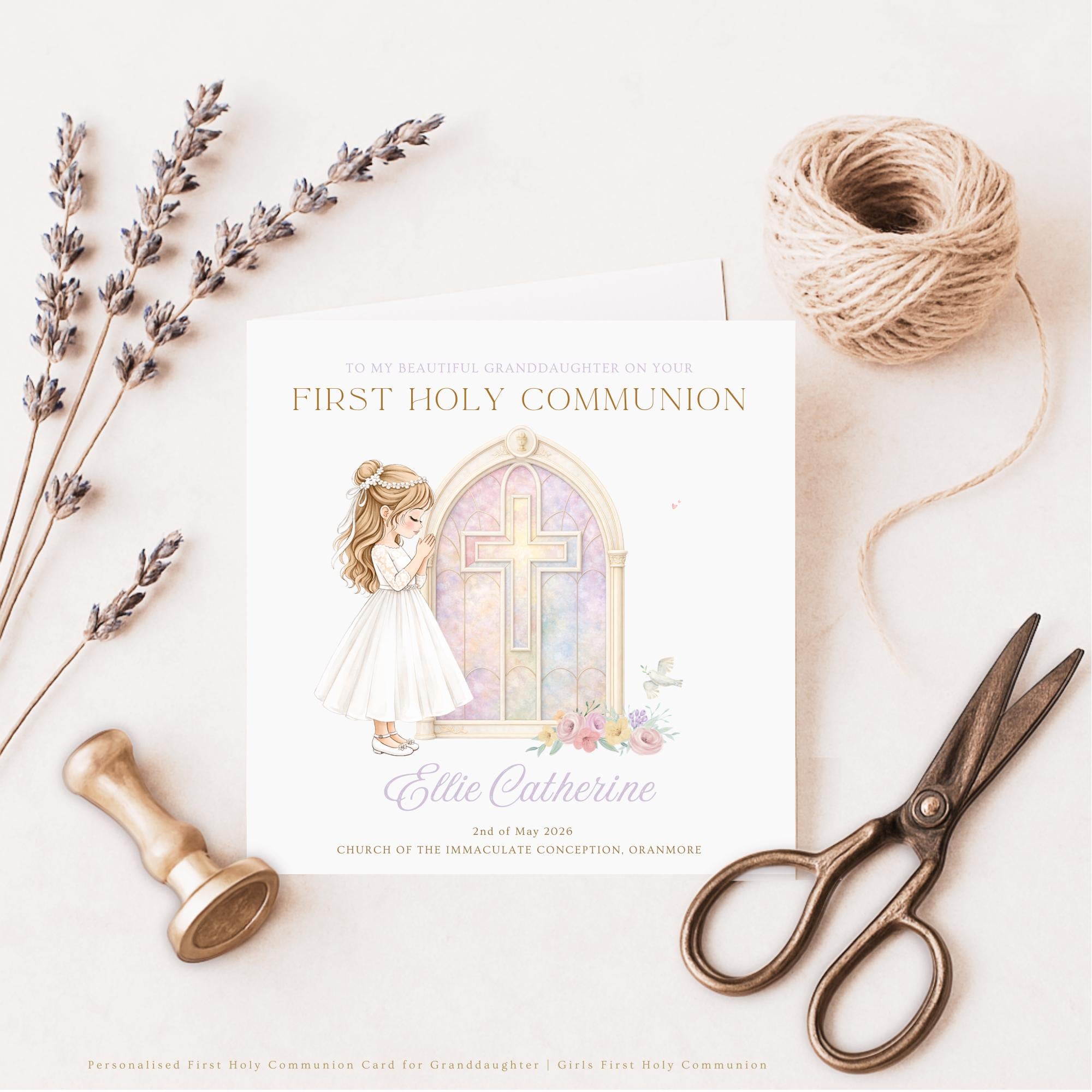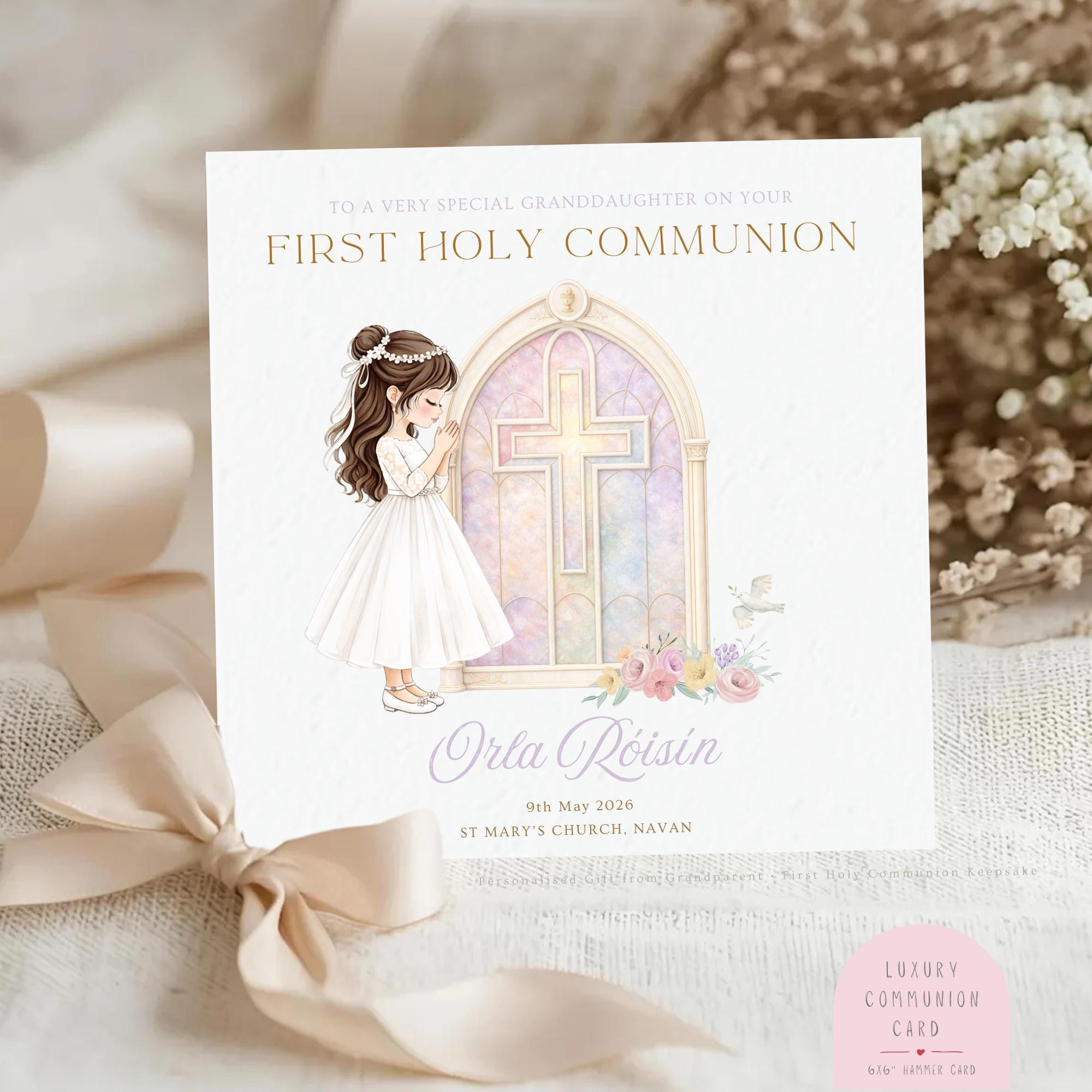 To make the card truly personal, the illustration can be customised with hair colour and skin tone, along with your granddaughter’s name, ceremony date and church details. This creates a unique personalised First Communion keepsake card celebrating your granddaughter’s First Holy Communion day.