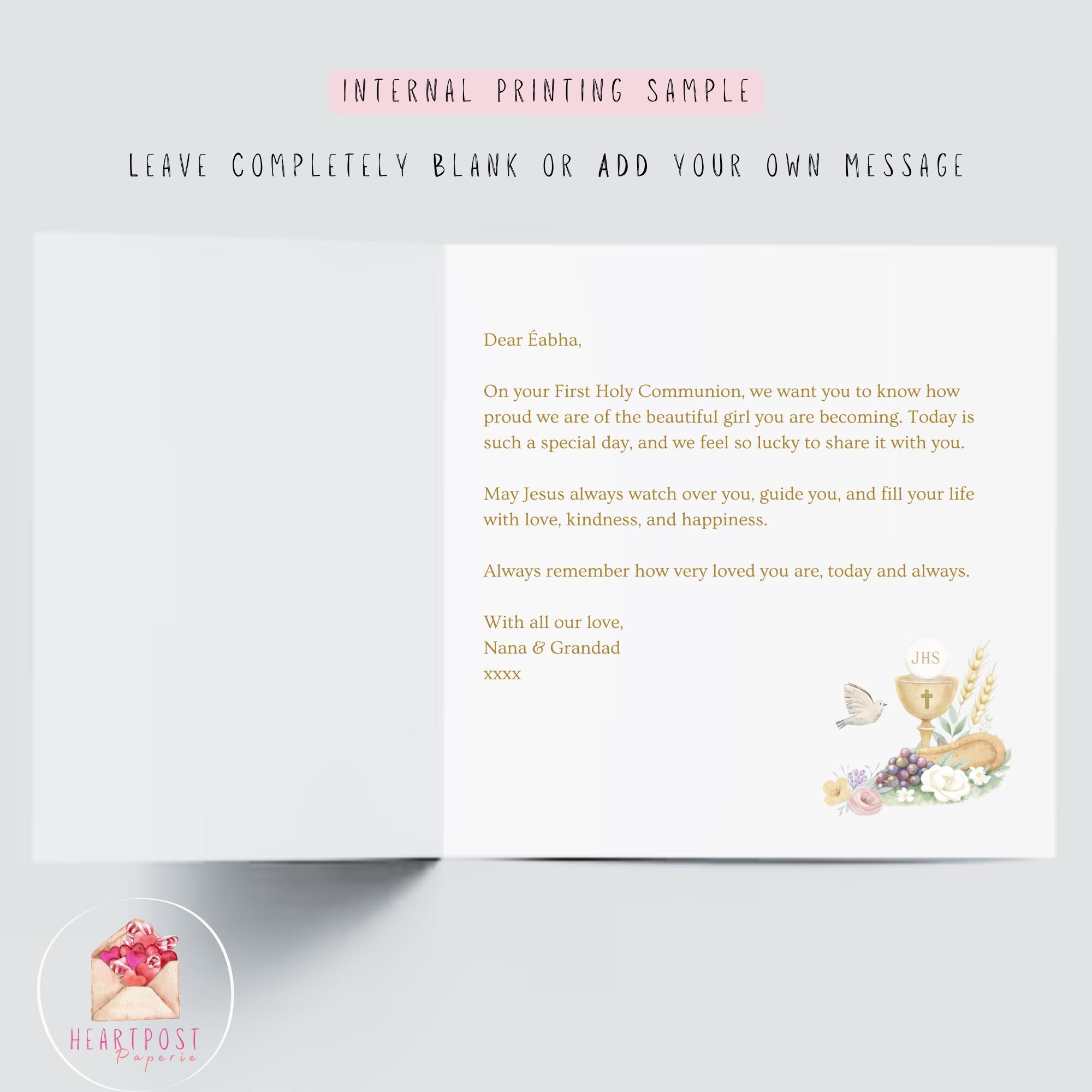 These customisation options allow you to create a truly personal Catholic Communion keepsake card for your granddaughter.